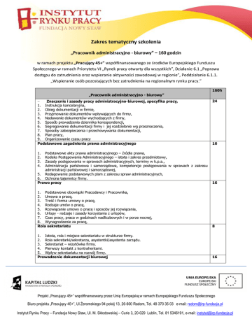 Zakres tematyczny szkolenia „Pracownik administracyjno - biurowy” – 160 godzin w ramach projektu „Pracujący 45+” współfinansowanego ze środków Europejskiego Funduszu Społecznego w ramach Priorytetu VI „Rynek pracy otwarty dla wszystkich”, Działanie 6.1 „Poprawa dostępu do zatrudnienia oraz wspieranie aktywności zawodowej w regionie”, Poddziałanie 6.1.1. „Wspieranie osób pozostających bez zatrudnienia na regionalnym rynku pracy.” 160h „Pracownik administracyjno - biurowy” Znaczenie i zasady pracy administracyjno-biurowej, specyfika pracy, 1. Instrukcja kancelaryjna, 2. Obieg dokumentacji w firmie, 3. Przyjmowanie dokumentów wpływających do firmy, 4. Nadawanie dokumentów wychodzących z firmy, 5. Sposób prowadzenia dziennika korespondencji, 6. Segregowanie dokumentacji firmy i jej rozdzielanie wg przeznaczenia, 7. Sposoby zabezpieczenia i przechowywania dokumentacji, 8. Plan pracy, 9. Organizowanie czasu pracy Podstawowe zagadnienia prawa administracyjnego 24 16 1. 2. 3. 4. Podstawowe akty prawa administracyjnego – źródła prawa, Kodeks Postępowania Administracyjnego – istota i zakres przedmiotowy, Zasady postępowania w sprawach administracyjnych, terminy w k.p.a., Administracja państwowa i samorządowa, kompetencje postępowania w sprawach z zakresu administracji państwowej i samorządowej, 5. Redagowanie podstawowych pism z zakresu spraw administracyjnych, 6. Ochrona tajemnicy firmy. Prawo pracy 16 1. Podstawowe obowiązki Pracodawcy i Pracownika, 2. Umowa o pracę, 3. Treść i forma umowy o pracę, 4. Rodzaje umów o pracę, 5. Rozwiązanie umowy o pracę i sposoby jej rozwiązania, 6. Urlopy - rodzaje i zasady korzystania z urlopów, 7. Czas pracy, praca w godzinach nadliczbowych i w porze nocnej, 8. Wynagrodzenie za pracę, Rola sekretariatu 8 1. Istota, rola i miejsce sekretariatu w strukturze firmy. 2. Rola sekretarki/sekretarza, asystentki/asystenta zarządu. 3. Sekretariat – wizytówka firmy. 4. Pierwszy kontakt z kontrahentami. 5. Wpływ sekretariatu na rozwój firmy. Prowadzenie dokumentacji biurowej 16 Projekt „Pracujący 45+” współfinansowany przez Unię Europejską w ramach Europejskiego Funduszu Społecznego Biuro projektu „Pracujący 45+”, Ul Żeromskiego 94 pokój 13, 26-600 Radom, Tel. 48 370 35 03 e-mail: [email protected] Instytut Rynku Pracy – Fundacja Nowy Staw, Ul. M. Skłodowskiej – Curie 3, 20-029 Lublin, Tel. 81 5346191, e-mail: [email protected] Archiwizacja dokumentów 16 Podział na grupy dokumentów archiwalnych Podstawowe oznaczenia dokumentów archiwalnych (A, B, Bc, Be) Przekazanie akt do archiwum Spis zdawczo-odbiorczy Spis dokumentacji niearchiwalnej przeznaczonej na makulaturę Karta udostępnienia akt sposoby zabezpieczania i przechowywania dokumentacji, zasady archiwizowania dokumentów, ustawowe okresy przechowywania danych, Obsługa kadrowa firmy 16 1. 2. 3. 4. 5. 6. 7. Zasady prowadzenia kadr. Przyjmowanie pracownika. Teczki osobowe – niezbędne dokumenty Skierowania na badania lekarskie (badania wstępne. okresowe) Karty wynagrodzeń pracowników. Rozliczenie pracowników na koniec roku podatkowego Umowy zlecenie i umowy o dzieło – podobieństwa i różnice. obowiązujące stawki. zasady wypisywania. ubezpieczenie wynikające z umów. wymagane oświadczenia. 8. Urlopy - karty urlopowe. 9. Zasiłki - zasady przydzielania i ewidencjonowanie świadczeń. 10. Delegacje. 11. Zwolnienia z pracy – świadectwo pracy. Referencje, świadczenia urlopowe. 12. Prowadzenie akt pracowniczych i pozostałej ewidencji Zasady ubezpieczeń społecznych 8 1. omówienie zasad prawnych w zakresie ubezpieczeń społecznych i zdrowotnych, 2. omówienie zasady wypełniania dokumentów ubezpieczeniowych: deklaracje zgłoszeniowe, deklaracje rozliczeniowe, 3. ubezpieczenia społeczne : ubezpieczenia emerytalne i ubezpieczenia rentowe, 4. ubezpieczenia zdrowotne, 5. składki na ubezpieczenia społeczne, zdrowotne oraz na Fundusz Pracowniczy i Fundusz Gwarantowanych Świadczeń Pracowniczych, kwoty, terminy i sposoby uiszczania opłat, przelew bankowy i opłata gotówkowa 6. Zakładowy Fundusz Świadczeń Socjalnych. Obsługa narad i konferencji 8 Profesjonalna obsługa klienta 24 4. 1. Pierwszy kontakt z klientem. wytworzenie optymalnych relacji sprzedawca - klient, nawiązanie kontaktu z klientem bez zadawania pytań, (poczucie autonomii klienta), emocjonalne pozyskanie klienta, instruktaż i ćwiczenia przeżyciowe (symulacja). 2. Diagnozowanie potrzeb klienta i jego system wartości. 3. Technika argumentacji. Dialog właściwy i techniki reagowania na zastrzeżenia. Projekt „Pracujący 45+” współfinansowany przez Unię Europejską w ramach Europejskiego Funduszu Społecznego Biuro projektu „Pracujący 45+”, Ul Żeromskiego 94 pokój 13, 26-600 Radom, Tel. 48 370 35 03 e-mail: [email protected] Instytut Rynku Pracy – Fundacja Nowy Staw, Ul. M. Skłodowskiej – Curie 3, 20-029 Lublin, Tel. 81 5346191, e-mail: [email protected] Nauka obsługi urządzeń biurowych 1. 2. 3. 4. 5. 8 Telefax. Automatyczna sekretarka. Wewnętrzne systemy łączności - centrala telefoniczna. Kserokopiarka. Oprawianie dokumentacji - termobindownica i bindownica. Projekt „Pracujący 45+” współfinansowany przez Unię Europejską w ramach Europejskiego Funduszu Społecznego Biuro projektu „Pracujący 45+”, Ul Żeromskiego 94 pokój 13, 26-600 Radom, Tel. 48 370 35 03 e-mail: [email protected] Instytut Rynku Pracy – Fundacja Nowy Staw, Ul. M. Skłodowskiej – Curie 3, 20-029 Lublin, Tel. 81 5346191, e-mail: [email protected]