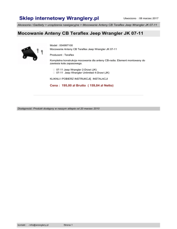 Sklep internetowy Wranglery.pl Utworzono : 08 marzec 2017 Akcesoria i Gadżety > urządzenia nawigacyjne > Mocowanie Anteny CB Teraflex Jeep Wrangler JK 07-11 Mocowanie Anteny CB Teraflex Jeep Wrangler JK 07-11 Model : 004997100 Mocowanie Anteny CB Teraflex Jeep Wrangler JK 07-11 Producent : Teraflex Kompletna konstrukcja mocowania dla anteny CB-radia. Element montowany do zawiesia koła zapasowego. � 07-11 Jeep Wrangler 2-Drzwi (JK) � 07-11 Jeep Wrangler Unlimited 4-Drzwi (JK) KLIKNIJ I POBIERZ INSTRUKCJĘ INSTALACJI Cena : 195,00 zł Brutto ( 159,84 zł Netto) Dostępność: Produkt dostępny w naszym sklepie od 20 marzec 2010 kontakt : - [email protected] Strona 1