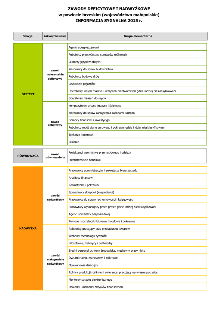 ZAWODY DEFICYTOWE I NADWYŻKOWE w powiecie brzeskim (województwo małopolskie) INFORMACJA SYGNALNA 2015 r. Sekcja Grupa elementarna Zaklasyfikowanie Agenci ubezpieczeniowi Robotnicy przetwórstwa surowców roślinnych Lektorzy języków obcych zawód maksymalnie deficytowy Kierownicy do spraw budownictwa Robotnicy budowy dróg Czyściciele pojazdów Operatorzy innych maszyn i urządzeń przetwórczych gdzie indziej niesklasyfikowani DEFICYT Operatorzy maszyn do szycia Kompozytorzy, artyści muzycy i śpiewacy Kierownicy do spraw zarządzania zasobami ludzkimi zawód deficytowy Doradcy finansowi i inwestycyjni Robotnicy robót stanu surowego i pokrewni gdzie indziej niesklasyfikowani Tynkarze i pokrewni Szklarze RÓWNOWAGA zawód zrównoważony Projektanci wzornictwa przemysłowego i odzieży Przedstawiciele handlowi Pracownicy administracyjni i sekretarze biura zarządu Analitycy finansowi Kosmetyczki i pokrewni zawód nadwyżkowy Sprzedawcy sklepowi (ekspedienci) Pracownicy do spraw rachunkowości i księgowości Pracownicy wykonujący prace proste gdzie indziej niesklasyfikowani Agenci sprzedaży bezpośredniej Pomoce i sprzątaczki biurowe, hotelowe i pokrewne NADWYŻKA Robotnicy pracujący przy przeładunku towarów Technicy technologii żywności Filozofowie, historycy i politolodzy Średni personel ochrony środowiska, medycyny pracy i bhp zawód maksymalnie nadwyżkowy Dyżurni ruchu, manewrowi i pokrewni Opiekunowie dziecięcy Rolnicy produkcji roślinnej i zwierzęcej pracujący na własne potrzeby Monterzy sprzętu elektronicznego Dealerzy i maklerzy aktywów finansowych