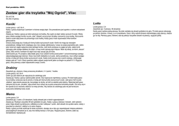 Kod produktu: 4605. Zestaw gier dla trzylatka "Mój Ogród", Vilac Gry od 3 lat. Gry dla 2-4 graczy. Koniki Lotto Liczba graczy – od 2 do 4. Każdy z graczy dysponuje 2 pionkami w kolorze swojej stajni. Gra prowadzona jest zgodnie z ruchem wskazówek zegara. Zasady gry: Każdy z graczy po kolei wykonuje rzut kostką. Aby wyjść ze stajni należy wyrzucić 6 oczek. Wtedy gracz stawia swojego konika na polu „start” (départ) oznaczonym strzałką i ponownie rzuca kostką. Wyrzucenie sześciu oczek daje prawo do ponownego rzutu kostką. Każdy gracz może wyprowadzić kilka koników jednocześnie. Gracze przesuwają się o liczbę pól równą liczbie wyrzuconych oczek. Koniki nie mogą się nawzajem przeskakiwać, dlatego konik znajdujący się z tyłu zostaje zablokowany i wraca na swoje poprzednie pole. Jedno pole może być zajęte wyłącznie przez jednego konika. Jeśli konik przybywa na zajęte już pole, wtedy konik zajmujący pole zostaje odesłany do stajni, a nowy konik zajmuje jego miejsce. Mówi się wtedy, że konik „skacze”. Gracz, który wrócił z konikiem do stajni musi więc zacząć grę od nowa. Zakończenie gry: Po przejściu całej kolejki gracz musi ustawić konika przed polem 1 ponumerowanego szeregu odpowiadającego jego kolorowi. Gracz musi trafić dokładnie na to pole. Jeśli je przekroczy, musi cofnąć swojego konika o liczbę pól równą liczbie wyrzuconych oczek. Każdy konik posuwa się w swoim szeregu, zdobywając kolejno pola od 1 do 6. Gracz powinien zatem ustawić swoje koniki jeden za drugim na polach 6 i 5. Wygrywa gracz, który pierwszy ustawi odpowiednio swoje 2 koniki. Liczba graczy: 2-4 Zawartość gry: 4 plansze, 48 obrazków Każdy gracz wybiera jedną planszę. Na stole rozkłada się obrazki grzbietem do góry. Po kolei gracze odwracają po jednym obrazku i mówią, co on przedstawia. Gracz, który wybrał obrazek odpowiadający jego planszy, kładzie go na niej. Pierwszy gracz, któremu uda się położyć wszystkie obrazki na planszy, wygrywa partię. Drabiny Zawartość gry: plansza z trasą oznaczoną strzałkami, 2- 4 pionki, 1 kostka Liczba graczy: od 2 do 4 Celem gry jest dotarcie jak najszybciej do ostatniego pola Zasady gry: Każdy z graczy wybiera jeden pionek. Grę rozpoczyna najmłodszy z graczy. Po kolei każdy gracz rzuca kostką i przesuwa się do przodu o liczbę pól równą liczbie wyrzuconych oczek. Jeśli gracz trafi na pole „drabina”, jego pionek posuwa się, korzystając ze skrótu, aż trafi na ostatnie pole drabiny. Natomiast jeśli gracz zatrzyma się na polu „strzałka”, jego pionek musi cofnąć się na pole oznaczone końcówką strzałki. Gra toczy się w ten sposób aż do momentu dotarcia na metę (arrivée). Aby dotrzeć do ostatniego pola nie jest konieczne wyrzucenie dokładnej liczby oczek. Memo Liczba graczy: 2-4 Zawartość gry: 2 serie z 24 obrazkami, każdy obrazek jest w dwóch egzemplarzach Zasady gry: Rozłożyć wszystkie 48 kart grzbietem do góry. Każdy z graczy odwraca 2 obrazki. Jeśli wybrane przez niego obrazki są identyczne, odkłada je na bok i zdobywa 1 punkt. Jeśli obrazki nie są takie same, należy z powrotem je odwrócić i odłożyć w to samo miejsce. Każdy z graczy po kolei wykonuje te same czynności, starając się w toku gry zapamiętywać miejsce położenia poszczególnych obrazków po to, aby móc łatwiej tworzyć z nich pary. Wygrywa gracz, któremu udało się skompletować najwięcej par.