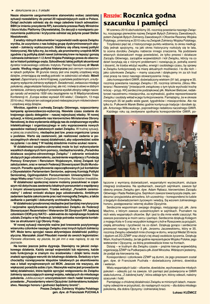 dokończenie ze s. II okładki Nasze obszernie uargumentowane stanowisko wobec zaistniałej sytuacji rozesłaliśmy do ponad 20 najważniejszych osób w Polsce. Dotąd zechciało odnieść się do niego zaledwie trzech adresatów: BBN (w imieniu prezydenta RP), kancelaria prezesa Rady Ministrów i biuro klubu Platformy Obywatelskiej. Do decyzji o rozwiązaniu porozumienia publicznie i krytycznie odniósł się jedynie poseł Stefan Niesiołowski. Z analizy różnych dokumentów i wypowiedzi osób spoza Związku wynika, że uczyniono z nas kolejną grupę dyskryminowanych obywateli – żołnierzy wykluczonych. Staliśmy się ofiarą nowej polityki historycznej. Nie tylko my, bo młody, ale prominentny urzędnik MON zgodnie z tą polityką dzieli nawet żołnierską krew na lepszą i gorszą i odmawia żołnierzom 1 i 2 Armii Wojska Polskiego prawa do obecności w historii polskiego oręża. Szkodliwość takiej polityki akcentował dyrektor krakowskiego oddziału Instytutu Pamięci Narodowej dr Marek Lasota. Według niego polityka historyczna jest cennym narzędziem w rękach polityków. W gruncie rzeczy jest ona zwykłą urzędową wizją dziejów, zmieniającą się według potrzeb i w zależności od władz. Mówił wprost: Zapominamy o Armii Krajowej, o państwie podziemnym, a kultywujemy wyłącznie żołnierzy wyklętych. Świadomość, zwłaszcza młodego pokolenia, ulega ekstazie historycznej, ale mit, i mówię to słowo w dobrym kontekście, żołnierzy wyklętych przesłania wysiłek zbrojny całego naszego narodu od września 1939 roku (wystąpienie na III Międzynarodowej Konferencji nt. „Europa wobec wyzwań XXI wieku”, Oświęcim, 13 maja 2016 roku). Historyk ten ostrzegał przed niebezpiecznym mitotwórstwem i urzędową wizją dziejów. Wkrótce, zgodnie z uchwałą Zarządu Głównego, rozpoczniemy kampanię sprawozdawczo-wyborczą. Niewiele czasu zostanie do krajowego zjazdu delegatów – naszej najwyższej władzy. W nowej sytuacji, w której postawiło nas kierownictwo Ministerstwa Obrony Narodowej, te dwa wydarzenia obligują nas do zwiększonego wysiłku intelektualnego i organizacyjnego w celu wypracowania nowych sposobów realizacji statutowych zadań Związku. W trudnej sytuacji, w jakiej się znaleźliśmy, niezbędna jest tzw. praca organiczna i praca u podstaw. Warto się zastanowić, jak realizować zadania w poszczególnych sferach naszej działalności, aby odpowiedzieć sobie na pytanie: i co dalej ? W każdej dziedzinie można szukać rezerw. W działalności socjalno-zdrowotnej może to być wykorzystanie wszelkich dostępnych form pomocy, niezbędna korekta „Poradnika działacza socjalno-zdrowotnego Związku” i zebranie wniosków służących jego udoskonaleniu, zacieśnienie współpracy z Fundacją Pomocy Emerytom i Rencistom Wojskowym, której Związek był założycielem, oraz w ramach Federacji Stowarzyszeń Służb Mundurowych. Ponadto spożytkowanie zapoczątkowanych już kontaktów z Obywatelskim Parlamentem Seniorów, sejmową Komisją Polityki Senioralnej, Ogólnopolskim Porozumieniem Uniwersytetów Trzeciego Wieku oraz Polskim Związkiem Emerytów, Rencistów i Inwalidów. W działalności społecznej rezerw możemy poszukiwać w częstszym niż dotychczas zawieraniu lokalnych porozumień o współpracy z innymi stowarzyszeniami. Trzeba wdrożyć „Poradnik ceremonialny” i zebrać wnioski służące jego udoskonaleniu. Ambitnym zadaniem będzie zakończenie prac nad monografią Związku, a także zadbanie o pamiątki i dokumenty archiwalne Związku. W działalności proobronnej niezbędne jest bardziej merytoryczne i racjonalne spożytkowanie przynależności Związku do Federacji Stowarzyszeń Rezerwistów i Weteranów Sił Zbrojnych RP, będącej członkiem CIOR przy NATO – adekwatnie do największego liczebnie udziału Związku w tej Federacji. Istnieje potrzeba rozwijania kontaktów ze strukturami Ligi Obrony Kraju. W nowej sytuacji niezwykle ważne jest kreowanie pozytywnego wizerunku członków naszego Związku oraz innych byłych żołnierzy WP. Może temu sprzyjać nasza aktywniejsza działalność publicystyczna. Marszałek Józef Piłsudski mawiał do swoich legionistów: Panowie oficerowie, wy piszcie, bo jak inni o was napiszą, to się nie poznacie. Na koniec jeszcze jedna dygresja. Stawiajmy na jakość związkowego działania. Każdy zarząd wojewódzki lub rejonowy, każde koło funkcjonuje w znanym mu środowisku i dzięki temu może znaleźć sprzyjające warunki do lokalnego działania. Świadczy o tym chociażby rozwiązywanie kłopotów lokalowych po eksmitowaniu nas z lokali wynajmowanych od MON. Jeszcze nie wszyscy, ale większość poradziła sobie z tym. Niezwykle ważne jest prowadzenie takiej działalności, która będzie sprzyjać wstępowaniu do Związku żołnierzy opuszczających szeregi wojska, należących do młodszego pokolenia. Jubileuszowym uroczystościom niech nadal towarzyszy przesłanie: „Pozostaniemy wierni Ojczyźnie i żołnierskiemu koleżeństwu. Naszego honoru i godności będziemy bronić”. Prezes Związku Żołnierzy Wojska Polskiego gen. dyw. dr Franciszek PUCHAŁA Rzeszów: Rocznica godna szacunku i pamięci W czerwcu 2016 obchodziliśmy 35. rocznicę powstania naszego Związku, noszącego pierwotnie nazwę Związek Byłych Żołnierzy Zawodowych, potem Związek Byłych Żołnierzy Zawodowych i Oficerów Rezerwy Wojska Polskiego, zmienioną w 2010 roku na Związek Żołnierzy Wojska Polskiego. Trzydzieści pięć lat, z historycznego punktu widzenia, to okres niedługi. Gdy jednak spojrzymy, na jaki okres historyczny rozłożyły się te lata, to ocena dorobku Związku nabierze innego znaczenia. Na podstawie własnych doświadczeń mogę powiedzieć, że tylko prezesi i działacze Zarządu Głównego, zarządów wojewódzkich i kół Związku, którzy na co dzień borykają się z różnymi problemami i rozwiązują je, potrafią ocenić i docenić, ile trzeba włożyć wy