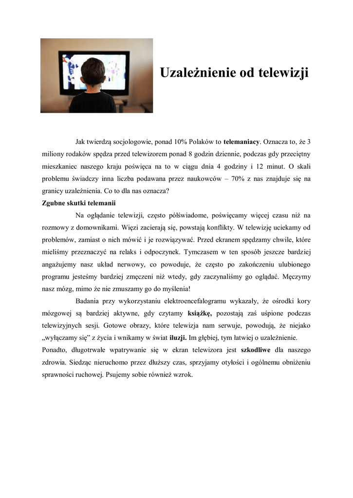Uzależnienie od telewizji Jak twierdzą socjologowie, ponad 10% Polaków to telemaniacy. Oznacza to, że 3 miliony rodaków spędza przed telewizorem ponad 8 godzin dziennie, podczas gdy przeciętny mieszkaniec naszego kraju poświęca na to w ciągu dnia 4 godziny i 12 minut. O skali problemu świadczy inna liczba podawana przez naukowców – 70% z nas znajduje się na granicy uzależnienia. Co to dla nas oznacza? Zgubne skutki telemanii Na oglądanie telewizji, często półświadome, poświęcamy więcej czasu niż na rozmowy z domownikami. Więzi zacierają się, powstają konflikty. W telewizję uciekamy od problemów, zamiast o nich mówić i je rozwiązywać. Przed ekranem spędzamy chwile, które mieliśmy przeznaczyć na relaks i odpoczynek. Tymczasem w ten sposób jeszcze bardziej angażujemy nasz układ nerwowy, co powoduje, że często po zakończeniu ulubionego programu jesteśmy bardziej zmęczeni niż wtedy, gdy zaczynaliśmy go oglądać. Męczymy nasz mózg, mimo że nie zmuszamy go do myślenia! Badania przy wykorzystaniu elektroencefalogramu wykazały, że ośrodki kory mózgowej są bardziej aktywne, gdy czytamy książkę, pozostają zaś uśpione podczas telewizyjnych sesji. Gotowe obrazy, które telewizja nam serwuje, powodują, że niejako „wyłączamy się” z życia i wnikamy w świat iluzji. Im głębiej, tym łatwiej o uzależnienie. Ponadto, długotrwałe wpatrywanie się w ekran telewizora jest szkodliwe dla naszego zdrowia. Siedząc nieruchomo przez dłuższy czas, sprzyjamy otyłości i ogólnemu obniżeniu sprawności ruchowej. Psujemy sobie również wzrok.