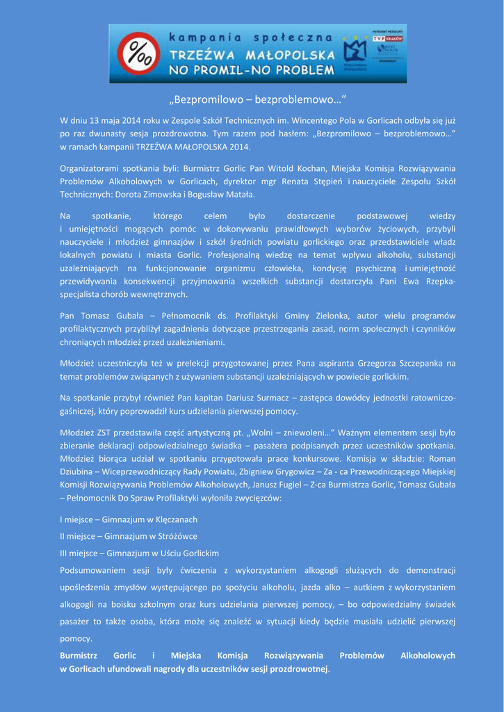 „Bezpromilowo – bezproblemowo…” W dniu 13 maja 2014 roku w Zespole Szkół Technicznych im. Wincentego Pola w Gorlicach odbyła się już po raz dwunasty sesja prozdrowotna. Tym razem pod hasłem: „Bezpromilowo – bezproblemowo…” w ramach kampanii TRZEŹWA MAŁOPOLSKA 2014. Organizatorami spotkania byli: Burmistrz Gorlic Pan Witold Kochan, Miejska Komisja Rozwiązywania Problemów Alkoholowych w Gorlicach, dyrektor mgr Renata Stępień i nauczyciele Zespołu Szkół Technicznych: Dorota Zimowska i Bogusław Matała. Na spotkanie, którego celem było dostarczenie podstawowej wiedzy i umiejętności mogących pomóc w dokonywaniu prawidłowych wyborów życiowych, przybyli nauczyciele i młodzież gimnazjów i szkół średnich powiatu gorlickiego oraz przedstawiciele władz lokalnych powiatu i miasta Gorlic. Profesjonalną wiedzę na temat wpływu alkoholu, substancji uzależniających na funkcjonowanie organizmu człowieka, kondycję psychiczną i umiejętność przewidywania konsekwencji przyjmowania wszelkich substancji dostarczyła Pani Ewa Rzepkaspecjalista chorób wewnętrznych. Pan Tomasz Gubała – Pełnomocnik ds. Profilaktyki Gminy Zielonka, autor wielu programów profilaktycznych przybliżył zagadnienia dotyczące przestrzegania zasad, norm społecznych i czynników chroniących młodzież przed uzależnieniami. Młodzież uczestniczyła też w prelekcji przygotowanej przez Pana aspiranta Grzegorza Szczepanka na temat problemów związanych z używaniem substancji uzależniających w powiecie gorlickim. Na spotkanie przybył również Pan kapitan Dariusz Surmacz – zastępca dowódcy jednostki ratowniczogaśniczej, który poprowadził kurs udzielania pierwszej pomocy. Młodzież ZST przedstawiła część artystyczną pt. „Wolni – zniewoleni…” Ważnym elementem sesji było zbieranie deklaracji odpowiedzialnego świadka – pasażera podpisanych przez uczestników spotkania. Młodzież biorąca udział w spotkaniu przygotowała prace konkursowe. Komisja w składzie: Roman Dziubina – Wiceprzewodniczący Rady Powiatu, Zbigniew Grygowicz – Za - ca Przewodniczącego Miejskiej Komisji Rozwiązywania Problemów Alkoholowych, Janusz Fugiel – Z-ca Burmistrza Gorlic, Tomasz Gubała – Pełnomocnik Do Spraw Profilaktyki wyłoniła zwycięzców: I miejsce – Gimnazjum w Klęczanach II miejsce – Gimnazjum w Stróżówce III miejsce – Gimnazjum w Uściu Gorlickim Podsumowaniem sesji były ćwiczenia z wykorzystaniem alkogogli służących do demonstracji upośledzenia zmysłów występującego po spożyciu alkoholu, jazda alko – autkiem z wykorzystaniem alkogogli na boisku szkolnym oraz kurs udzielania pierwszej pomocy, – bo odpowiedzialny świadek pasażer to także osoba, która może się znaleźć w sytuacji kiedy będzie musiała udzielić pierwszej pomocy. Burmistrz Gorlic i Miejska Komisja Rozwiązywania w Gorlicach ufundowali nagrody dla uczestników sesji prozdrowotnej. Problemów Alkoholowych