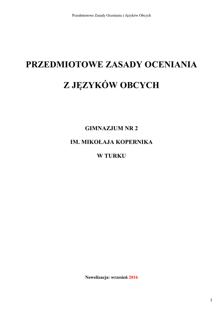 Przedmiotowe Zasady Oceniania z Języków Obcych PRZEDMIOTOWE ZASADY OCENIANIA Z JĘZYKÓW OBCYCH GIMNAZJUM NR 2 IM. MIKOŁAJA KOPERNIKA W TURKU Nowelizacja: wrzesień 2016 1 Przedmiotowe Zasady Oceniania z Języków Obcych I. WSTĘP 1) Ogólne cele zajęć edukacyjnych z języka obcego: a) osiągnięcie poziomu opanowania języka zapewniającego w miarę sprawną komunikację językową, b) lepsze poznanie kultury i spraw życia codziennego kraju języka nauczanego. 2) Wymienione cele zawierają się w pojęciach: a) kompetencja językowa - rozumiana jako wiedza o regułach tworzenia ze znanych wyrazów wypowiedzi gramatycznie poprawnych, b) kompetencja komunikacyjna-rozumiana jako umiejętność skutecznego i poprawnego komunikowania się zgodnie z regułami kompetencji językowej, a ponadto zgodnie z normami użycia w wypowiedziach takich środków językowych, które jednocześnie: dokładnie oddają intencje mówiącego, odpowiadają sytuacji komunikowania się, uwzględniają warunki społeczne osób komunikujących się c) kompetencja kulturowa-rozumiana jako wiedza o wytworach kultury materialnej i duchowej, o wybitnych postaciach, a także wiedza o różnych realiach, normach i zachowaniach jednostek i grup społecznych. 3) W procesie nauczania-uczenia się języka obcego ocenianiu podlegają praca i postępy ucznia, a nie stan wiedzy. 4) Przedmiotowe Zasady Oceniania (PZO) jest zgodny z Wewnątrzszkolnym Systemem Oceniania (WSO) i stanowi załącznik do Statutu Szkoły. II. SPOSOBY I CELE OCENIANIA W nauczaniu języka obcego uczniowie podlegają ocenianiu bieżącemu, śródrocznemu oraz rocznemu. 1) Ocenianie bieżące: a) dostarcza informacji o rozwoju ucznia, jego aktywności i osiągnięciach w zakresie nauczanego języka w ciągupółrocza, b) pomaga uczniowi rozpoznać i zrozumieć swoje mocne i słabe strony oraz daje mu jasne wskazówki nad czym powinien więcej popracować, c) pozwala przekazać rodzicom lub opiekunom informację o postępach dziecka, a także wskazać sposoby poprawy ewentualnych braków, d) daje nauczycielowi informację zwrotną na temat efektywności jego nauczania, prawidłowości doboru metod i technik pracy z uczniem. 2) Ocenianie okresowe (roczne): a) podsumowuje rozwój ucznia, jego aktywność pod koniec półrocza lub roku szkolnego, b) przekazuje uczniowi, rodzicom (opiekunom) i nauczycielowi obraz postępów w nauczanym języku po dłuższym okresie realizacji programu nauczania. III. SKALA OCEN 1) a) b) c) d) e) f) Oceny bieżące i oceny klasyfikacyjne śródroczne i roczne ustala się w stopniach według skali: stopień celujący – 6, stopień bardzo dobry – 5, stopień dobry – 4 stopień dostateczny – 3, stopień dopuszczający – 2, stopień niedostateczny – 1. 2) 3) a) b) Dopuszcza się przy stopniach cząstkowych stosowanie znaku (+). Oceny wyrażone w stopniach dzielą się na: cząstkowe, określające poziom osiągnięć edukacyjnych ucznia ze zrealizowanej części programu nauczania; śródroczne, określające poziom osiągnięć edukacyjnych ucznia przewidzianych w programie nauczania na Ipółrocze roku szkolnego; 2 Przedmiotowe Zasady Oceniania z Języków Obcych c) 4) 5) 6) roczne, określające poziom osiągnięć edukacyjnych przewidzianych na dany rok szkolny. Stopnie śródroczne i roczne nie mogą być ustalane jako średnia arytmetyczna stopni cząstkowych. Stopień ustala nauczyciel uczący danego przedmiotu. Liczba stopni, będących podstawą do wystawienia oceny śródrocznej lub rocznej, nie może być mniejsza niż cztery, także wtedy jeśli frekwencja ucznia na danych zajęciach nie przekracza 50% obecności. W przypadku sprawdzianów i prac klasowych działowych ustala się następujące zasady otrzymywania stopni: 0 – 35% pkt. – niedostateczny 36 – 37% pkt. – niedostateczny + 38 – 52% pkt. – dopuszczający 53 – 54% pkt. – dopuszczający + 55 – 70% pkt. – dostateczny 71 – 72% pkt. – dostateczny + 73 – 88% pkt. – dobry 89 - 90% pkt. – dobry + 91 – 99% pkt. – bardzo dobry 100% pkt.- celujący 6) Ocenianie uczniów z orzeczeniami PPP . Nauczyciel jest zobowiązany, na podstawie pisemnej opinii poradni psychologiczno – pedagogicznej lub innej poradni specjalistycznej, dostosować wymagania edukacyjne w stosunku do indywidualnych psychofizycznych i edukacyjnych potrzeb ucznia, u którego stwierdzono specyficzne trudności w uczeniu się lub deficyty rozwojowe, uniemożliwiające sprostanie wymaganiom edukacyjnym wynikającym z programu nauczania. 7) Oceny bieżące oraz śródroczne i roczne klasyfikacyjne z zajęć edukacyjnych dla uczniów z upośledzeniem umysłowym w stopniu umiarkowanym lub znacznym są ocenami opisowymi. 8) Stopień ustala nauczyciel uczący danego przedmiotu. 9) Laureaci konkursów przedmiotowych o zasięgu wojewódzkim oraz laureaci i finaliści olimpiad przedmiotowych w gimnazjach otrzymują z danych zajęć edukacyjnych celującą roczną ocenę klasyfikacyjną, a w przypadku zajęć edukacyjnych, których realizacja zakończyła się w klasie programowo niższej - celującą końcową ocenę klasyfikacyjną z tych zajęć. 10) Dyrektor szkoły na wniosek rodziców (prawnych opiekunów) oraz na podstawie opinii poradni psychologicznopedagogicznej zwalnia ucznia z wadą słuchu lub głęboką dysleksją rozwojową z nauki drugiego języka obcego. 11a)W przypadku zwolnienia ucznia z nauki drugiego języka obcego w dokumentacji przebiegu nauczania zamiast oceny klasyfikacyjnej wpisuje się „zwolniony”. IV. OBSZARY AKTYWNOŚCI UCZNIÓW PODLEGAJĄCE OCENIANIU 1) Sprawności językowe: a) rozumienie ze słuchu: rozumienie poleceń nauczyciela, rozumienie treści i informacji; b) mówienie: wypowiedzi dialogowe (nawiązanie rozmowy, podtrzymywanie rozmowy, komunikacja), wypowiedzi monologowe (reproduktywne i produktywne, wyrażanie własnego zdania, uczuć i emocji), recytacja (opowiadanie tekstu, poprawność wymowy i intonacji, ekspresja), p