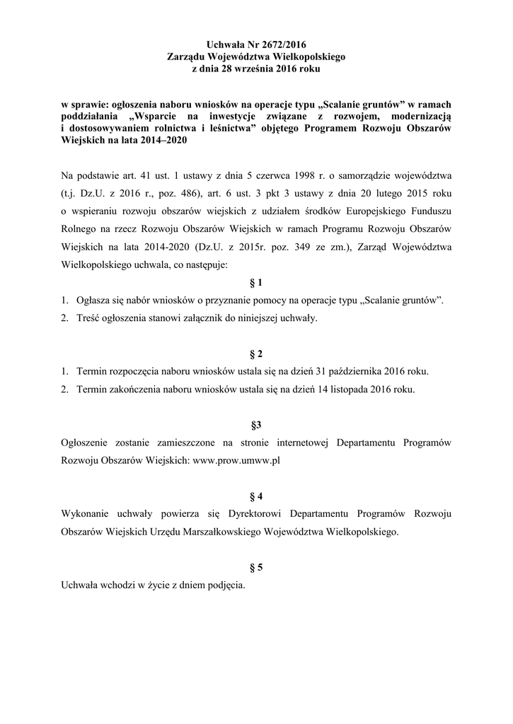 Uchwała Nr 2672/2016 Zarządu Województwa Wielkopolskiego z dnia 28 września 2016 roku w sprawie: ogłoszenia naboru wniosków na operacje typu „Scalanie gruntów” w ramach poddziałania „Wsparcie na inwestycje związane z rozwojem, modernizacją i dostosowywaniem rolnictwa i leśnictwa” objętego Programem Rozwoju Obszarów Wiejskich na lata 2014–2020 Na podstawie art. 41 ust. 1 ustawy z dnia 5 czerwca 1998 r. o samorządzie województwa (t.j. Dz.U. z 2016 r., poz. 486), art. 6 ust. 3 pkt 3 ustawy z dnia 20 lutego 2015 roku o wspieraniu rozwoju obszarów wiejskich z udziałem środków Europejskiego Funduszu Rolnego na rzecz Rozwoju Obszarów Wiejskich w ramach Programu Rozwoju Obszarów Wiejskich na lata 2014-2020 (Dz.U. z 2015r. poz. 349 ze zm.), Zarząd Województwa Wielkopolskiego uchwala, co następuje: §1 1. Ogłasza się nabór wniosków o przyznanie pomocy na operacje typu „Scalanie gruntów”. 2. Treść ogłoszenia stanowi załącznik do niniejszej uchwały. §2 1. Termin rozpoczęcia naboru wniosków ustala się na dzień 31 października 2016 roku. 2. Termin zakończenia naboru wniosków ustala się na dzień 14 listopada 2016 roku. §3 Ogłoszenie zostanie zamieszczone na stronie internetowej Departamentu Programów Rozwoju Obszarów Wiejskich: www.prow.umww.pl §4 Wykonanie uchwały powierza się Dyrektorowi Departamentu Programów Rozwoju Obszarów Wiejskich Urzędu Marszałkowskiego Województwa Wielkopolskiego. §5 Uchwała wchodzi w życie z dniem podjęcia. Uzasadnienie do uchwały Nr 2672/2016 Zarządu Województwa Wielkopolskiego z dnia 28 września 2016 roku w sprawie: ogłoszenia naboru wniosków na operacje typu „Scalanie gruntów” w ramach poddziałania „Wsparcie na inwestycje związane z rozwojem, modernizacją i dostosowywaniem rolnictwa i leśnictwa” objętego Programem Rozwoju Obszarów Wiejskich na lata 2014–2020 Zgodnie z § 9 Rozporządzenia Ministra Rolnictwa i Rozwoju Wsi z dnia 10 grudnia 2015 roku w sprawie szczegółowych warunków i trybu przyznawania oraz wypłaty pomocy finansowej na operacje typu „Scalanie gruntów” w ramach poddziałania „Wsparcie na inwestycje związane z rozwojem, modernizacją i dostosowywaniem rolnictwa i leśnictwa” objętego Programem Rozwoju Obszarów Wiejskich na lata 2014-2020 (Dz.U. 2015 poz. 2180), właściwy organ samorządu województwa podaje do publicznej wiadomości na stronie internetowej urzędu marszałkowskiego oraz w urzędzie marszałkowskim, ogłoszenie o naborze wniosków o przyznanie pomocy nie później niż 30 dni przed dniem planowanego terminu rozpoczęcia składania wniosków. Ogłoszenie, o którym mowa winno zawierać wskazanie dnia rozpoczęcia i dnia zakończenia terminu składania wniosków o przyznanie pomocy, które nie może być krótsze niż 14 i dłuższe niż 60 dni. Mając powyższe na uwadze przyjęcie niniejszej uchwały jest uzasadnione.