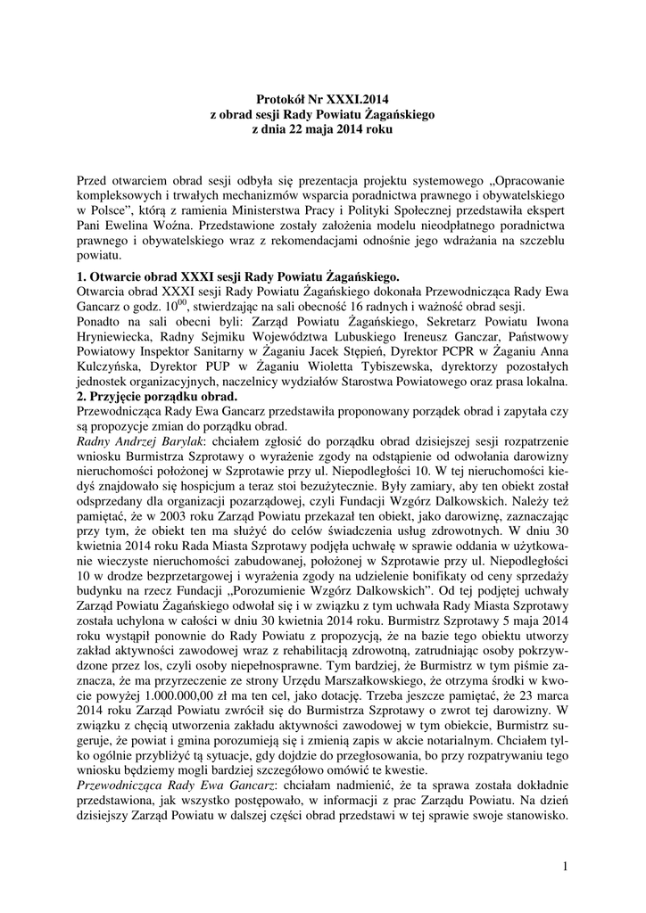 Protokół Nr XXXI.2014 z obrad sesji Rady Powiatu Żagańskiego z dnia 22 maja 2014 roku Przed otwarciem obrad sesji odbyła się prezentacja projektu systemowego „Opracowanie kompleksowych i trwałych mechanizmów wsparcia poradnictwa prawnego i obywatelskiego w Polsce”, którą z ramienia Ministerstwa Pracy i Polityki Społecznej przedstawiła ekspert Pani Ewelina Woźna. Przedstawione zostały założenia modelu nieodpłatnego poradnictwa prawnego i obywatelskiego wraz z rekomendacjami odnośnie jego wdrażania na szczeblu powiatu. 1. Otwarcie obrad XXXI sesji Rady Powiatu Żagańskiego. Otwarcia obrad XXXI sesji Rady Powiatu Żagańskiego dokonała Przewodnicząca Rady Ewa Gancarz o godz. 1000, stwierdzając na sali obecność 16 radnych i ważność obrad sesji. Ponadto na sali obecni byli: Zarząd Powiatu Żagańskiego, Sekretarz Powiatu Iwona Hryniewiecka, Radny Sejmiku Województwa Lubuskiego Ireneusz Ganczar, Państwowy Powiatowy Inspektor Sanitarny w Żaganiu Jacek Stępień, Dyrektor PCPR w Żaganiu Anna Kulczyńska, Dyrektor PUP w Żaganiu Wioletta Tybiszewska, dyrektorzy pozostałych jednostek organizacyjnych, naczelnicy wydziałów Starostwa Powiatowego oraz prasa lokalna. 2. Przyjęcie porządku obrad. Przewodnicząca Rady Ewa Gancarz przedstawiła proponowany porządek obrad i zapytała czy są propozycje zmian do porządku obrad. Radny Andrzej Barylak: chciałem zgłosić do porządku obrad dzisiejszej sesji rozpatrzenie wniosku Burmistrza Szprotawy o wyrażenie zgody na odstąpienie od odwołania darowizny nieruchomości położonej w Szprotawie przy ul. Niepodległości 10. W tej nieruchomości kiedyś znajdowało się hospicjum a teraz stoi bezużytecznie. Były zamiary, aby ten obiekt został odsprzedany dla organizacji pozarządowej, czyli Fundacji Wzgórz Dalkowskich. Należy też pamiętać, że w 2003 roku Zarząd Powiatu przekazał ten obiekt, jako darowiznę, zaznaczając przy tym, że obiekt ten ma służyć do celów świadczenia usług zdrowotnych. W dniu 30 kwietnia 2014 roku Rada Miasta Szprotawy podjęła uchwałę w sprawie oddania w użytkowanie wieczyste nieruchomości zabudowanej, położonej w Szprotawie przy ul. Niepodległości 10 w drodze bezprzetargowej i wyrażenia zgody na udzielenie bonifikaty od ceny sprzedaży budynku na rzecz Fundacji „Porozumienie Wzgórz Dalkowskich”. Od tej podjętej uchwały Zarząd Powiatu Żagańskiego odwołał się i w związku z tym uchwała Rady Miasta Szprotawy została uchylona w całości w dniu 30 kwietnia 2014 roku. Burmistrz Szprotawy 5 maja 2014 roku wystąpił ponownie do Rady Powiatu z propozycją, że na bazie tego obiektu utworzy zakład aktywności zawodowej wraz z rehabilitacją zdrowotną, zatrudniając osoby pokrzywdzone przez los, czyli osoby niepełnosprawne. Tym bardziej, że Burmistrz w tym piśmie zaznacza, że ma przyrzeczenie ze strony Urzędu Marszałkowskiego, że otrzyma środki w kwocie powyżej 1.000.000,00 zł ma ten cel, jako dotację. Trzeba jeszcze pamiętać, że 23 marca 2014 roku Zarząd Powiatu zwrócił się do Burmistrza Szprotawy o zwrot tej darowizny. W związku z chęcią utworzenia zakładu aktywności zawodowej w tym obiekcie, Burmistrz sugeruje, że powiat i gmina porozumieją się i zmienią zapis w akcie notarialnym. Chciałem tylko ogólnie przybliżyć tą sytuacje, gdy dojdzie do przegłosowania, bo przy rozpatrywaniu tego wniosku będziemy mogli bardziej szczegółowo omówić te kwestie. Przewodnicząca Rady Ewa Gancarz: chciałam nadmienić, że ta sprawa została dokładnie przedstawiona, jak wszystko postępowało, w informacji z prac Zarządu Powiatu. Na dzień dzisiejszy Zarząd Powiatu w dalszej części obrad przedstawi w tej sprawie swoje stanowisko. 1 Teraz poproszę Radcę Prawnego o zabranie głosu, czy my, jako Rada Powiatu mamy prawo w tej sprawie decydować. Radca Prawny Halina Miszczuk: sprawa przedmiotowej nieruchomości jest sprawą Zarządu Powiatu. W dalszych obradach sesji można będzie ten problem omówić. W pkt. Oświadczenia będzie przedstawione stanowisko Zarządu Powiatu i propozycja, co do stanowiska Rady Powiatu. Dlatego wnioskodawca powinien oświadczyć, czy w dalszym ciągu podtrzymuje ten wniosek do wprowadzenia do porządku obrad, skoro ten problem na dzisiejszej sesji będzie omawiany. Ponadto chciałam powiedzieć, że sam wniosek Burmistrza Szprotawy, podpisany przez mecenasa, o odwołanie darowizny skierowany do Rady Powiatu nie może być rozpatrywany, dlatego, że darowizna została już odwołana. Zarząd Powiatu był zobowiązany, z mocy przepisów ustawy o gospodarce nieruchomościami, do odwołania darowizny, co też uczynił. Burmistrz Szprotawy, w wyznaczonym przez Zarząd Powiatu terminie, nie przystąpił do aktu notarialnego i oświadczył, że aktu nie podpisze. Taki jest w tej chwili stan prawny, natomiast odstąpienie od odwołania darowizny w pierwszej kolejności mogłoby być rozpatrywane tylko wtedy, kiedy nie nastąpiłoby odwołania darowizny. W chwili obecnej taki wniosek jest już bezprzedmiotowy, bo jest po terminie i to jest jedna przyczyna. Druga przyczyna jest taka, że wniosek powinien być skierowany do Zarządu. Zarząd powinien wniosek przeanalizować i przedłożyć pod obrady Rady Powiatu. Taka możliwość byłaby tylko wtedy, gdyby nie dokonano odwołania darowizny. W tej chwili jest taka sytuacja, że darowizna została odwołana, do czego Zarząd był zobowiązany, bo w dacie, kiedy uchwała Rady Miasta Szprotawy została podjęta a treść tej uchwały była mniej więcej taka, że wyraża się zgodę na sprzedaż nieruchomości o wartości 700.000,00 zł za 1% wartości, czyli za 6.999,98 zł, powstał po stronie Zarządu Powiatu obowiązek odwołania darowizny i czynności dokonane w terminie późniejszym, a mianowicie stwierdzenie przez Wojewodę nieważności trzech paragrafów w uchwale Rady Miasta Szprotawy, jak również uchylenie tej uchwały przez Burmistrza Szprotawy w d