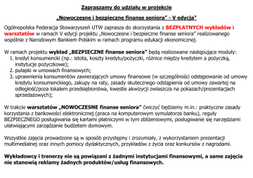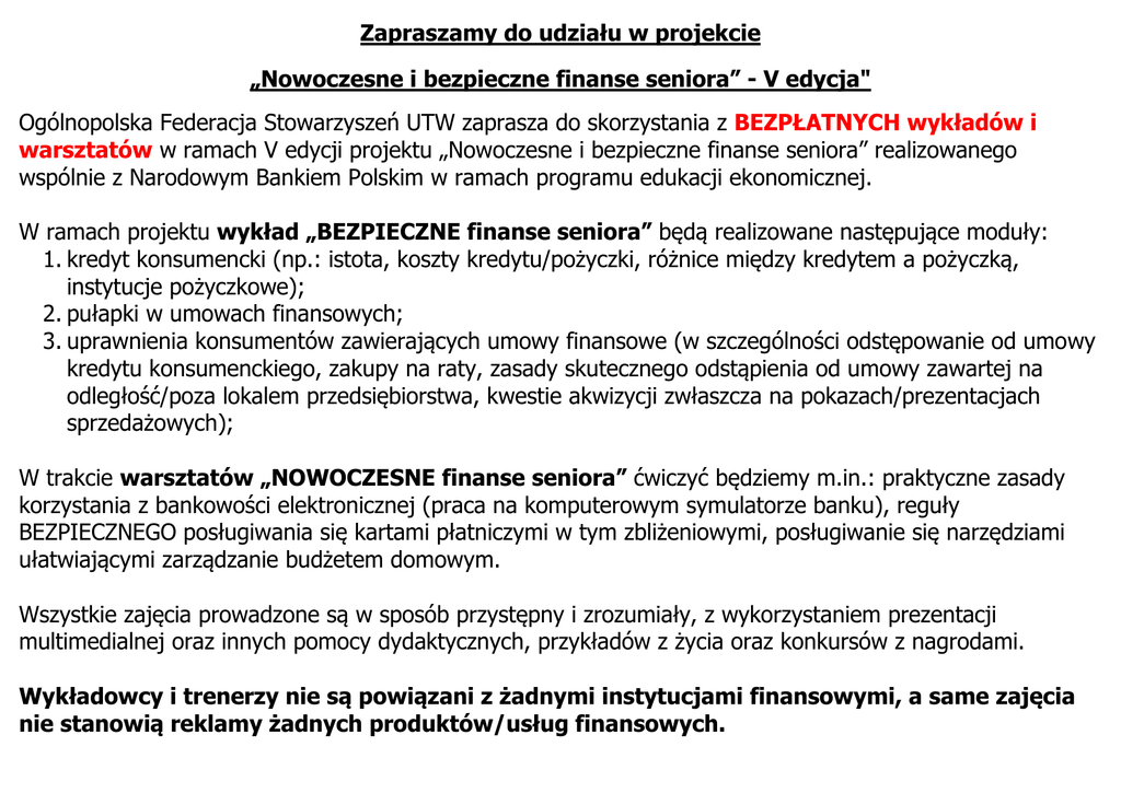 Zapraszamy do udziału w projekcie „Nowoczesne i bezpieczne finanse seniora” - V edycja" Ogólnopolska Federacja Stowarzyszeń UTW zaprasza do skorzystania z BEZPŁATNYCH wykładów i warsztatów w ramach V edycji projektu „Nowoczesne i bezpieczne finanse seniora” realizowanego wspólnie z Narodowym Bankiem Polskim w ramach programu edukacji ekonomicznej. W ramach projektu wykład „BEZPIECZNE finanse seniora” będą realizowane następujące moduły: 1. kredyt konsumencki (np.: istota, koszty kredytu/pożyczki, różnice między kredytem a pożyczką, instytucje pożyczkowe); 2. pułapki w umowach finansowych; 3. uprawnienia konsumentów zawierających umowy finansowe (w szczególności odstępowanie od umowy kredytu konsumenckiego, zakupy na raty, zasady skutecznego odstąpienia od umowy zawartej na odległość/poza lokalem przedsiębiorstwa, kwestie akwizycji zwłaszcza na pokazach/prezentacjach sprzedażowych); W trakcie warsztatów „NOWOCZESNE finanse seniora” ćwiczyć będziemy m.in.: praktyczne zasady korzystania z bankowości elektronicznej (praca na komputerowym symulatorze banku), reguły BEZPIECZNEGO posługiwania się kartami płatniczymi w tym zbliżeniowymi, posługiwanie się narzędziami ułatwiającymi zarządzanie budżetem domowym. Wszystkie zajęcia prowadzone są w sposób przystępny i zrozumiały, z wykorzystaniem prezentacji multimedialnej oraz innych pomocy dydaktycznych, przykładów z życia oraz konkursów z nagrodami. Wykładowcy i trenerzy nie są powiązani z żadnymi instytucjami finansowymi, a same zajęcia nie stanowią reklamy żadnych produktów/usług finansowych.