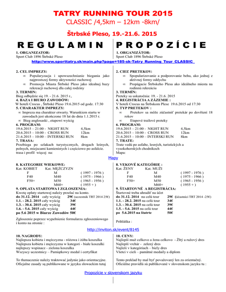 TATRY RUNNING TOUR 2015 CLASSIC /4,5km – 12km -8km/ Štrbské Pleso, 19.-21.6. 2015 REGULAMIN PROPOZÍCIE 1. ORGANIZATOR: 1. ORGANIZÁTOR: Sport Club 1896 Štrbské Pleso Sport Club 1896 Štrbské Pleso http://www.sporttatry.sk/main.php?page=185-sk-Tatry_Running_Tour_CLASSIC_ 2. CEL IMPREZY: • Popularyzacja i upowszechnianie biegania jako najprostszej formy aktywności ruchowej • Promocja Miasta Štrbské Pleso jako idealnej bazy rekreacji ruchowej dla całej rodziny 3. TERMIN: Bieg odbędzie się 19. - 21.6. 2015 r., 4. BAZA I BIURO ZAWODÓW: W hoteli Crocus , Štrbské Pleso 19.6.2015 od godz. 17:30 5. CHARAKTER IMPREZY: • Impreza ma charakter otwarty. Warunkiem startu w zawodach jest ukończone 18 lat do dnia 1.1.2015 r. • Bieg anglosaski , etapowi wyścig 6. PROGRAM: 19.6.2015 – 21:00 - NIGHT RUN 4,5km 20.6.2015 – 10:00 - CROSS RUN 12km 21.6.2015 – 10:00 – INTERSKI RUN 8km 7. TRASA: Przebiega po szlakach turystycznych, drogach leśnych, polnych, miejscami kamienistych i częściowo po asfalcie. trasa i profil więcej na: 2. CIEĽ PRETEKOV: • Spopularizovanie a podporovanie behu, ako jednej z aktívnej formy oddychu • Propágacie Štrbskeho Plesa ako ideálneho miesta na rodinnú rekreáciu 3. TERMÍN: Preteky sa uskutočnia: 19. - 21.6. 2015 4. REGISTRÁCIA A ZÁZEMIE : V hoteli Crocus na Štrbskom Plese 19.6.2015 od 17:30 5. TYP PRETEKOV : • Pretekov sa môže zúčastniť pretekár po dovŕšení 18 rokov • Etapové trailové preteky 6. PROGRAM: 19.6.2015 – 21:00 - NIGHT RUN 4,5km 20.6.2015 – 10:00 - CROSS RUN 12km 21.6.2015 – 10:00 – INTERSKI RUN 8km 7. TRATE: Trate vedú po asfalte, lesných, turistických a vysokohorských chodníkoch Mapa: Mapy 8. KATEGORIE WIEKOWE: Kat. KOBIET Kat. MĘŻCZYZN F M ( 1997 - 1976 ) F40 M40 ( 1975 - 1966 ) F50+ M50 ( 1965 - 1956 ) M60+ ( 1955 + ) 9. OPŁATA STARTOWA I ZGŁOSZENIA: Kwotę opłaty startowej należy przelać na konto. do 31.12. 2014 cały wyścig 29€ (uczestnik TRT 2014 25€) 1.1. - 28.2. 2015 cały wyścig 34€ 1.3. - 30.4. 2015 cały wyścig 39€ 1.6. - 5.6. 2015 cały wyścig 44€ po 5.6 2015 w Biurze Zawodów 50€ 8. VEKOVÉ KATEGÓRIE : Kat. ŽENY Kat. MUŽI F M ( 1997 - 1976 ) F40 M40 ( 1975 - 1966 ) F50+ M50 ( 1965 - 1956 ) M60+ ( 1955 + ) 9. ŠTARTOVNÉ A REGISTRÁCIA: Štartovné treba uhradiť na účet do 31.12. 2014 na celú tour 29€ (účastníci TRT 2014 -25€) 1.1. - 28.2. 2015 na celú tour 34€ 1.3. - 30.4. 2015 na celú tour 39€ 1.5. - 5.6. 2015 na celú tour 44€ po 5.6.2015 na štatrte 50€ Zgłoszenie poprzez wypełnienie formularza zgłoszeniowego i konto na stronie : Prihláška : http://inviton.sk/event/8145 10. NAGRODY: Najlepsza kobieta i mężczyzna - różowa i żółta koszulka Najlepsza kobieta i mężczyzna w kategori - białe koszulki najlepszy wspinacz - zielona koszulka Wszyscy uczestnicy – Pamiątkowy medal i certyfikat 10. CENY: Najlepší muž celkovo a žena celkovo - Žltý a ružový dres Najlepší vrchár - zelený dres Najleši v kategóriach – biely dres Všetci v cieli – pamätné medaily a diplom To tłumaczenie należy traktować jedynie jako orientacyjne. Oficjalne zasady są publikowane w języku słowackim tutaj Tento preklad by mal byť považovaný len za orientačný. Oficiálne pravidlá sú publikované v slovenskom jazyku tu : Propozície v slovenskom jazyku