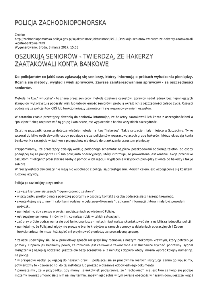 POLICJA ZACHODNIOPOMORSKA Źródło: http://zachodniopomorska.policja.gov.pl/sz/aktualnosci/aktualnosci/4911,Oszukuja-seniorow-twierdza-ze-hakerzy-zaatakowali -konta-bankowe.html Wygenerowano: Środa, 8 marca 2017, 15:53 OSZUKUJĄ SENIORÓW - TWIERDZĄ, ŻE HAKERZY ZAATAKOWALI KONTA BANKOWE Do policjantów co jakiś czas zgłaszają się seniorzy, którzy informują o próbach wyłudzenia pieniędzy. Różnią się metody, wygląd i wiek sprawców. Zawsze zainteresowaniem sprawców - są oszczędności seniorów. Metoda na tzw." wnuczka" - to znana przez seniorów metoda działania oszustów. Sprawcy nadal jednak bez najmniejszych skrupułów wykorzystują podeszły wiek lub łatwowierność seniorów i próbują okraść ich z oszczędności całego życia. Oszuści podają się za policjantów CBŚ lub funkcjonariuszy zajmującymi się rozpracowywaniem oszustów. W ostatnim czasie przestępcy dzwonią do seniorów informując, że hakerzy zaatakowali ich konta z oszczędnościami a "policjanci" chcą rozpracować tą grupę i konieczne jest wypłacenie z banku wszystkich oszczędności. Ostatnie przypadki oszustw dotyczą właśnie metody na tzw "hakerów". Takie sytuacje miały miejsce w Szczecinie. Tylko wczoraj do kilku osób dzwoniły osoby podające się za policjantów rozpracowujących grupę hakerów, którzy okradają konta bankowe. Na szczęście w żadnym z przypadków nie doszło do przekazania oszustom pieniędzy. Przypominamy, że przestępcy działają według podobnego schematu: najpierw poszkodowani odbierają telefon od osoby podającej się za policjanta CBŚ lub policjanta operacyjnego, który informuje, że prowadzona jest właśnie akcja przeciwko oszustom. "Policjant" prosi starsze osoby o pomoc w ich ujęciu i wypłacenie wszystkich pieniędzy z konta bo hakerzy i tak je zabiorą. W rzeczywistości dzwoniący nie mają nic wspólnego z policją są przestępcami, których celem jest wzbogacenie się kosztem ludzkiej krzywdy. Policja po raz kolejny przypomina: ● zawsze kierujmy się zasadą " ograniczonego zaufania", ● w przypadku prośby o nagłą pożyczkę poprośmy o osobisty kontakt z osobą podającą się z naszego krewnego, ● skontaktujmy się z innymi członkami rodziny w celu zweryfikowania "tragicznej" informacji , która miała być powodem pożyczki, ● pamiętajmy, aby zawsze o swoich podejrzeniach powiadomić Policję, ● ostrzegajmy seniorów i mówmy im, co należy robić w takich sytuacjach, ● zaś przy próbie podszywania się pod funkcjonariuszy - natychmiast należy skontaktować się z najbliższą jednostką policji, ● pamiętajmy, że Policjanci nigdy nie proszą o branie kredytów w ramach pomocy w działaniach operacyjnych ! Żaden funkcjonariusz nie może też żądać ani przyjmować pieniędzy za prowadzoną sprawę. * zawsze upewnijmy się, że w prawidłowy sposób rozłączyliśmy rozmowę z naszym rzekomym krewnym, który potrzebuje pomocy. Dopiero jak będziemy pewni, że rozmowa jest całkowicie zakończona a w słuchawce słychać poprawny sygnał rozłączenia ( najlepiej odczekać jeszcze dla bezpieczeństwa 2- 3 minuty) i dopiero wtedy można wybrać kolejny numer np. na policję. * w przypadku osoby pukającej do naszych drzwi i podającej się za pracownika różnych instytucji zanim go wpuścimy, potwierdźmy to - dzwoniąc np. do tej instytucji lub prosząc o okazanie odpowiedniego dokumentu, * pamiętajmy , że w przypadku, gdy mamy jakiekolwiek podejrzenia, że " fachowiec" nie jest tym za kogo się podaje możemy również umówić się z nim na inny termin, zapewniając sobie w tym okresie obecność w naszym domu jeszcze kogoś innego z członków rodziny lub znajomych, Zespół Prasowy KWP Szczecin / AG Ocena: 0/5 (0) Tweetnij