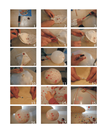 Instrukcja obsługi samodzielnego wykonania balona olbrzyma strzelającego. Skład zestawu (rys. 1): 1. Balon olbrzym o średnicy 1 metra 2. 100 szt. baloników metalicznych 5 cali 3. Konfetti 4. Zapalnik elektryczny 5. Pompka ręczna dwustronna Do zestawu strzelającego niezbędna jest także bateria o napięciu 9 volt nie załączona w zestawie. Instrukcja: 1. Należy wywinąć na zewnątrz szyjkę dużego balona (rys. 2). Nasunąć mały balonik na końcówkę pompki. Włożyć mały balonik z wciśniętą pompką do dużego balona przez wywiniętą szyjkę (rys. 3) tak, aby po włożeniu wystawała końcówka małego balonika (rys. 4). Nadmuchać i związać mały balonik, pozostawiając go we wnętrzu balona olbrzyma (rys. 5-7). Czynność powtórzyć ze wszystkimi małymi balonikami, w międzyczasie wsypując konfetti (rys. 8-9). W razie konieczności rozpompowywać duży balon, aby uzyskać jego większą elastyczność i miejsce na kolejne małe baloniki. 2. Wypełniony małymi balonikami i konfetti duży balon należy nadmuchać do średnicy (maksymalnie) 80 cm i zawiązać na supeł końcówkę jego szyjki (rys. 10-11). 3. Ściągnąć osłonkę z końcówki zapalnika. Przykleić przezroczystą taśmą klejącą główkę zapalnika na równiku balona (końcówka zapalnika powinna dotykać balona) (rys. 12-14). 4. Przewiązać przewody zapalnika wokół szyjki balona, przeciągnąć je do miejsca w którym zostanie podłączona bateria i zawiesić balon na miejscu, w którym ma wystrzelić (rys. 15-16). W razie potrzeby przewody można przedłużyć do 10 metrów standardowym dwużyłowym kablem elektrycznym. 5. Moment wystrzału. Przyłożyć końcówki przewodów zapalinka do biegunów baterii 9 volt, co spowoduje mini-eksplozję „olbrzyma” i wysypanie się małych baloników oraz konfetti po sali (rys. 17-18). Efekt jest naprawdę niezapomniany - polecamy gorąco.