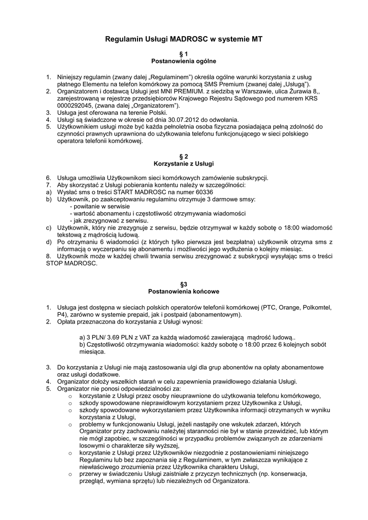 Regulamin Usługi MADROSC w systemie MT §1 Postanowienia ogólne 1. Niniejszy regulamin (zwany dalej „Regulaminem”) określa ogólne warunki korzystania z usług płatnego Elementu na telefon komórkowy za pomocą SMS Premium (zwanej dalej „Usługą”). 2. Organizatorem i dostawcą Usługi jest MNI PREMIUM. z siedzibą w Warszawie, ulica Żurawia 8,, zarejestrowaną w rejestrze przedsiębiorców Krajowego Rejestru Sądowego pod numerem KRS 0000292045, (zwana dalej „Organizatorem”). 3. Usługa jest oferowana na terenie Polski. 4. Usługi są świadczone w okresie od dnia 30.07.2012 do odwołania. 5. Użytkownikiem usługi może być każda pełnoletnia osoba fizyczna posiadająca pełną zdolność do czynności prawnych uprawniona do użytkowania telefonu funkcjonującego w sieci polskiego operatora telefonii komórkowej. §2 Korzystanie z Usługi Usługa umożliwia Użytkownikom sieci komórkowych zamówienie subskrypcji. Aby skorzystać z Usługi pobierania kontentu należy w szczególności: Wysłać sms o treści START MADROSC na numer 60336 Użytkownik, po zaakceptowaniu regulaminu otrzymuje 3 darmowe smsy: - powitanie w serwisie - wartość abonamentu i częstotliwość otrzymywania wiadomości - jak zrezygnować z serwisu. c) Użytkownik, który nie zrezygnuje z serwisu, będzie otrzymywał w każdy sobotę o 18:00 wiadomość tekstową z mądrością ludową. d) Po otrzymaniu 6 wiadomości (z których tylko pierwsza jest bezpłatna) użytkownik otrzyma sms z informacją o wyczerpaniu się abonamentu i możliwości jego wydłużenia o kolejny miesiąc. 8. Użytkownik może w każdej chwili trwania serwisu zrezygnować z subskrypcji wysyłając sms o treści STOP MADROSC. 6. 7. a) b) §3 Postanowienia końcowe 1. Usługa jest dostępna w sieciach polskich operatorów telefonii komórkowej (PTC, Orange, Polkomtel, P4), zarówno w systemie prepaid, jak i postpaid (abonamentowym). 2. Opłata przeznaczona do korzystania z Usługi wynosi: a) 3 PLN/ 3.69 PLN z VAT za każdą wiadomość zawierającą mądrość ludową.. b) Częstotliwość otrzymywania wiadomości: każdy sobotę o 18:00 przez 6 kolejnych sobót miesiąca. 3. Do korzystania z Usługi nie mają zastosowania ulgi dla grup abonentów na opłaty abonamentowe oraz usługi dodatkowe. 4. Organizator dołoży wszelkich starań w celu zapewnienia prawidłowego działania Usługi. 5. Organizator nie ponosi odpowiedzialności za: o korzystanie z Usługi przez osoby nieuprawnione do użytkowania telefonu komórkowego, o szkody spowodowane nieprawidłowym korzystaniem przez Użytkownika z Usługi, o szkody spowodowane wykorzystaniem przez Użytkownika informacji otrzymanych w wyniku korzystania z Usługi, o problemy w funkcjonowaniu Usługi, jeżeli nastąpiły one wskutek zdarzeń, których Organizator przy zachowaniu należytej staranności nie był w stanie przewidzieć, lub którym nie mógł zapobiec, w szczególności w przypadku problemów związanych ze zdarzeniami losowymi o charakterze siły wyższej, o korzystanie z Usługi przez Użytkowników niezgodnie z postanowieniami niniejszego Regulaminu lub bez zapoznania się z Regulaminem, w tym zwłaszcza wynikające z niewłaściwego zrozumienia przez Użytkownika charakteru Usługi, o przerwy w świadczeniu Usługi zaistniałe z przyczyn technicznych (np. konserwacja, przegląd, wymiana sprzętu) lub niezależnych od Organizatora. 6. Regulamin dostępny jest na stronie www.mni-e.pl oraz w siedzibie Organizatora. 7. Ponadto uczestnicy wysyłając zgłoszenie SMS-owe, jednocześnie wyrażają zgodę na udział w serwisie na warunkach określonych niniejszym regulaminem oraz do otrzymywania informacji handlowych i marketingowych na numer telefonu, z którego przesłano SMS-a zgłoszeniowego. 8. Organizator zastrzega sobie prawo zmiany postanowień Regulaminu w razie zmiany przepisów prawnych lub z innej ważnej przyczyny. 9. Reklamacje dotyczące Usługi należy przesyłać listownie pod adres MNI Premium ul. Żurawia 8, Warszawa lub na adres: [email protected]. 10. Termin rozpatrzenia reklamacji wynosi 14 dni roboczych, licząc od dnia otrzymania zgłoszenia przez Organizatora. Reklamacje rozpatrywane będą w formie pisemnej.