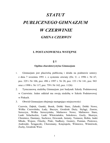 STATUT PUBLICZNEGO GIMNAZJUM W CZERWINIE GMINA CZERWIN I. POSTANOWIENIA WSTĘPNE §1 Ogólna charakterystyka Gimnazjum 1. Gimnazjum jest placówką publiczną i działa na podstawie ustawy z dnia 7 września 1991 r. o systemie oświaty (Dz. U. z 1996 r. Nr 67, poz. 329 i Nr 106, poz. 496 z 1997 r. Nr 28, poz. 153 i Nr 141, poz. 943 oraz z 1998 r. Nr 117, poz. 759 i Nr 162, poz. 1126) 2. Tymczasową siedzibą Gimnazjum jest budynek Szkoły Podstawowej w Czerwinie. Jeden oddział ma swoją siedzibę w Szkole Podstawowej w Piskach. 3. Obwód Gimnazjum obejmuje następujące miejscowości: Czerwin, Dąbek, Gumki, Borek, Dobki Stare, Załuski, Dobki Nowe, Wólka Czerwińska, Łady, Buczyn, Grodzisk Duży, Stylągi, Zaorze, Seroczyn, Wólka Seroczyńska, Malinowo Nowe, Malinowo Stare, Laski Szlacheckie, Laski Włościańskie, Sokołowo, Gocły, Skarzyn, Chruśnice, Damiany, Suchcice, Dzwonek, Jarnuty, Tomasze, Bobin, Janki Młode, Wojsze, Filochy, Piski, Nadbory, Gostery, Pomian, Piotrowo, Andrzejki, Ściągaczki, Choromany, Księżopole, Wiśniewo, Wiśniówek, Żochy, Grodzisk Wieś. 1 CELE I ZADANIA GIMNAZJUM §2 Gimnazjum realizuje cele i zadania wynikające z przepisów prawa oraz uwzględniające program wychowawczy i profilaktyczny szkoły, a w szczególności zapewnia uczniom: a) poznawanie wymaganych pojęć i zdobywanie rzetelnej wiedzy na poziomie umożliwiającym co najmniej kontynuację nauki na następnym etapie kształcenia; b) traktowanie wiadomości przedmiotowych, stanowiących wartość poznawczą samą w sobie, w sposób integralny, prowadzący do lepszego rozumienia świata, ludzi i siebie; c) rozwijanie sprawności umysłowych oraz osobistych zainteresowań; d) znalezienie w szkole środowiska wychowawczego sprzyjającego wszechstronnemu rozwojowi zarówno w wymiarze intelektualnym, psychicznym, społecznym, zdrowotnym, estetycznym, jak i moralnym oraz duchowym; e) szczególną opiekę w zakresie stwarzania warunków bezpieczeństwa oraz promocji i ochrony zdrowia; . f) możliwość korzystania z pomocy psychologicznej i pedagogicznej. §3 1. Gimnazjum gwarantuje wszystkim uczniom równe prawa bez względu na narodowość, pochodzenie, wyznanie, status społeczny czy warunki zdrowotne. 2. Celem Gimnazjum jest wspomaganie ucznia w jego wszechstronnym rozwoju oraz tworzenie pozytywnie oddziaływującego środowiska wychowawczego. §4 l. Realizacja celów i zadań szkoły następuje poprzez: a) kształcenie zgodnie z założeniami podstaw programowych przewidzianych dla trzeciego etapu edukacyjnego; b) organizację zajęć lekcyjnych w ramach poszczególnych edukacji, a także w ramach bloków przedmiotowych oraz ścieżek edukacyjnych: filozoficznej, prozdrowotnej, ekologicznej, czytelniczej i medialnej, regionalnej — dziedzictwo kulturowe w regionie, obrony cywilnej, europejskiej, kultury polskiej na tle cywilizacji śródziemnomorskiej; c) oddziaływanie wychowawcze skierowanej na takie priorytety, jak współdziałanie w grupie, świadome dążenie do zaplanowanego celu oraz przestrzeganie zasad kultury życia codziennego; 2 d) prowadzenie kół zainteresowań i kół przedmiotowych, zajęć dydaktyczno-wyrównawczych, logopedycznych, terapeutycznych i innych wspierających harmonijny rozwój każdego ucznia; e) zajęcia o charakterze terapeutyczno-wychowawczym, z uwzględnieniem zajęć rozwijających, kompensacyjnych i usprawniających; f) zajęcia socjoterapeutyczne organizowane dla uczniów z dysfunkcjami i zaburzeniami utrudniającymi funkcjonowanie społeczne; g) prowadzenie lekcji religii w szkole; h) pracę pedagogów wspomaganą badaniami i zaleceniami Poradni Psychologiczno-Pedagogicznej, współpracą z ośrodkiem pomocy społecznej, sądem rodzinnym i komisariatem policji. §5 Gimnazjum dba o bezpieczeństwo uczniów i ochrania ich zdrowie poprzez: a) dyżury nauczycieli w budynku według grafiku wywieszonego w pokoju nauczycielskim; b) zapewnienie opieki na zajęciach pozalekcyjnych i nadobowiązkowych; c) opiekę sprawowaną przez jednego opiekuna na 30 uczniów podczas wycieczek organizowanych na terenie Czerwina, na 15 uczniów podczas wyjazdów poza Czerwin i na 10 uczniów podczas wycieczek spełniających normy turystyki kwalifikowanej; d) zgłaszanie, przed wyjazdem na wycieczkę, do policji autokarów w celu dokonania kontroli formalnej oraz technicznej; e) omawianie zasad bezpieczeństwa na godzinach wychowawczych; f) szkolenie pracowników w zakresie zasad bezpieczeństwa i higieny pracy, a także stwarzanie warunków do ich przestrzegania; g) dostosowywanie stolików uczniowskich, krzeseł i innego sprzętu szkolnego do wzrostu uczniów i rodzaju wykonywanych przez nich działań; h) uwzględnianie w tygodniowym rozkładzie zajęć dydaktycznowychowawczych równomiernego rozłożenia zajęć w każdym dniu; i) uwzględnianie zasady różnorodności zajęć w każdym dniu nauki; j) przestrzeganie zasad nie łączenia w kilkugodzinne jednostki lekcyjne zajęć z tego samego przedmiotu, z wyjątkiem przedmiotów, których program tego wymaga. 3 §6 Uczniom, którym z przyczyn rozwojowych, rodzinnych lub losowych potrzebna jest pomoc, szkoła udziela wsparcia poprzez: a) pomoc pedagogiczną udzielaną przez pedagoga szkolnego i instytucje świadczące poradnictwo specjalistyczne; b) zapewnienie dożywiania w formie drugiego śniadania finansowanego przez sponsorów bądź ze środków ośrodka pomocy społecznej lub Gminnej Komisji Rozwiązywania Problemów Alkoholowych; c) organizowanie pomocy materialnej i rzeczowej w ramach akcji charytatywnych; d) organizowanie wypoczynku letniego i zimowego w formie półkolonii i kolonii. §7 W celu dostosowania treści, metod i organizacji nauczania do możliwości psychofizycznych uczniów Gimnazjum zapewnia pomoc udzielaną przez pedagoga szkolnego oraz Poradnię Psychologiczno-Pedagogiczną w Ostrołęce w formie: a) pomocy rodzicom w sprawie podjęcia decyzji o badaniach w poradni dzieci z deficytami rozw