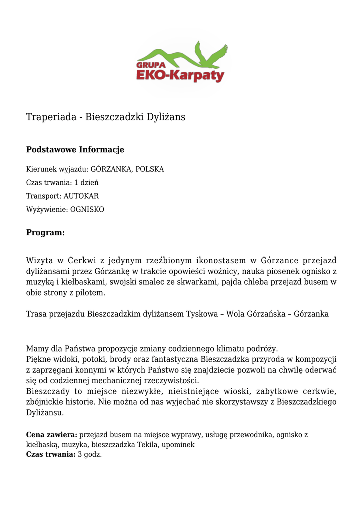 Traperiada - Bieszczadzki Dyliżans Podstawowe Informacje Kierunek wyjazdu: GÓRZANKA, POLSKA Czas trwania: 1 dzień Transport: AUTOKAR Wyżywienie: OGNISKO Program: Wizyta w Cerkwi z jedynym rzeźbionym ikonostasem w Górzance przejazd dyliżansami przez Górzankę w trakcie opowieści woźnicy, nauka piosenek ognisko z muzyką i kiełbaskami, swojski smalec ze skwarkami, pajda chleba przejazd busem w obie strony z pilotem. Trasa przejazdu Bieszczadzkim dyliżansem Tyskowa – Wola Górzańska – Górzanka Mamy dla Państwa propozycje zmiany codziennego klimatu podróży. Piękne widoki, potoki, brody oraz fantastyczna Bieszczadzka przyroda w kompozycji z zaprzęgani konnymi w których Państwo się znajdziecie pozwoli na chwilę oderwać się od codziennej mechanicznej rzeczywistości. Bieszczady to miejsce niezwykłe, nieistniejące wioski, zabytkowe cerkwie, zbójnickie historie. Nie można od nas wyjechać nie skorzystawszy z Bieszczadzkiego Dyliżansu. Cena zawiera: przejazd busem na miejsce wyprawy, usługę przewodnika, ognisko z kiełbaską, muzyka, bieszczadzka Tekila, upominek Czas trwania: 3 godz. Uwagi: Zachęcamy do zabrania ze sobą bluzy/kurtki/ w razie wieczornego ochłodzenia. Ustjanowa Górna Grupa Eko-Karpaty Sp. z o.o. Ustjanowa Górna 242H 38-700 Ustrzyki Dolne tel/fax +48 13 461 36 45 kom. +48 512 226 481 www.eko-karpaty.com [email protected] [email protected] NIP 6891190518 Ustrzyki Dolne Grupa Eko-Karpaty ul. Rynek 19 38-700 Ustrzyki Dolne tel. +48 13 461 10 09 tel./fax +48 13 461 36 46 kom. +48 512 226 481 www.eko-karpaty.com [email protected] [email protected] NIP 6891190518 Lwów Trident - Eko-Karpaty ul. Kopernika 18 79000 Lviv tel. +38 032 298 9114 www.eko-karpaty.com [email protected] [email protected]