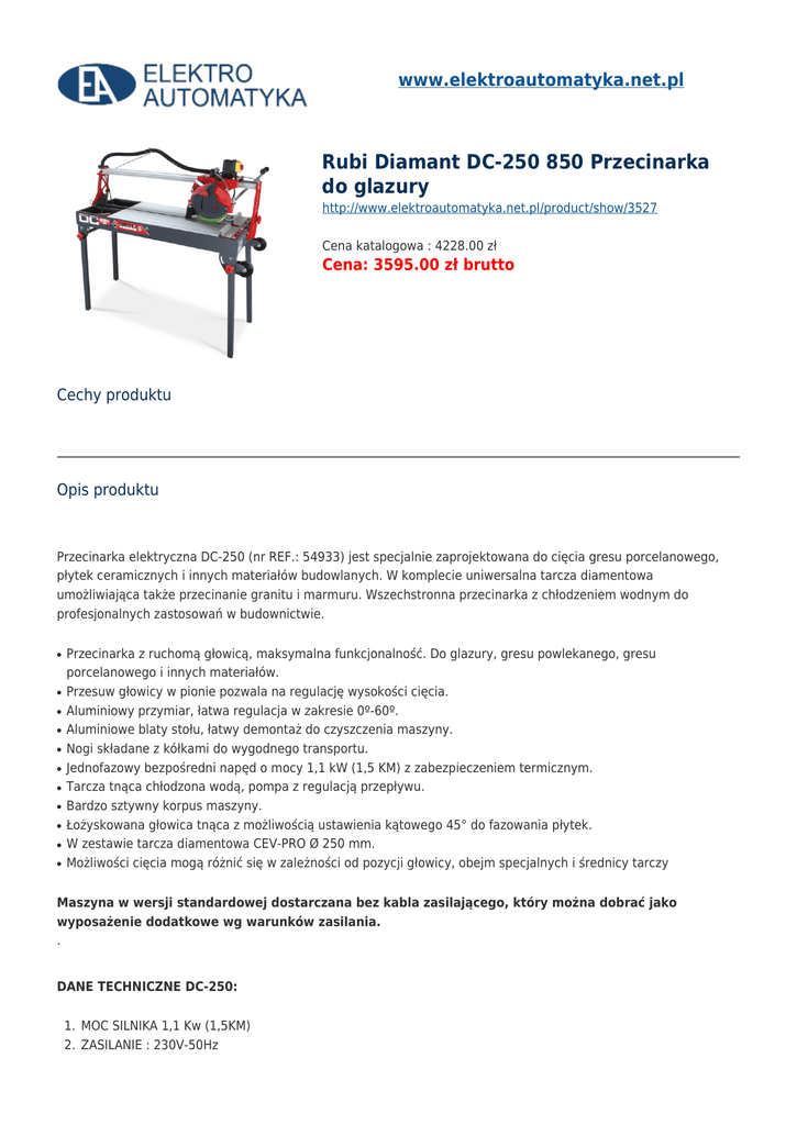 www.elektroautomatyka.net.pl Rubi Diamant DC-250 850 Przecinarka do glazury http://www.elektroautomatyka.net.pl/product/show/3527 Cena katalogowa : 4228.00 zł Cena: 3595.00 zł brutto Cechy produktu Opis produktu Przecinarka elektryczna DC-250 (nr REF.: 54933) jest specjalnie zaprojektowana do cięcia gresu porcelanowego, płytek ceramicznych i innych materiałów budowlanych. W komplecie uniwersalna tarcza diamentowa umożliwiająca także przecinanie granitu i marmuru. Wszechstronna przecinarka z chłodzeniem wodnym do profesjonalnych zastosowań w budownictwie. ● ● ● ● ● ● ● ● ● ● ● Przecinarka z ruchomą głowicą, maksymalna funkcjonalność. Do glazury, gresu powlekanego, gresu porcelanowego i innych materiałów. Przesuw głowicy w pionie pozwala na regulację wysokości cięcia. Aluminiowy przymiar, łatwa regulacja w zakresie 0º-60º. Aluminiowe blaty stołu, łatwy demontaż do czyszczenia maszyny. Nogi składane z kółkami do wygodnego transportu. Jednofazowy bezpośredni napęd o mocy 1,1 kW (1,5 KM) z zabezpieczeniem termicznym. Tarcza tnąca chłodzona wodą, pompa z regulacją przepływu. Bardzo sztywny korpus maszyny. Łożyskowana głowica tnąca z możliwością ustawienia kątowego 45° do fazowania płytek. W zestawie tarcza diamentowa CEV-PRO Ø 250 mm. Możliwości cięcia mogą różnić się w zależności od pozycji głowicy, obejm specjalnych i średnicy tarczy Maszyna w wersji standardowej dostarczana bez kabla zasilającego, który można dobrać jako wyposażenie dodatkowe wg warunków zasilania. . DANE TECHNICZNE DC-250: 1. MOC SILNIKA 1,1 Kw (1,5KM) 2. ZASILANIE : 230V-50Hz 3. 4. 5. 6. 7. 8. 9. 10. 11. 12. 13. 14. 15. 16. 17. 18. PRĘDKOŚĆ OBROTÓW: 2790 min-1 Maksymalna zdolność cięcia 85cm (bez cięcia wgłębnego) Maksymalna zdolność cięcia 98cm z zastosowaniem cięcia wgłębnego WIELKOŚĆ PŁYTKI PRZY CIĘCIU PO PRZEKĄTNEJ : 69,5x69,5 cm DŁUGOŚĆ CIĘCIA SKOŚNEGO : ∞ cm MAKSYMALNA GRUBOŚĆ CIĘCIA: W 1 PRZEJŚCIU: 61 mm W 2 PRZEJŚCIU: 90 mm MOŻLIWOŚĆ CIĘCIA WGŁĘBNEGO, ZAGŁĘBIANIA SILNIK PRZECHYLNY MOŻLIWOŚĆ CIĘĆ SERYJNYCH POMIAR KĄTOWY LINIAŁ MILIMETROWY REGULACJA WYPŁYWU WODY WAGA SAMEJ MASZYNY: 54 kg WYMIARY: DŁUGOŚĆ: 149 cm SZEROKOŚĆ: 79 cm WYSOKOŚĆ: 131 cm ELEKTRO-AUTOMATYKA Sprzedaż elektronarzędzi, urządzeń spawalniczych, maszyn budowlanych, pneumatyki, narzędzi warsztatowych, firmowych ubrań roboczych oraz maszyn ogrodowo leśnych. Sklep Bochnia ul. Brzeska 50 32-700 Bochnia Sklep Brzesko ul. Szarych Szeregów 23 32-800 Brzesko Serwis, Magazyn ul. Św. Brata Alberta 4 32-800 Brzesko tel. 691 572 333 e-mail: [email protected] tel. 609 523 230 e-mail: [email protected] tel. 609 523 645 e-mail: [email protected]