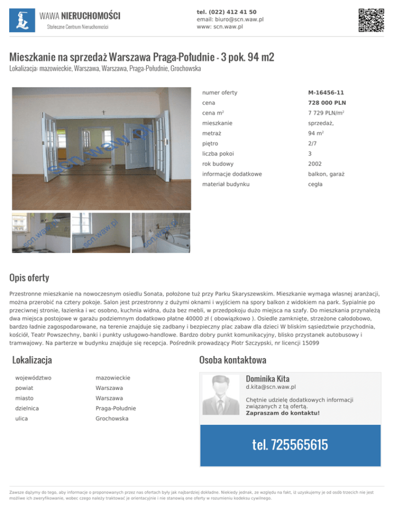 tel. (022) 412 41 50 email: [email protected] www: scn.waw.pl Mieszkanie na sprzedaż Warszawa Praga-Południe - 3 pok. 94 m2 Lokalizacja: mazowieckie, Warszawa, Warszawa, Praga-Południe, Grochowska numer oferty M-16456-11 cena 728 000 PLN cena m 7 729 PLN/m2 mieszkanie sprzedaż, metraż 94 m2 piętro 2/7 liczba pokoi 3 rok budowy 2002 informacje dodatkowe balkon, garaż materiał budynku cegła 2 Opis oferty Przestronne mieszkanie na nowoczesnym osiedlu Sonata, położone tuż przy Parku Skaryszewskim. Mieszkanie wymaga własnej aranżacji, można przerobić na cztery pokoje. Salon jest przestronny z dużymi oknami i wyjściem na spory balkon z widokiem na park. Sypialnie po przeciwnej stronie, łazienka i wc osobno, kuchnia widna, duża bez mebli, w przedpokoju dużo miejsca na szafy. Do mieszkania przynależą dwa miejsca postojowe w garażu podziemnym dodatkowo płatne 40000 zł ( obowiązkowo ). Osiedle zamknięte, strzeżone całodobowo, bardzo ładnie zagospodarowane, na terenie znajduje się zadbany i bezpieczny plac zabaw dla dzieci W bliskim sąsiedztwie przychodnia, kościół, Teatr Powszechny, banki i punkty usługowo-handlowe. Bardzo dobry punkt komunikacyjny, blisko przystanek autobusowy i tramwajowy. Na parterze w budynku znajduje się recepcja. Pośrednik prowadzący Piotr Szczypski, nr licencji 15099 Lokalizacja Osoba kontaktowa Dominika Kita województwo mazowieckie powiat Warszawa [email protected] miasto Warszawa dzielnica Praga-Południe ulica Grochowska Chętnie udzielę dodatkowych informacji związanych z tą ofertą. Zapraszam do kontaktu! tel. 725565615 Zawsze dążymy do tego, aby informacje o proponowanych przez nas ofertach były jak najbardziej dokładne. Niekiedy jednak, ze względu na fakt, iż uzyskujemy je od osób trzecich nie jest możliwe ich zweryfikowanie, wobec czego należy traktować je orientacyjnie i nie stanowią one oferty w rozumieniu kodeksu cywilnego.