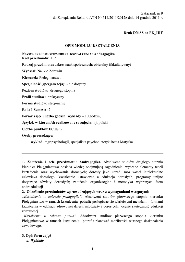 Załącznik nr 9 do Zarządzenia Rektora ATH Nr 514/2011/2012z dnia 14 grudnia 2011 r. Druk DNiSS nr PK_IIIF OPIS MODUŁU KSZTAŁCENIA NAZWA PRZEDMIOTU/MODUŁU KSZTAŁCENIA: Andragogika Kod przedmiotu: 117 Rodzaj przedmiotu: zakres nauk społecznych; obieralny (fakultatywny) Wydział: Nauk o Zdrowiu Kierunek: Pielęgniarstwo Specjalność (specjalizacja): - nie dotyczy Poziom studiów: drugiego stopnia Profil studiów: praktyczny Forma studiów: stacjonarne Rok: 1 Semestr: 2 Formy zajęć i liczba godzin: wykłady – 10 godzin; Język/i, w którym/ch realizowane są zajęcia: : j. polski Liczba punktów ECTS: 2 Osoby prowadzące: wykład: mgr psychologii, specjalista psychodietetyk Beata Matyska 1. Założenia i cele przedmiotu: Andragogika. Absolwent studiów drugiego stopnia kierunku Pielęgniarstwo posiada wiedzę obejmującą zagadnienia: wybrane elementy teorii kształcenia oraz wychowania dorosłych; dorosły jako uczeń; możliwości intelektualne człowieka dorosłego; kształcenie ustawiczne a edukacja dorosłych; programy unijne dotyczące oświaty dorosłych; założenia organizacyjne i metodyka wybranych form androedukacji 2. Określenie przedmiotów wprowadzających wraz z wymaganiami wstępnymi: „Kształcenie w zakresie pedagogiki”. Absolwent studiów pierwszego stopnia kierunku Pielęgniarstwo w ramach kształcenia potrafi: posługiwać się właściwymi metodami i formami kształcenia w edukacji zdrowotnej dzieci, młodzieży i dorosłych; ocenić skuteczność edukacji zdrowotnej. „Kształcenie w zakresie prawa”. Absolwent studiów pierwszego stopnia kierunku Pielęgniarstwo w ramach kształcenia potrafi: planować możliwości własnego doskonalenia zawodowego. 3. Opis form zajęć a) Wykłady 1 Treści programowe (tematyka zajęć): Wybrane elementy teorii kształcenia oraz wychowania dorosłych. Tradycje polskiej oświaty dorosłych. Współczesne instytucje kształcenia dorosłych. Współczesne trendy i funkcje społeczne oświaty dorosłych w zmieniającym się społeczeństwie polskim i wyraźnie postępujące w niej procesy międzynarodowej integracji i globalizacji. Stan oświaty dorosłych we współczesnej Polsce i rozwój refleksji naukowej nad kształceniem dorosłych. Dorosły jako uczeń. Możliwości intelektualne człowieka dorosłego. Inteligencja płynna, inteligencja skrystalizowana. Charakterystyka procesów poznawczych: pamięć, uwaga, myślenie, postrzeganie, wyobrażenia. Motywy podejmowania aktywności edukacyjnej. Kształcenie ustawiczne a edukacja dorosłych. Potrzeby edukacyjne dorosłych. Podstawy prawne i organizacyjne kształcenia ustawicznego w Polsce. Szkoły dla dorosłych, placówki kształcenia ustawicznego, placówki kształcenia praktycznego, uniwersytety powszechne. Ośrodki dokształcania i doskonalenia zawodowego, studia oświatowe, uniwersytety ludowe, uniwersytety III wieku, kształcenie korespondencyjne, e-learning, organizację uczące się. Programy unijne dotyczące oświaty dorosłych. Założenia organizacyjne i metodyka wybranych form androedukacji. Odczyt popularnonaukowy. Kurs. Szkolenie. Seminarium. Staż. Samokształcenie. Dokształcanie i doskonalenie zawodowe. Instytucje upowszechniania problematyki edukacji pro zdrowotnej i profilaktyki zdrowia. Aktywność edukacyjna ludzi starszych w trzecim wieku. Metodyka pracy z dorosłym uczestnikiem. Metody dydaktyczne: Wykład, praca z książką Forma i warunki zaliczenia: zaliczenie z oceną Wykaz literatury podstawowej i uzupełniającej (maksymalnie 5 pozycji w każdej grupie): Literatura podstawowa 1. H. Bee Psychologia rozwoju człowieka. Poznań Zysk i S-ka Wydawnictwo, 2004 2. Aleksander T., Andragogika, Wydawnictwo Naukowe Instytutu Technologii Eksploatacji, Kraków-Radom 2009 3. Gałdowa A., Powszechność i wyjątek. Rozwój osobowości człowieka dorosłego, Kraków 2000 4. Wujek T. (red.), Wprowadzenie do andragogiki, PWN, Warszawa 1996 Literatura uzupełniająca 1. Jankowski D., Przyszczypkowski K., Skrzypczak J., Podstawy edukacji dorosłych, Wydawnictwo Naukowe UAM, Poznań 1996 2. Czerniawska O., Szkice z andragogiki i gerontologii, Łódź 2007 3. Wujek T. (red.), Wprowadzenie do andragogiki, PWN, Warszawa 1996 2 4. Opis sposobu wyznaczania punktów ECTS Bilans nakładu pracy przeciętnego studenta przedstawia się następująco: udział w wykładach = 10 godz. udział w konsultacjach = 10 godz., przy założeniu że student korzysta z konsultacji 1 raz na tydzień przez 10 tygodni, a przeciętny czas poświęcony studentowi równy będzie 1 godzinie. realizacja zadań projektowych – 10 godz. przygotowanie do kolokwiów cząstkowych i obecność na kolokwiach = 10 godz. przygotowanie do zaliczenia końcowego z przedmiotu i obecność na zaliczeniu = 8 godz. + 2 godz. Łączny nakład pracy studenta wynosi 50 godz., co odpowiada 2 pkt. ECTS. 5. Wskaźniki sumaryczne a) liczba godzin dydaktycznych (tzw. kontaktowych) i liczba punktów ECTS na zajęciach wymagających bezpośredniego udziału nauczycieli akademickich, realizowanych w formie studiów stacjonarnych i niestacjonarnych, Wykłady - 10 godzin ECTS 2 pkt. b) liczba godzin dydaktycznych (tzw. kontaktowych) i liczba punktów ECTS na zajęciach o charakterze praktycznym 6. Zakładane efekty kształcenia Numer (Symbol) Efekty kształcenia dla przedmiotu Odniesienie do efektów kształcenia dla kierunku Odniesienie do efektów kształcenia dla obszaru WIEDZA Określa istotę, cele i uwarunkowania kształcenia P117_W01 ustawicznego. PL2P A.W34 P117_W02 Zna specyfikę kształcenia człowieka dorosłego. PL2P A.W30 PL2P A.W34 PL2P A.W36 Jego możliwości intelektualne, charakterystykę procesów poznawczych (pamięć, uwaga, myślenie, postrzeganie, wyobrażenia.) oraz motywy podejmowania aktywności edukacyjnej. P117_W03 Omówi podstawy prawne i organizacyjne kształcenia ustawicznego w Polsce oraz programy unijne dotyczące oświaty dorosłych. P117_W04 Zna założenia organizacyjne 3 i metody