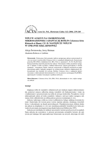 Acta Sci. Pol., Hortorum Cultus 3(2) 2004, 239-248 WPŁYW AUKSYN NA UKORZENIANIE MIKROSADZONEK I ADAPTACJ RO LIN Columnea hirta Klotzsch et Hanst. CZ. II. NAST PCZY WPŁYW W UPRAWIE SZKLARNIOWEJ Alicja wistowska, Jerzy Hetman Akademia Rolnicza w Lublinie Streszczenie. Celem pracy było poznanie wpływu nast pczego auksyn zastosowanych in vitro na wzrost i rozwój ro lin Columnea hirta w warunkach szklarniowych. Zastosowano po ywk MS [1962] z dodatkiem IAA, IBA, NAA w st eniach 5, 10, 20, 40 µM. Kombinacj kontroln stanowiła po ywka bez auksyn. Ukorzenione ro liny posadzono nast pnie w szklarni w torfie wysokim i włóknie kokosowym. Upraw prowadzono w dwóch terminach – wiosennym i letnim. Auksyny zastosowane w kulturach sterylnych na etapie ukorzeniania p dów wpłyn ły nast pczo na zró nicowanie zdolno ci adaptacyjnych mikrosadzonek oraz kierunki ich rozwoju. Ro liny Columnea hirta o najlepszej jako ci otrzymano z mikrosadzonek ukorzenianych in vitro na po ywce zawieraj cej 20 µM IBA, uprawianych w terminie wiosennym w podło u torfowym. Słowa kluczowe: Columnea hirta, IAA, IBA, NAA, ukorzenianie in vitro, wpływ nast pczy auksyn WST P Adaptacja ro lin do warunków szklarniowych jest trudnym etapem mikrorozmna ania, poniewa oznacza całkowit zmian warunków ich funkcjonowania i wi e si z trudno ciami w przystosowaniu si ro lin do nowego rodowiska. Pocz tkowy wzrost mikrosadzonek zale y od wielu czynników. Jednym z nich jest wpływ nast pczy substancji, które oddziaływały na ro lin podczas procesu rozmna ania in vitro. Auksyny wpływaj u ro lin na wzrost wydłu eniowy łodygi, indukcj tworzenia korzeni i hamowanie ich wzrostu przez wy sze st enia auksyny, dominacj wierzchołkow i wykształcanie si tkanek przewodz cych. Charakterystycznym efektem działania auksyn na eksplantaty in vitro jest stymulacja podziałów komórkowych, która prowadzi do powstania niezorganizowanej tkanki kalusowej [Orlikowska 1997]. Auksyna jest niezb dna do indukcji merystemów korzeni przybyszowych na p dach. Sama auksyna nie uczestniczy w procesie powstawania zawi zków korzeni, ale uaktywnia ju istniej ce lub zapocz tkowuje formowanie si nowych, aktywuj c ich zdol- 240 A. wistowska, J. Hetman no ci mitotyczne i pobudzaj c je do rozwoju [Piskornik 1988]. Dawka auksyny w poywce powinna zainicjowa jak najwi cej merystemów korzeniowych, ale utrzymuj cy si jej wysoki poziom mo e potem hamowa wyrastanie zainicjowanych korzeni i powodowa kalusowanie podstawy p du oraz korzeni [Hauzi ska 1975, 1976; Zenkteler 1984; Orlikowska 1997]. Auksyna dodana do po ywki zawsze wpływa stymuluj co na biosyntez etylenu, który powoduje starzenie si kultur. Tkanki ro linne wytwarzaj najwi cej etylenu w obecno ci 2,4-D, a nast pnie kolejno NAA, IAA i IBA [Orlikowska 1997]. Niniejsza praca miała na celu poznanie nast pstw zastosowania auksyn in vitro na kierunek wzrostu i rozwoju ro lin Columnea hirta w warunkach szklarniowych. MATERIAŁ I METODY Materiał ro linny uzyskano z ustabilizowanej kultury tkankowej kolumnei szorstkiej (Columnea hirta), kwitn cej ro liny doniczkowej z rodziny Ostrojowatych (Gesneriaceae). Do wiadczenie obejmowało dwa etapy. W etapie pierwszym p dy ukorzeniano na po ywce zawieraj cej makro- i mikroelementy według Murashige i Skooga [1962] z dodatkiem auksyn: IAA, IBA lub NAA w st eniu: 5, 10, 20 lub 40 µM. Kontrol stanowiła po ywka bez auksyn. Ka da kombinacja obejmowała 60 p dów (4 kolby Erlenmeyera po 15 p dów). Kolby z p dami umieszczono w fitotronie w warunkach 16-godzinnego fotoperiodu i temperaturze 22°C w dzie i 20°C w nocy. Nat enie napromieniowania kwantowego wynosiło 35 µmol⋅m-2⋅s-1 na poziomie kultur. Po 21 dniach ukorzeniania kolby z mikrosadzonkami przewieziono do szklarni, gdzie przeprowadzono drugi etap do wiadczenia – wpływ nast pczy auksyn na adaptacj mikrosadzonek. W tym celu do uprawy przygotowano podło a: torf wysoki (zneutralizowany kred do poziomu pH 5,5) i włókno kokosowe (według zalece producenta). Doniczki 6 × 6 cm wypełniono podło em, podło e nawodniono i podlano Previcurem w st eniu 0,15%. Mikrosadzonki wyj to z kolb, opłukano z resztek po ywki agarowej, posadzono do doniczek i zaetykietowano. Cało do wiadczenia obejmowała 30 kombinacji (15 po ywek zastosowanych do ukorzeniania p dów w etapie pierwszym i 2 podło a). W ka dej kombinacji było po 30 ro lin. Powtórzenie stanowiła pojedyncza ro lina. Doniczki ustawiono w szklarni do wiadczalnej na macie podsi kowej. Cało okryto tunelem foliowym i cieniówk . Po 10–14 dniach, gdy ro liny podj ły samodzielny wzrost foli zdj to; cieniowanie ro lin trwało do ko ca uprawy. Po dwóch tygodniach uprawy rozpocz to nawo enie ro lin raz w tygodniu roztworem wieloskładnikowego nawozu płynnego INSOL U w st eniach: 0,1% trzykrotnie, 0,2% dwukrotnie i 0,3% jeden raz. W czasie uprawy obserwowano wzrost i rozwój ro lin. Po o miu tygodniach uprawy w szklarni do wiadczenie zako czono. Ro liny wyj to z doniczek, wymyto podło e z systemu korzeniowego, a ro liny osuszono na bibule. Cz podziemn oddzielano odcinaj c w miejscu wyrastania korzeni. Zbadano nast puj ce cechy: długo p du głównego (cm), liczb li ci na p dzie głównym (szt.), liczb p dów bocznych (szt.), wie mas cz ci nadziemnej (g), długo korzeni (cm), wiemas korzeni (g). _____________________________________________________________________________________________________________________________________________ Acta Sci. Pol. Wpływ auksyn na ukorzenianie mikrosadzonek i adaptacj ro lin Columnea hirta... 241 W roku 1998 do wiadczenie prowadzono w dwóch terminach: wiosennym – 30.04.– –21.07. oraz letnim – 2.07.–22.09., a w 1999 r. w terminie wiosennym w okresie 22.04.–13.07. Ogółem w trzech seriach przeprowadzonego do wiadczenia wykorzystano ł cznie 2700 ro lin. Dane liczbowe uzyskane z pomiarów ka dej cechy w przeprowadzonych do wiadczeniach poddano analizie statystycznej. Zastosowano metod dwuczynnikowej analizy wari