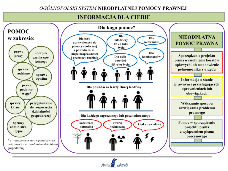 OGÓLNOPOLSKI SYSTEM NIEODPŁATNEJ POMOCY PRAWNEJ INFORMACJA DLA CIEBIE Dla kogo pomoc? POMOC w zakresie: prawa pracy ubezpieczenia społecznego sprawy rodzinne Dla młodzieży do 26 roku życia Dla weteranów Dla kombatantów Dla osób powyżej 65 roku życia sprawy cywilne prawa podatkowego* sprawy karne Dla osób uprawnionych do pomocy społecznej z powodu m. in. niepełnosprawności i przemocy rodzinie przygotowanie do rozpoczęcia działalności gospodarczej sprawy administracyjne * z wyłączeniem spraw podatkowych związanych z prowadzeniem działalności gospodarczej Dla posiadacza Karty Dużej Rodziny Dla każdego zagrożonego lub poszkodowanego katastrofą naturalną awarią techniczną klęską żywiołową NIEODPŁATNA POMOC PRAWNA Sporządzenie projektu pisma o zwolnienie kosztów sądowych lub ustanowienie pełnomocnika z urzędu Informacja o stanie prawnym i przysługujących uprawnieniach lub obowiązkach Wskazanie sposobu rozwiązania problemu prawnego Pomoc w sporządzeniu projektu pisma z wyłączeniem pisma procesowego