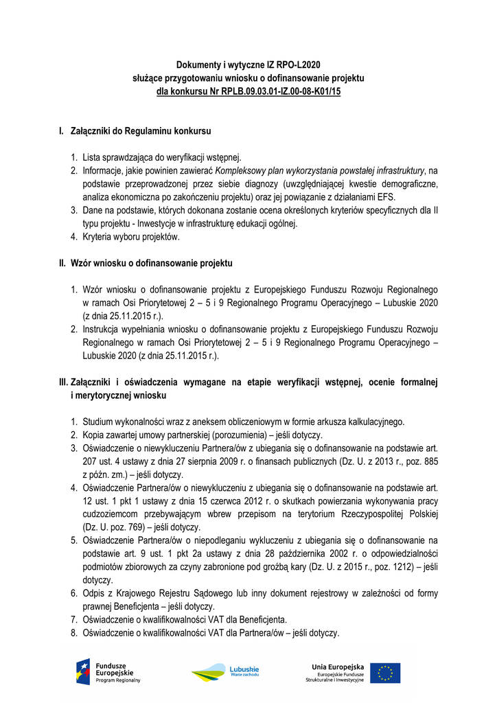 Dokumenty i wytyczne IZ RPO-L2020 służące przygotowaniu wniosku o dofinansowanie projektu dla konkursu Nr RPLB.09.03.01-IZ.00-08-K01/15 I. Załączniki do Regulaminu konkursu 1. Lista sprawdzająca do weryfikacji wstępnej. 2. Informacje, jakie powinien zawierać Kompleksowy plan wykorzystania powstałej infrastruktury, na podstawie przeprowadzonej przez siebie diagnozy (uwzględniającej kwestie demograficzne, analiza ekonomiczna po zakończeniu projektu) oraz jej powiązanie z działaniami EFS. 3. Dane na podstawie, których dokonana zostanie ocena określonych kryteriów specyficznych dla II typu projektu - Inwestycje w infrastrukturę edukacji ogólnej. 4. Kryteria wyboru projektów. II. Wzór wniosku o dofinansowanie projektu 1. Wzór wniosku o dofinansowanie projektu z Europejskiego Funduszu Rozwoju Regionalnego w ramach Osi Priorytetowej 2 – 5 i 9 Regionalnego Programu Operacyjnego – Lubuskie 2020 (z dnia 25.11.2015 r.). 2. Instrukcja wypełniania wniosku o dofinansowanie projektu z Europejskiego Funduszu Rozwoju Regionalnego w ramach Osi Priorytetowej 2 – 5 i 9 Regionalnego Programu Operacyjnego – Lubuskie 2020 (z dnia 25.11.2015 r.). III. Załączniki i oświadczenia wymagane na etapie weryfikacji wstępnej, ocenie formalnej i merytorycznej wniosku 1. Studium wykonalności wraz z aneksem obliczeniowym w formie arkusza kalkulacyjnego. 2. Kopia zawartej umowy partnerskiej (porozumienia) – jeśli dotyczy. 3. Oświadczenie o niewykluczeniu Partnera/ów z ubiegania się o dofinansowanie na podstawie art. 207 ust. 4 ustawy z dnia 27 sierpnia 2009 r. o finansach publicznych (Dz. U. z 2013 r., poz. 885 z późn. zm.) – jeśli dotyczy. 4. Oświadczenie Partnera/ów o niewykluczeniu z ubiegania się o dofinansowanie na podstawie art. 12 ust. 1 pkt 1 ustawy z dnia 15 czerwca 2012 r. o skutkach powierzania wykonywania pracy cudzoziemcom przebywającym wbrew przepisom na terytorium Rzeczypospolitej Polskiej (Dz. U. poz. 769) – jeśli dotyczy. 5. Oświadczenie Partnera/ów o niepodleganiu wykluczeniu z ubiegania się o dofinansowanie na podstawie art. 9 ust. 1 pkt 2a ustawy z dnia 28 października 2002 r. o odpowiedzialności podmiotów zbiorowych za czyny zabronione pod groźbą kary (Dz. U. z 2015 r., poz. 1212) – jeśli dotyczy. 6. Odpis z Krajowego Rejestru Sądowego lub inny dokument rejestrowy w zależności od formy prawnej Beneficjenta – jeśli dotyczy. 7. Oświadczenie o kwalifikowalności VAT dla Beneficjenta. 8. Oświadczenie o kwalifikowalności VAT dla Partnera/ów – jeśli dotyczy. 9. Oświadczenie o współfinansowaniu projektu przez instytucje partycypujące finansowo w kosztach – jeśli dotyczy. 10. Oświadczenie – informacja publiczna. 11. Kompleksowy plan wykorzystania powstałej infrastruktury, przygotowany na podstawie przeprowadzonej przez siebie diagnozy (uwzględniającej kwestie demograficzne, analizę ekonomiczną po zakończeniu projektu) oraz jej powiązanie z działaniami EFS. IV. Dokumenty pomocne w przygotowaniu wniosku o dofinansowanie projektu 1. Rozporządzenie Parlamentu Europejskiego i Rady (UE) NR 1303/2013 z dnia 17 grudnia 2013 r. ustanawiające wspólne przepisy dotyczące Europejskiego Funduszu Rozwoju Regionalnego, Europejskiego Funduszu Społecznego, Funduszu Spójności, Europejskiego Funduszu Rolnego na rzecz Rozwoju Obszarów Wiejskich oraz Europejskiego Funduszu Morskiego i Rybackiego oraz ustanawiające przepisy ogólne dotyczące Europejskiego Funduszu Rozwoju Regionalnego, Europejskiego Funduszu Społecznego, Funduszu Spójności i Europejskiego Funduszu Morskiego i Rybackiego oraz uchylające rozporządzenie Rady (WE) nr 1083/2006. 2. Rozporządzenie Parlamentu Europejskiego i Rady (UE) NR 1301/2013 z dnia 17 grudnia 2013 r. w sprawie Europejskiego Funduszu Rozwoju Regionalnego i przepisów szczególnych dotyczących celu „Inwestycje na rzecz wzrostu i zatrudnienia” oraz w sprawie uchylenia rozporządzenia (WE) nr 1080/2006. 3. Rozporządzenie delegowane Komisji (UE) nr 480/2014 z dnia 3 marca 2014 r. uzupełniające rozporządzenie Parlamentu Europejskiego i Rady (UE) nr 1303/2013 ustanawiające wspólne przepisy dotyczące Europejskiego Funduszu Rozwoju Regionalnego, Europejskiego Funduszu Społecznego, Funduszu Spójności, Europejskiego Funduszu Rolnego na rzecz Rozwoju Obszarów Wiejskich oraz Europejskiego Funduszu Morskiego i Rybackiego oraz ustanawiające przepisy ogólne dotyczące Europejskiego Funduszu Rozwoju Regionalnego, Europejskiego Funduszu Społecznego, Funduszu Spójności i Europejskiego Funduszu Morskiego i Rybackiego (Dz. U. UE z dnia 13.05.2014 r. nr L 138/5). 4. Rozporządzenie Komisji (UE) Nr 651/2014 z dnia 17 czerwca 2014 r. uznające niektóre rodzaje pomocy za zgodne z rynkiem wewnętrznym w zastosowaniu art. 107 i 108 Traktatu. 5. Umowa Partnerstwa na lata 2014-2020 - Programowanie perspektywy finansowej na lata 2014 – 2020 z dnia 21 maja 2014 r. 6. Ustawa z dnia 11 lipca 2014 r. o zasadach realizacji programów w zakresie polityki spójności finansowanych w perspektywie finansowej 2014-2020 (Dz. U. 2014, poz. 1146 z późn. zm.). 7. Ustawa z dnia 19 grudnia 2008 r. o partnerstwie publiczno-prywatnym (Dz. U. z 2009 r. nr 19, poz. 100 z późn. zm). 8. Wytyczne Ministra Infrastruktury i Rozwoju w zakresie kwalifikowalności wydatków w ramach Europejskiego Funduszu Rozwoju Regionalnego, Europejskiego Funduszu Społecznego oraz Funduszu Spójności na lata 2014 – 2020 (z dnia 10.04.2015 r.). 9. Wytyczne Ministra Infrastruktury i Rozwoju w zakresie zagadnień związanych z przygotowaniem projektów inwestycyjnych, w tym projektów generujących dochód i projektów hybrydowych na lata 2014 – 2020 (z dnia 18.03.2015 r.). 9a.Warianty rozwoju gospodarczego Polski. 10. Wytyczne Ministra Infrastruktury i Rozwoju w zakresie realizacji zasady realizacji partnerstwa na lata 2014-2020 (z dnia 28.10.2015 r.). 11. Wytyczne Ministra Infrastruktury i Rozwoju w zakresie dokumentowania postęp