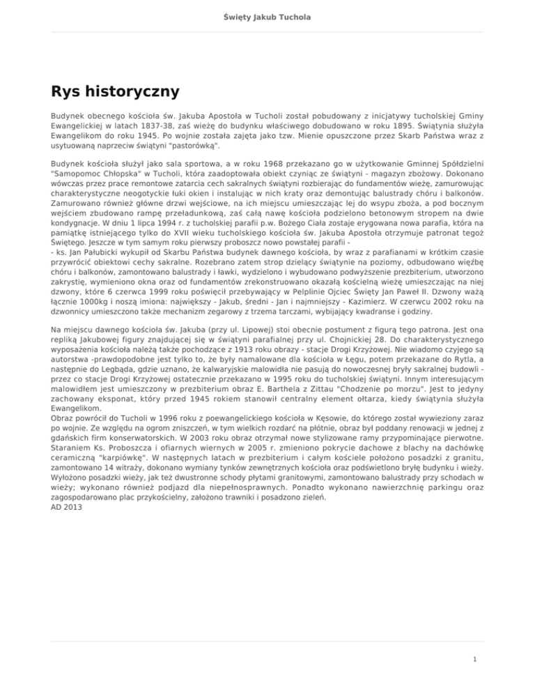 Święty Jakub Tuchola Rys historyczny Budynek obecnego kościoła św. Jakuba Apostoła w Tucholi został pobudowany z inicjatywy tucholskiej Gminy Ewangelickiej w latach 1837-38, zaś wieżę do budynku właściwego dobudowano w roku 1895. Świątynia służyła Ewangelikom do roku 1945. Po wojnie została zajęta jako tzw. Mienie opuszczone przez Skarb Państwa wraz z usytuowaną naprzeciw świątyni "pastorówką". Budynek kościoła służył jako sala sportowa, a w roku 1968 przekazano go w użytkowanie Gminnej Spółdzielni "Samopomoc Chłopska" w Tucholi, która zaadoptowała obiekt czyniąc ze świątyni - magazyn zbożowy. Dokonano wówczas przez prace remontowe zatarcia cech sakralnych świątyni rozbierając do fundamentów wieżę, zamurowując charakterystyczne neogotyckie łuki okien i instalując w nich kraty oraz demontując balustrady chóru i balkonów. Zamurowano również główne drzwi wejściowe, na ich miejscu umieszczając lej do wsypu zboża, a pod bocznym wejściem zbudowano rampę przeładunkową, zaś całą nawę kościoła podzielono betonowym stropem na dwie kondygnacje. W dniu 1 lipca 1994 r. z tucholskiej parafii p.w. Bożego Ciała zostaje erygowana nowa parafia, która na pamiątkę istniejącego tylko do XVII wieku tucholskiego kościoła św. Jakuba Apostoła otrzymuje patronat tegoż Świętego. Jeszcze w tym samym roku pierwszy proboszcz nowo powstałej parafii - ks. Jan Pałubicki wykupił od Skarbu Państwa budynek dawnego kościoła, by wraz z parafianami w krótkim czasie przywrócić obiektowi cechy sakralne. Rozebrano zatem strop dzielący świątynie na poziomy, odbudowano więźbę chóru i balkonów, zamontowano balustrady i ławki, wydzielono i wybudowano podwyższenie prezbiterium, utworzono zakrystię, wymieniono okna oraz od fundamentów zrekonstruowano okazałą kościelną wieżę umieszczając na niej dzwony, które 6 czerwca 1999 roku poświęcił przebywający w Pelplinie Ojciec Święty Jan Paweł II. Dzwony ważą łącznie 1000kg i noszą imiona: największy - Jakub, średni - Jan i najmniejszy - Kazimierz. W czerwcu 2002 roku na dzwonnicy umieszczono także mechanizm zegarowy z trzema tarczami, wybijający kwadranse i godziny. Na miejscu dawnego kościoła św. Jakuba (przy ul. Lipowej) stoi obecnie postument z figurą tego patrona. Jest ona repliką Jakubowej figury znajdującej się w świątyni parafialnej przy ul. Chojnickiej 28. Do charakterystycznego wyposażenia kościoła należą także pochodzące z 1913 roku obrazy - stacje Drogi Krzyżowej. Nie wiadomo czyjego są autorstwa -prawdopodobne jest tylko to, że były namalowane dla kościoła w Łęgu, potem przekazane do Rytla, a następnie do Legbąda, gdzie uznano, że kalwaryjskie malowidła nie pasują do nowoczesnej bryły sakralnej budowli przez co stacje Drogi Krzyżowej ostatecznie przekazano w 1995 roku do tucholskiej świątyni. Innym interesującym malowidłem jest umieszczony w prezbiterium obraz E. Barthela z Zittau "Chodzenie po morzu". Jest to jedyny zachowany eksponat, który przed 1945 rokiem stanowił centralny element ołtarza, kiedy świątynia służyła Ewangelikom. Obraz powrócił do Tucholi w 1996 roku z poewangelickiego kościoła w Kęsowie, do którego został wywieziony zaraz po wojnie. Ze względu na ogrom zniszczeń, w tym wielkich rozdarć na płótnie, obraz był poddany renowacji w jednej z gdańskich firm konserwatorskich. W 2003 roku obraz otrzymał nowe stylizowane ramy przypominające pierwotne. Staraniem Ks. Proboszcza i ofiarnych wiernych w 2005 r. zmieniono pokrycie dachowe z blachy na dachówkę ceramiczną "karpiówkę". W następnych latach w prezbiterium i całym kościele położono posadzki z granitu, zamontowano 14 witraży, dokonano wymiany tynków zewnętrznych kościoła oraz podświetlono bryłę budynku i wieży. Wyłożono posadzki wieży, jak też dwustronne schody płytami granitowymi, zamontowano balustrady przy schodach w wieży; wykonano również podjazd dla niepełnosprawnych. Ponadto wykonano nawierzchnię parkingu oraz zagospodarowano plac przykościelny, założono trawniki i posadzono zieleń. AD 2013 1