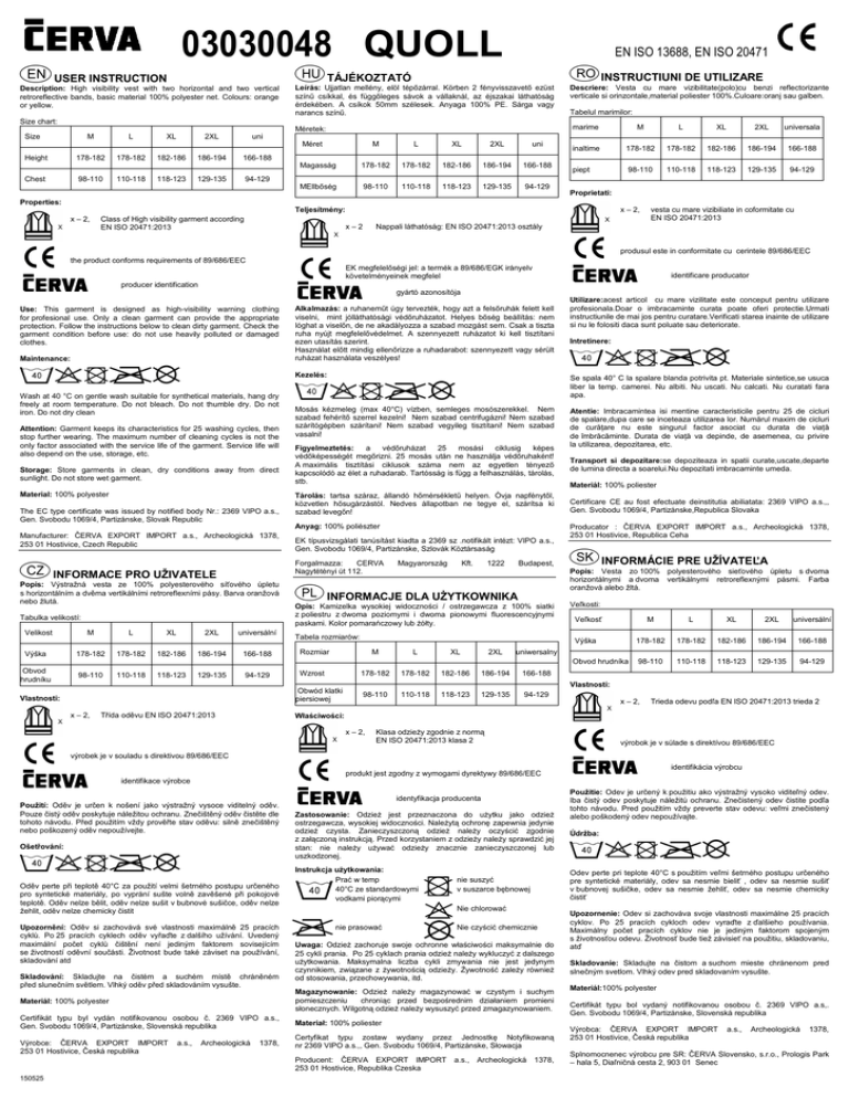 03030048 QUOLL EN ISO 13688, EN ISO 20471 INSTRUCTIUNI DE UTILIZARE TÁJÉKOZTATÓ USER INSTRUCTION Description: High visibility vest with two horizontal and two vertical retroreflective bands, basic material 100% polyester net. Colours: orange or yellow. Leírás: Ujjatlan mellény, elöl tépőzárral. Körben 2 fényvisszavető ezüst színű csíkkal, és függőleges sávok a vállaknál, az éjszakai láthatóság érdekében. A csíkok 50mm szélesek. Anyaga 100% PE. Sárga vagy narancs színű. Size chart: Méretek: Size M L XL 2XL uni 178-182 178-182 182-186 186-194 166-188 Méret Height Chest 98-110 110-118 118-123 129-135 M L XL 2XL uni Magasság 178-182 178-182 182-186 186-194 166-188 MEllbőség 98-110 110-118 118-123 129-135 94-129 Descriere: Vesta cu mare vizibilitate(polo)cu benzi reflectorizante verticale si orinzontale,material poliester 100%.Culoare:oranj sau galben. Tabelul marimilor: marime M L XL 2XL universala inaltime 178-182 178-182 182-186 186-194 166-188 piept 98-110 110-118 118-123 129-135 94-129 94-129 Proprietati: Properties: x – 2, Teljesítmény: x – 2, Class of High visibility garment according EN ISO 20471:2013 x–2 vesta cu mare vizibiliate in coformitate cu EN ISO 20471:2013 Nappali láthatóság: EN ISO 20471:2013 osztály produsul este in conformitate cu cerintele 89/686/EEC the product conforms requirements of 89/686/EEC EK megfelelőségi jel: a termék a 89/686/EGK irányelv követelményeinek megfelel identificare producator producer identification gyártó azonosítója Use: This garment is designed as high-visibility warning clothing for profesional use. Only a clean garment can provide the appropriate protection. Follow the instructions below to clean dirty garment. Check the garment condition before use: do not use heavily polluted or damaged clothes. Maintenance: Alkalmazás: a ruhaneműt úgy tervezték, hogy azt a felsőruhák felett kell viselni, mint jólláthatósági védőruházatot. Helyes bőség beállítás: nem lóghat a viselőn, de ne akadályozza a szabad mozgást sem. Csak a tiszta ruha nyújt megfelelővédelmet. A szennyezett ruházatot ki kell tisztítani ezen utasítás szerint. Használat előtt mindig ellenőrizze a ruhadarabot: szennyezett vagy sérült ruházat használata veszélyes! Kezelés: Wash at 40 °C on gentle wash suitable for synthetical materials, hang dry freely at room temperature. Do not bleach. Do not thumble dry. Do not iron. Do not dry clean Attention: Garment keeps its characteristics for 25 washing cycles, then stop further wearing. The maximum number of cleaning cycles is not the only factor associated with the service life of the garment. Service life will also depend on the use, storage, etc. Storage: Store garments in clean, dry conditions away from direct sunlight. Do not store wet garment. Material: 100% polyester The EC type certificate was issued by notified body Nr.: 2369 VIPO a.s., Gen. Svobodu 1069/4, Partizánske, Slovak Republic Manufacturer: ČERVA EXPORT IMPORT a.s., Archeologická 1378, 253 01 Hostivice, Czech Republic Popis: Výstražná vesta ze 100% polyesterového síťového úpletu s horizontálním a dvěma vertikálními retroreflexními pásy. Barva oranžová nebo žlutá. Tabulka velikostí: Velikost Mosás kézmeleg (max 40°C) vízben, semleges mosószerekkel. Nem szabad fehérítő szerrel kezelni! Nem szabad centrifugázni! Nem szabad szárítógépben szárítani! Nem szabad vegyileg tisztítani! Nem szabad vasalni! Figyelmeztetés: a védőruházat 25 mosási ciklusig képes védőképességét megőrizni. 25 mosás után ne használja védőruhaként! A maximális tisztítási ciklusok száma nem az egyetlen tényező kapcsolódó az élet a ruhadarab. Tartósság is függ a felhasználás, tárolás, stb. Tárolás: tartsa száraz, állandó hőmérsékletű helyen. Óvja napfénytől, közvetlen hősugárzástól. Nedves állapotban ne tegye el, szárítsa ki szabad levegőn! Anyag: 100% poliészter EK típusvizsgálati tanúsítást kiadta a 2369 sz .notifikált intézt: VIPO a.s., Gen. Svobodu 1069/4, Partizánske, Szlovák Köztársaság XL 2XL universální Výška 178-182 178-182 182-186 186-194 166-188 Rozmiar Obvod hrudníku 98-110 110-118 118-123 129-135 94-129 Wzrost Třída oděvu EN ISO 20471:2013 1222 Atentie: Imbracamintea isi mentine caracteristicile pentru 25 de cicluri de spalare,dupa care se inceteaza utilizarea lor. Numărul maxim de cicluri de curățare nu este singurul factor asociat cu durata de viață de îmbrăcăminte. Durata de viață va depinde, de asemenea, cu privire la utilizarea, depozitarea, etc. Transport si depozitare:se depoziteaza in spatii curate,uscate,departe de lumina directa a soarelui.Nu depozitati imbracaminte umeda. Materiál: 100% poliester Certificare CE au fost efectuate deinstitutia abiliatata: 2369 VIPO a.s.,, Gen. Svobodu 1069/4, Partizánske,Republica Slovaka Producator : ČERVA EXPORT IMPORT a.s., Archeologická 1378, 253 01 Hostivice, Republica Ceha INFORMÁCIE PRE UŽÍVATEĽA Budapest, Popis: Vesta zo 100% polyesterového sieťového úpletu s dvoma horizontálnymi a dvoma vertikálnymi retroreflexnými pásmi. Farba oranžová alebo žltá. Tabela rozmiarów: Obwód klatki piersiowej x – 2, Kft. INFORMACJE DLA UŻYTKOWNIKA L Vlastnosti: Magyarország Opis: Kamizelka wysokiej widoczności / ostrzegawcza z 100% siatki z poliestru z dwoma poziomymi i dwoma pionowymi fluorescencyjnymi paskami. Kolor pomarańczowy lub żółty. M Intretinere: Se spala 40° C la spalare blanda potrivita pt. Materiale sintetice,se usuca liber la temp. camerei. Nu albiti. Nu uscati. Nu calcati. Nu curatati fara apa. Forgalmazza: CERVA Nagytétényi út 112. INFORMACE PRO UŽIVATELE Utilizare:acest articol cu mare vizilitate este conceput pentru utilizare profesionala.Doar o imbracaminte curata poate oferi protectie.Urmati instructiunile de mai jos pentru curatare.Verificati starea inainte de utilizare si nu le folositi daca