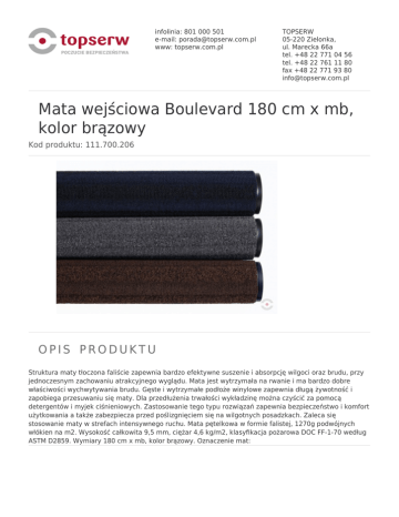 infolinia: 801 000 501 e-mail: [email protected] www: topserw.com.pl TOPSERW 05-220 Zielonka, ul. Marecka 66a tel. +48 22 771 04 56 tel. +48 22 761 11 80 fax +48 22 771 93 80 [email protected] Mata wejściowa Boulevard 180 cm x mb, kolor brązowy Kod produktu: 111.700.206 OPIS PRODUKTU Struktura maty tłoczona faliście zapewnia bardzo efektywne suszenie i absorpcję wilgoci oraz brudu, przy jednoczesnym zachowaniu atrakcyjnego wyglądu. Mata jest wytrzymała na rwanie i ma bardzo dobre właściwości wychwytywania brudu. Gęste i wytrzymałe podłoże winylowe zapewnia długą żywotność i zapobiega przesuwaniu się maty. Dla przedłużenia trwałości wykładzinę można czyścić za pomocą detergentów i myjek ciśnieniowych. Zastosowanie tego typu rozwiązań zapewnia bezpieczeństwo i komfort użytkowania a także zabezpiecza przed poślizgnięciem się na wilgotnych posadzkach. Zaleca się stosowanie maty w strefach intensywnego ruchu. Mata pętelkowa w formie falistej, 1270g podwójnych włókien na m2. Wysokość całkowita 9,5 mm, ciężar 4,6 kg/m2, klasyfikacja pożarowa DOC FF-1-70 według ASTM D2859. Wymiary 180 cm x mb, kolor brązowy. Oznaczenie mat: DANE TECHNICZNE Wymiar 180*cm cm Materiał Włókna Decalon i polipropylenowo-monofilowe Grubość całkowita 9,5 mm Waga 4,6 kg/m² Kolor Brązowy Obszar Wewnętrzny POWIĄZANE Produkt Mata wejściowa Boulevard 90 cm x 120 cm, kolor antracyt Mata wejściowa Boulevard 90 cm x 150 cm, kolor antracyt Mata wejściowa Boulevard 120 cm x 180 cm, kolor antracyt Mata wejściowa Boulevard 120 cm x 18,3 m, kolor antracyt Mata wejściowa Boulevard 120 cm x mb, kolor antracyt Mata wejściowa Boulevard 180 cm x 18,3 m, kolor antracyt Mata wejściowa Boulevard 180 cm x mb, kolor antracyt Mata wejściowa Boulevard 90 cm x 120 cm, kolor brązowy Mata wejściowa Boulevard 90 cm x 150 cm, kolor brązowy Mata wejściowa Boulevard 120 cm x 180 cm, kolor brązowy Mata wejściowa Boulevard 120 cm x 18,3 m, kolor brązowy Mata wejściowa Boulevard 120 cm x mb, kolor brązowy Mata wejściowa Boulevard 180 cm x 18,3 m, kolor brązowy Mata wejściowa Boulevard 180 cm x mb, kolor brązowy Mata wejściowa Boulevard 90 cm x 120 cm, kolor niebieski Mata wejściowa Boulevard 90 cm x 150 cm, kolor niebieski Mata wejściowa Boulevard 120 cm x 180 cm, kolor niebieski Mata wejściowa Boulevard 120 cm x 18,3 m, kolor niebieski Mata wejściowa Boulevard 120 cm x mb, kolor niebieski Mata wejściowa Boulevard 180 cm x 18,3 m, kolor niebieski Mata wejściowa Boulevard 180 cm x mb, kolor niebieski