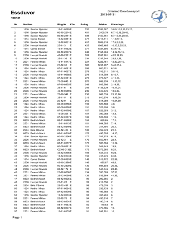 Småland Brevduvesport 2013-07-31 Essduvor Hannar Nr Medlem Ring Nr 1 2 3 4 5 6 7 8 9 10 11 12 13 14 15 16 17 18 19 20 21 22 23 24 25 26 27 28 29 30 31 32 33 34 35 36 37 38 39 40 41 42 43 44 45 46 47 48 49 50 51 52 53 54 55 56 57 1616 1616 1616 1614 1616 2506 1614 1616 2506 2506 2501 2506 1624 1624 2506 1624 2501 1624 2506 2506 2501 2506 2506 1624 1624 1624 2501 1624 8803 2501 8803 2504 8803 1616 2506 8803 1624 8803 2506 1616 1614 2506 2506 2506 2501 2501 8803 2506 2504 1624 1624 1616 2501 8803 8803 8803 2501 16-11-0099 E 00-10-2214 E 00-10-2251 E 16-12-0281 E 16-12-0031 E 25-11-3 E 16-11-0162 E 00-10-2287 E 42-10-2391 E 25-11-36 E 13-11-8117 E 25-12-31 E 87-11-0081 E 87-11-0067 E 42-11-9658 E 87-12-0181 E 70-09-645 E 87-10-0855 E 25-11-6 E 42-10-0559 E 76-10-342 E 25-11-5 E 25-12-9 E 00-09-0256 E 00-09-0260 E 87-12-0179 E 16-09-305 E 87-12-0167 E 88-11-0578 E 13-11-8113 E 88-12-0249 E 25-12-418 E 88-11-0510 E 00-10-2256 E 25-12-3 E 88-11-0587 E 00-09-0261 E CZ-09-0138E 46-12-5276 E 16-12-0103 E 87-09-0183 E 42-10-2390 E 00-10-2339 E 00-12-172 E 25-12-0068 E 25-12-0090 E 88-12-0205 E 25-11-28 E 25-12-437 E 87-11-0064 E 87-12-0209 E 16-12-0043 E 25-12-76 E 88-12-0234 E 88-11-0563 E 88-12-0277 E 13-11-8105 E Page 1 Sandor Nyisztor Sandor Nyisztor Sandor Nyisztor Oprea Stelian Sandor Nyisztor Henryk Nowicki Oprea Stelian Sandor Nyisztor Henryk Nowicki Henryk Nowicki Ferens Miklos Henryk Nowicki Kadric Mirza Kadric Mirza Henryk Nowicki Kadric Mirza Ferens Miklos Kadric Mirza Henryk Nowicki Henryk Nowicki Ferens Miklos Henryk Nowicki Henryk Nowicki Kadric Mirza Kadric Mirza Kadric Mirza Ferens Miklos Kadric Mirza Bedrich Mach Ferens Miklos Bedrich Mach Béla CSoma Bedrich Mach Sandor Nyisztor Henryk Nowicki Bedrich Mach Kadric Mirza Bedrich Mach Henryk Nowicki Sandor Nyisztor Oprea Stelian Henryk Nowicki Henryk Nowicki Henryk Nowicki Ferens Miklos Ferens Miklos Bedrich Mach Henryk Nowicki Béla CSoma Kadric Mirza Kadric Mirza Sandor Nyisztor Ferens Miklos Bedrich Mach Bedrich Mach Bedrich Mach Ferens Miklos Kön Poäng 720 491 489 477 457 425 371 348 339 334 324 300 286 279 278 275 270 248 246 246 238 213 213 192 191 187 187 186 184 181 181 180 178 177 176 175 174 173 169 156 148 146 136 134 134 126 99 99 98 96 96 95 94 93 92 91 91 Priskm 2551,667 2400,79 2150,551 1713,511 1808,618 1902,465 1027,595 1151,304 1957,261 1337,344 1225,751 1251,267 800,721 743,511 811,359 973,727 882,839 842,286 1135,329 840,576 669,539 840,576 811,359 526,108 526,108 526,353 390,068 526,108 669,65 644,585 347,194 762,973 496,605 747,975 659,464 566,804 549,943 1073,565 545,045 747,975 519,172 485,87 591,803 545,045 533,589 533,589 292,865 219,556 476,076 235,133 193,568 467,294 430,916 190,019 119,82 376,785 242,201 Placeringar 3,8,9,10,8,10,23,17, 6,7,10,18,29,45, 6,7,15,24,20,45, 1,1,6,9,11, 17,5,2,2,22, 10,13,9,25,23, 6,3,6,18, 14,12,15,15, 4,20,12,29, 23,8,1,38, 12,30,28,10, 5,40,55,4, 6,3,8, 3,5,16, 8,10,7, 4,11,13, 11,10,12, 2,14,39, 16,17,24, 18,6,33, 23,16,26, 13,49,28, 19,21,50, 4,6, 3,8, 3,12, 12,3, 1,15, 17,1, 7,14, 20,1, 21,1, 14,10, 6,19, 22,4, 15,12, 19,9, 8,21, 9,24, 8,38, 22,32, 48,8, 20,46, 28,40, 37,31, 41,35, 2, 2, 3, 5, 5, 6, 7, 8, 9, 10, 10, Nr Medlem Ring Nr 58 59 60 61 62 63 64 65 66 67 68 69 70 71 72 73 74 75 76 8803 8803 8803 8803 2501 2501 2501 2501 2501 2504 2501 2501 2501 2504 2504 2506 2501 2501 2506 88-09-1119 E 88-12-0257 E CZ-06-0401E 88-00-0344 E 25-12-85 E 16-12-0112 E 25-08-96 E 25-08-70 E 25-09-39 E 25-11-411 E 00-10-2637 E 16-12-0116 E 25-12-0069 E 25-11-418 E 25-12-411 E 25-12-44 E 00-10-2632 E 13-10-0946 E 42-11-9663 E Page 2 Bedrich Mach Bedrich Mach Bedrich Mach Bedrich Mach Ferens Miklos Ferens Miklos Ferens Miklos Ferens Miklos Ferens Miklos Béla CSoma Ferens Miklos Ferens Miklos Ferens Miklos Béla CSoma Béla CSoma Henryk Nowicki Ferens Miklos Ferens Miklos Henryk Nowicki Kön Poäng 88 88 87 86 86 85 85 84 80 76 76 74 69 68 66 62 60 59 54 Priskm Placeringar 190,019 119,82 481,795 481,795 213,669 319,92 213,669 213,669 213,669 364,631 213,669 213,669 213,669 364,631 305,553 219,556 213,669 213,669 266,314 13, 13, 14, 15, 15, 16, 16, 17, 21, 25, 25, 27, 32, 33, 35, 39, 41, 42, 47,