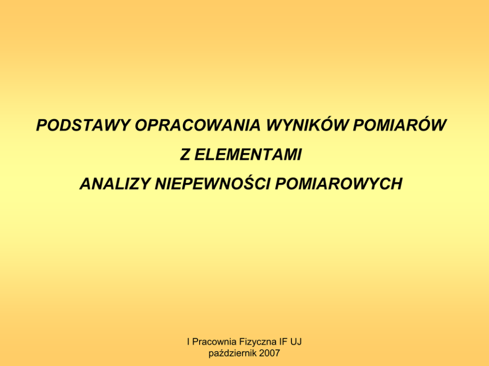 PODSTAWY OPRACOWANIA WYNIKÓW POMIARÓW Z ELEMENTAMI ANALIZY NIEPEWNOŚCI POMIAROWYCH I Pracownia Fizyczna IF UJ październik 2007 POMIAR FIZYCZNY Pomiar bezpośredni to doświadczenie, w którym przy pomocy odpowiednich przyrządów mierzymy (tj. porównujemy z jednostką) interesującą nas wielkość fizyczną np. pomiar długości przedmiotu linijką Pomiar pośredni to doświadczenie, w którym wyznaczamy wartość interesującej nas wielkości fizycznej przez pomiar innych wielkości fizycznych związanych z daną wielkością znanym związkiem funkcyjnym np. pomiar objętości walca poprzez pomiar jego rozmiarów geometrycznych V d 2 h 4 I Pracownia Fizyczna IF UJ październik 2007 ZAPIS WYNIKÓW POMIARÓW Wynik pomiaru bez podania dokładności doświadczenia (niepewności pomiarowej) jest bezwartościowy. 1,34 ± 0,02 m Zapisując wyniki pomiarów stosujemy następującą konwencję: podaje się tylko dwie cyfry znaczące niepewności, a jeżeli zaokrąglenie do jednej cyfry nie zmieni wartości więcej niż o 10% to podaje się tylko jedną cyfrę wynik pomiaru obliczamy o jedno miejsce dziesiętne dalej niż miejsce dziesiętne niepewności, a następnie zaokrąglamy wg. normalnych reguł do tego samego miejsca dziesiętnego, do którego zaokrąglono niepewność pomiarową. I Pracownia Fizyczna IF UJ październik 2007 Niepewności Typy niepewności pomiarowych: • niepewności systematyczne • niepewności przypadkowe Błędy pomiarowe a niepewności pomiarowe. Rodzaje błędów pomiarowych: • błędy przybliżenia • błędy grube Sposoby unikania i zmniejszania błędów pomiarowych. I Pracownia Fizyczna IF UJ październik 2007 NIEPEWNOŚCI SYSTEMATYCZNE Niepewności systematyczne związane są ze skończoną dokładnością przyrządów pomiarowych i niedoskonałością obserwatora. • Pomiar przymiarem milimetrowym - Δx = 1mm Niepewności systematyczne można zmniejszyć: • stosując doskonalsze przyrządy • wykonując bardzo starannie pomiary. Małe niepewności (w stosunku do innych) można zaniedbać. Niepewności systematycznych nie można wyeliminować! I Pracownia Fizyczna IF UJ październik 2007 NIEPEWNOŚCI PRZYPADKOWE Niepewności przypadkowe występują, gdy wyniki pomiarów zmieniają się od pomiaru do pomiaru, powodując odchylenie od wartości prawdziwej zarówno w jedną jak i w drugą stronę. Metody statystyki pozwalają na oszacowanie niepewności przypadkowych zarówno jakościowo jak i ilościowo. • Prawdziwa wartość mierzonej wielkości - wartość oczekiwana. • Rozkład prawdopodobieństwa φ(x) wartości mierzonej jest rozkładem Gaussa. • Przy skończonej ilości pomiarów, parametry rozkładu Gaussa można jedynie estymować. • Szukanie prawdziwej wartości mierzonej wielkości i jej niepewności - to estymacja wartości oczekiwanej i jej odchylenia standardowego. I Pracownia Fizyczna IF UJ październik 2007 ROZKŁAD GAUSSA Estymator wartości oczekiwanej: 1 n x xi n i 1 Estymator niepewności pojedynczego pomiaru: Sx 1 n xi x n 1 i 1 2 Estymator odchylenia standardowego średniej arytmetycznej: Sx I Pracownia Fizyczna IF UJ październik 2007 n 1 xi x nn 1 i 1 2 ROZKŁAD STUDENTA-FISHERA Przy liczbie pomiarów n<10, odchylenie standardowe średniej arytmetycznej S x przyjmuje zaniżoną wartość. Chcąc otrzymać poprawną wartość, należy pomnożyć go przez tzw. współczynnik rozkładu Studenta-Fishera tn . Współczynnik tn zależy od liczby pomiarów n oraz przyjętego poziomu ufności , a jego wartość można znaleźć w odpowiednich tablicach. Poziom ufności to prawdopodobieństwo, z jakim wyznaczony przedział zawiera wartość rzeczywistą mierzonej wielkości. W laboratorium studenckim przyjmuje się zazwyczaj poziom ufności 0.95. Sx I Pracownia Fizyczna IF UJ październik 2007 CAŁKOWITA NIEPEWNOŚĆ POMIAROWA Niepewność systematyczna w ujęciu statystycznym: Sx Całkowita niepewność pomiarowa: 1 2 S x S x 3 2 x I Pracownia Fizyczna IF UJ październik 2007 x 3 x 2 3 NIEPEWNOŚĆ W POMIARACH POŚREDNICH Związek funkcyjny pomiędzy mierzonymi wielkościami: z f x1 , x 2 ,..... x n Średnia arytmetyczna jako estymator wartości oczekiwanej: z f x1 , x 2 ,... x n Odchylenie standardowe średniej arytmetycznej: 2 2 f f f S z S x1 S x2 ..... S xn x1 x2 xn 2 Niepewność maksymalna (występują tylko niepewności statystyczne): z max f f f x1 x2 .... xn x1 x2 xn I Pracownia Fizyczna IF UJ październik 2007 TABELE NAJBARDZIEJ ZWARTY I CZYTELNY ZAPIS WYNIKÓW POMIARÓW • Zawsze, gdy jest to możliwe wyniki pomiarów zapisujemy i przedstawiamy w postaci tabel. • Wartości jednej wielkości zapisujemy w kolumnie. • Nagłówek kolumny powinien zawierać symbol wielkości i jej jednostkę. • Wielkość jednostki miary dobieramy tak, aby zapisywane liczby mieściły się w zakresie 0.1 do 1000. Czas t [s] Natężenie prądu I [mA] 1,3 0,1 2,0 0,3 2,8 0,6 I Pracownia Fizyczna IF UJ październik 2007 WYKRESY dlaczego? • Pozwalają wyznaczyć wartości pewnych wielkości (zazwyczaj jeden z parametrów zależności liniowej łączącej dwie wielkości fizyczne). • Stanowią poglądową ilustrację wyników doświadczenia. • Służą do ustalania empirycznych zależności między dwiema wielkościami. U RI IB U H RH b I Pracownia Fizyczna IF UJ październik 2007 WYKRES najbardziej efektywny sposób przedstawienia wyników pomiarów • Dobry wykres jest dostosowany do prezentowanego zagadnienia • Wykresy sporządzamy w układzie kartezjańskim • Na osiach rozmieszczamy wielokrotności jednostki wielkości wykreślanej. • Używamy jednostek układu SI lub ich wielokrotności • Osie opisujemy symbolem i jednostką wielkości fizycznej • Zakres zmiennej na osi nie musi zaczynać się od zera • Zakresy osi wykresu należy dobrać tak, aby punkty pomiarowe znajdowały się na całej powierzchni ograniczonej osiami • Punkty pomiarowe należy zaznaczać wyraźnie i jednoznacznie • Wykres powinien być