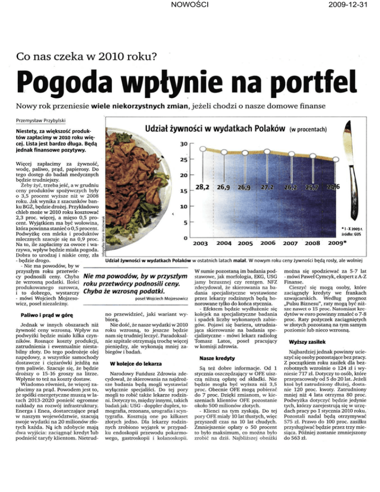 NOWO¦CI 2009-12-31 Co nas czeka w 2010 roku? Pogoda wpłynie na portfel Nowy rok przeniesie wiele niekorzystnych zmian, jeżeli chodzi o nasze domowe finanse Przemysław Przybylski Niestety, za większość produk tów zapłacimy w 2010 roku wię cej. Lista jest bardzo długa. Będą jednak finansowe pozytywy. Udział żywności w wydatkach Polaków (w procentach) 3°r ,-, 25'- Więcej zapłacimy za żywność, wodę, paliwo, prąd, papierosy. Do tego dostęp do badań medycznych 20 będzie trudniejszy. Żeby żyć, trzeba jeść, a w grudniu 28,2 26,9 26,9 ceny produktów spożywczych były ! 15 o 3,5 procent wyższe niż w 2008 roku. Jak wynika z szacunków ban ku BGŻ, będzie drożej. Przykładowo 10 chleb może w 2010 roku kosztować 2,3 proc. więcej, a mięso 0,5 pro cent. Wyjątkiem ma być wołowina, która powinna stanieć o 0,5 procent. *I-X2009r. Podwyżkę cen mleka i produktów źródło: GUS mlecznych szacuje się na 0,9 proc. Na to, ile zapłacimy za owoce i wa 2003 2004 2005 2006 2007 2008 2009* rzywa, wpływ będzie miała pogoda. Dobra to urodzaj i niskie ceny, zła - będzie drogo. Udział żywności w wydatkach Polaków w ostatnich latach malał. W nowym roku ceny żywności będą rosły, ale wolniej - Nie ma powodów, by w . przyszłym roku przetwór W sumie pozostaną im badania pod można się spodziewać za 5-7 lat cy podnosili ceny. Chyba Nie ma powodów, by w przyszłym stawowe, jak morfologia, EKG, USG - mówi Paweł Cym cyk, ekspert z A-Z że wzrosną podatki. Ilości jamy brzusznej czy rentgen. NFZ Finanse. roku przetwórcy podnosili ceny. produkowanego surowca, zdecydował, że skierowania na ba Cieszyć się mogą osoby, które i to dobrego, wystarczy Chyba że wzrosną podatki. dania specjalistyczne wystawione zaciągnęły kredyty we frankach przez lekarzy rodzinnych będą ho szwajcarskich. Według prognoz - mówi Wojciech Mojzesoposeł Wojciech Mojzesowicz norowane tylko do końca stycznia. „Pulsu Biznesu", raty mogą być niż wicz, poseł niezależny. - Efektem będzie wydłużenie się sze nawet o 15 proc. Natomiast kre no przewidzieć, jaki wariant wy kolejek na specjalistyczne badania dytów w euro powinny zmaleć o 7-8 Paliwo i prąd w górę i spadek liczby wykonanych zabie proc. Raty pożyczek zaciągniętych biorą. Jednak w innych obszarach niż Nie dość, że nasze wydatki w 2010 gów. Pojawi się bariera, utrudnia w złotych pozostaną na tym samym żywność ceny wzrosną. Wpływ na roku wzrosną, to jeszcze będzie jąca skierowanie na badania spe poziomie lub nieco wzrosną. podwyżki będzie miało kilka czyn nam się trudniej leczyć. Paradoksal cjalistyczne - mówi lekarz radiolog ników. Rosnące koszty produkcji, nie szpitale otrzymają trochę więcej Tomasz Latoś, poseł pracujący Wyższy zasiłek zatrudnienia i ewentualnie niesta pieniędzy, ale wykonają mniej za w komisji zdrowia. bilny złoty. Do tego podrożeje olej biegów i badań. Najbardziej jednak powinny ucie napędowy, a wszystkie samochody szyć się osoby pozostające bez pracy. Nasze kredyty dostawcze i ciężarówki jeżdżą na Z początkiem roku zasiłek dla bez W kolejce do lekarza tym paliwie. Szacuje się, że będzie Są też dobre informacje. Od 1 robotnych wzrośnie o 124 zl i wy droższy o 15-16 groszy na litrze. Narodowy Fundusz Zdrowia zde stycznia oszczędzający w OFE uisz niesie 717 zł. Dotyczy to osób, które Wpłynie to też na koszty dostaw. cydował, że skierowania na najdroż czą niższą opłatę od składki. Nie przepracowały od 5 do 20 lat. Jeżeli Wiadomo również, że więcej za sze badania będą mogli wystawiać będzie mogła być wyższa niż 3,5 ktoś był zatrudniony dłużej, dosta płacimy za prąd. Powodem jest to, wyłącznie specjaliści. Do tej pory proc. Obecnie OFE mogą pobierać nie 120 proc. kwoty. Zatrudniony że spółki energetyczne muszą w la mogli to robić także lekarze rodzin do 7 proc. Dzięki zmianom, w kie mniej niż 4 lata otrzyma 80 proc. tach 2013-2020 ponieść ogromne ni. Dotyczy to, między innymi, takich szeniach klientów OFE pozostanie Podwyżka dotyczyć będzie jedynie tych, którzy zarejestrują się w urzę nakłady na rozwój infrastruktury. badań jak: USG - doppler duplex, to około 500 milionów złotych. Energa i Enea, dostarczające prąd mografia, rezonans, urografia i scyn - Klienci na tym zyskają. Do tej dach pracy po 1 stycznia 2010 roku. w naszym województwie, szacują tygrafia. Kosztują one po kilkaset pory OFE miały 10 lat tłustych, więc Pozostali nadal będą otrzymywać swoje wydatki na 20 milionów zło złotych jedno. Dla lekarzy rodzin przyszedł czas na 10 lat chudych. 575 zł. Prawo do 100 proc. zasiłku tych każda. Ną ich zdobycie mają nych zrobiono wyjątek w przypad Zmniejszenie opłaty o 50 procent przysługiwać będzie przez trzy mie dwa wyjścia: zaciągnąć kredyt lub ku endoskopii przewodu pokarmo to było maksimum, co można było siąca. Później zostanie zmniejszony podnieść taryfy klientom. Nietrud wego, gastroskopii i kolanoskopii. zrobić na dziś. Najbliższej obniżki do 563 zł. '.V,fe