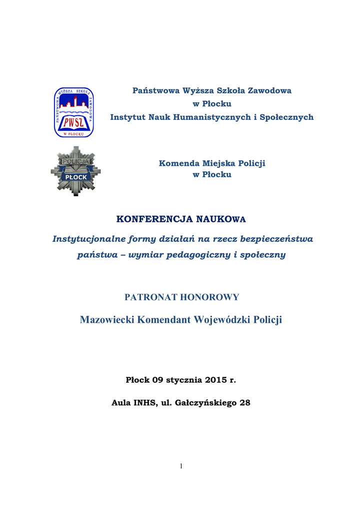 Państwowa Wyższa Szkoła Zawodowa w Płocku Instytut Nauk Humanistycznych i Społecznych Komenda Miejska Policji w Płocku KONFERENCJA NAUKOWA Instytucjonalne formy działań na rzecz bezpieczeństwa państwa – wymiar pedagogiczny i społeczny PATRONAT HONOROWY Mazowiecki Komendant Wojewódzki Policji Płock 09 stycznia 2015 r. Aula INHS, ul. Gałczyńskiego 28 1 Komitet naukowy: Prof. dr hab. Stanisław Lipiński Prof. dr hab. Alena Nowotna Prof. dr hab. Jakub Bartoszewski Płk dr inż. Marek Mastalerz Dr Edward Grott Dr Kinga Przybyszewska Dr Małgorzata Jagodzińska Nadkom. dr Zbigniew Mikołajczyk Komitet organizacyjny: Mjr mgr Dariusz Żochowski Mjr mgr Katarzyna Lorens Mgr Mariola Choińska Informacje: Dr Kinga Przybyszewska, tel. 609553646 Problematyka konferencji: Głównym celem konferencji realizujących zadania w systemie głównych zadań i analiza zagrożeń obszarach oraz ukazanie roli bezpieczeństwa. naukowej jest przedstawienie instytucji bezpieczeństwa państwa, ukazanie ich jakie są przewidywane w poszczególnych i perspektyw edukacji w dziedzinie 2 PROGRAM KONFERENCJI 9.30 – 10.00 – Rejestracja uczestników 10.00 - Powitanie gości i uczestników konferencji Komendant Miejski Policji w Płocku, Prorektor ds. studenckich i dydaktyki PWSZ w Płocku) 10.10 - CZĘŚĆ I - wykład inauguracyjny prof. zw. dr hab. dr h. c. Brunon Hołyst 10.40 – 11.40 - CZĘŚĆ II - panel dyskusyjny Moderatorzy: dr Dorota Dądzik PWSZ, asp. szt. Krzysztof Piasek KMP w Płocku Wykład wprowadzający i prezentacja narzędzia e-Policjant: Charakterystyka systemu bezpieczeństwa państwa polskiego w wymiarze instytucjonalnym a koncepcja ruchomych przestrzeni – nadkom. dr Zbigniew Mikołajczyk Pytania otwarte: - Czy podział zadań pomiędzy służbami ma sens? - Jakie są główne zagrożenia bezpieczeństwa dzisiaj - a jakie jutro? - Jaka jest rola działań profilaktycznych w zapewnieniu bezpieczeństwa? - Jaka jest skuteczność działań na rzecz bezpieczeństwa oczami różnych podmiotów? - Jaka jest rola edukacji do i dla bezpieczeństwa? - Jakie są perspektywy pracy dla studentów bezpieczeństwa? Udział w dyskusji przedstawicieli: PWSZ, SKW, Policji, ŻW, SG, ABW, SC, SM, PSP. 11.50 – 12.00 - PRZERWA KAWOWA 3 12.00 – 14.15 - CZĘŚĆ III – REFERATY Wykład wprowadzający: prof. dr hab. Stanisław Lipiński, PWSZ w Płocku Podświadome uwarunkowania i społeczne konteksty reakcji emocjonalnych REFERATY: • Postępowanie z więźniami niebezpiecznymi w krajach niemieckojęzycznych – dr Dariusz Schmidt, Uniwersytet Warszawski, • Problematyka przestępczości i zjawisk patologicznych wśród nieletnich – podinsp. mgr Katarzyna Lorens, • Zadania BOR-u w systemie bezpieczeństwa wewnętrznego kraju – płk dypl. Ryszard Trzeciak, BOR, • Instytucjonalne formy działań na rzecz bezpieczeństwa z perspektywy Służy Kontrwywiadu Wojskowego – dr Maciej Ciesielski, • Działalność profilaktyczna Policji w środowisku lokalnym – asp. szt. Krzysztof Piasek, • Kształcenie przyszłych kadr w formacjach umundurowanych – mjr mgr Dariusz Żochowski, Ministerstwo Pracy i Polityki Socjalnej, PWSZ w Płocku, • Działania WRD KMP Płock na rzecz bezpieczeństwa na drodze – kom. mgr Robert Nowakowski, • Straż Miejska istotnym elementem w lokalnym systemie zapewniania bezpieczeństwa publicznego na przykładzie miasta Płocka – insp. mgr Jolanta Głowacka, SM w Płocku • Bezpieczeństwo ekologiczne państwa w aspekcie postaw człowieka – dr Małgorzata Jagodzińska, PWSZ w Płocku, • Żandarmeria Wojskowa w systemie bezpieczeństwa państwa – płk dr Robert Jędrychowski, • Uwarunkowania bezpieczeństwa systemu demokratycznego – dr Krzysztof Cebul UKSW, • Rządowe Centrum Bezpieczeństwa - dr Grzegorz Abgarowicz. 14.15 – 14.30 - Podsumowanie i zakończenie konferencji 4
