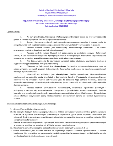 Katedra Histologii i Embriologii Człowieka Wydział Nauk Medycznych Uniwersytet Warmińsko-Mazurski w Olsztynie Regulamin dydaktyczny przedmiotu „Histologia z cytofizjologią i embriologią”nauczania studentów I roku kierunku lekarskiego Rok akademicki 2016/2017 Ogólne zasady: 1. Na kurs przedmiotu „Histologia z cytofizjologią i embriologią” składa się cykl 6 wykładów (12 godzin w semestrze) i cykl 16 ćwiczeń (48 godzin w semestrze). 2. Tematy i daty poszczególnych zajęć, oraz zakres wymaganego materiału (z którego trzeba się przygotować do tych zajęć) zamieszczone są na stronie internetowej Katedry i wywieszone w gablocie. 3. Podczas ćwiczeń Student jest zobowiązany odpowiedniego zachowania i do ubioru ochronnego, zgodnie z „Regulaminem Sali mikroskopowej”. 4. Podczas każdych ćwiczeń Student jest zobowiązany do posiadania zeszytu i kolorowych kredek, w celu rysowania i opisywania wymaganych struktur histologicznych. Prawidłowo i systematycznie prowadzony zeszyt jest warunkiem dopuszczenia do kolokwium praktycznego. 5. Nie dostosowanie się do powyższych wymagań będzie skutkować usunięciem Studenta z zajęć i adnotacją nieobecności nieusprawiedliwionej. 6. Obecność na ćwiczeniach jest obowiązkowa. Studenci są zobowiązani do uczęszczania na zajęcia wyłącznie w swoich grupach ćwiczeniowych. Ewentualna nieobecność na zajęciach ćwiczeniowych musi być usprawiedliwiona. 7. Obecność na wykładach jest obowiązkowa (będzie sprawdzana). Usprawiedliwienie nieobecności na wykładzie należy przedłożyć w Sekretariacie Katedry. W przypadku nieusprawiedliwionej nieobecności na wykładzie student zobowiązany jest do zaliczenie tego zakresu materiału. Zaliczenie materiału wykładowego odbędzie się w formie pisemnej (pytań otwartych) po zakończeniu cyklu wykładów danego semestru. 8. Podczas krótkich sprawdzianów ćwiczeniowych, kolokwiów, egzaminów pisemnych i praktycznych zabrania się porozumiewania i korzystania z jakichkolwiek pomocy naukowych, środków łączności oraz urządzeń elektronicznych wyposażonych w aparat fotograficzny i/lub kamerę. Złamanie tego zakazu skutkuje otrzymaniem oceny niedostatecznej i skierowaniem sprawy do Komisji Dyscyplinarnej Uczelni. Warunki zaliczenia I semestru (zimowego) kursu histologii: 9. Obecność na wykładach i ćwiczeniach. 10. Na początku każdych ćwiczeń przeprowadzane są krótkie sprawdziany pisemne (krókie pytania opisowe) oceniane w systemie procentowym prawidłowych odpowiedzi (tylko pełna poprawna odpowiedź jest zaliczana). Średnia semestralna prawidłowych odpowiedzi ze sprawdzianów musi wynosić co najmniej 50%, aby semestr został zaliczony. 11. Średnia prawidłowych odpowiedzi z pisemnych kolokwiów (test wielokrotnego wyboru) przeprowadzanych w semestrze musi być nie mniejsza niż 40% aby semestr został zaliczony. 12. Do zaliczenia semestru niezbędne jest spełnienie warunków podanych w punktach 9-11. 13. Ocena semestralna jest ustalana zależnie od uzyskanego wyniku z krótkich sprawdzianów i z dwóch kolokwiów. Nie przewiduje się poprawiania krótkich sprawdzianów ćwiczeniowych ani kolokwiów w celu uzyskania zaliczenia lub lepszej oceny semestralnej. Warunki zaliczenia II semestru (letniego) kursu histologii: 14. Odpowiednio stosuje się punkty 9-12. 15. Ponadto w semestrze letnim przeprowadzone będą 3 kolokwia praktyczne, które będą wpływać na ocenę końcową z semestru. Każde kolokwium praktyczne polega na prawidłowym rozpoznaniu preparatów histologicznych przedstawionych na 10 kolejnych stanowiskach mikroskopowych. Średnia co najmniej 50% poprawnych odpowiedzi z kolokwiów praktycznych jest wymagana do zaliczenia II semestru. 16. Zaliczenie II semestru jest warunkiem dopuszczenia do egzaminu. Forma egzaminu: Egzamin składa się z części praktycznej i teoretycznej. Egzamin praktyczny polega na rozpoznawanie preparatów histologicznych przedstawionych na 15 stanowiskach mikroskopowych. Zdanie egzaminu praktycznego, czyli prawidłowe rozpoznanie co najmniej 60% preparatów, jest warunkiem przystąpienia do egzaminu pisemnego. Egzamin teoretyczny jest preprowadzony w formie pisemnej (test wielokrotnego wyboru) i co najmniej 60% prawidłowych odpowiedzi jest wymaganych do jego zdania. Studenci zdający egzamin w II lub III terminie nie muszą zdawać egzaminu praktycznego, jeśli zdali go w poprzednim terminie. Ostateczna ocena w indeksie z przedmiotu ustalona jest w oparciu o: 1. ocenę z egzaminu teoretycznego. 2. ocenę z egzaminu praktycznego. 3. ocenę za pracę roczną. Warunki odrabiania zajęć opuszczonych z przyczyn usprawiedliwionych: 1. W przypadku nieobecności na ćwiczeniach lub na kolokwium czy egzaminie student musi przedłożyć zaświadczenie o chorobie w terminie 3 dni licząc od dnia zakończenia zwolnienia lekarskiego w Sekretariacie Katedry. 2. Zajęcia opuszczone z powodów usprawiedliwionych powinny być odrobione z inną grupą ćwiczeniową. 3. Jeśli nie jest możliwe odrobienie ćwiczeń, student musi przystąpić do zaległego pisemnego sprawdzianu dotyczącego tematu ćwiczenia, na którym był nieobecny. Napisanie zaległego sprawdzianu musi nastąpić maksymalnie w ciągu 7 dni licząc od dnia zakończenia zwolnienia lekarskiego. 4. Jeśli z powodów usprawiedliwionych student opuści kolokwium musi przystąpić do kolokwium w innym terminie wyznaczonym przez Kierownika przedmiotu. Skutki nieusprawiedliwionego opuszczenia ćwiczeń, kolokwiów lub egzaminów: 1. Zero punktów procentowych z krótkiego sprawdzianu na ćwiczeniach. 2. Skreślenie z kursu histologii w przypadku 3 nieusprawiedliwionych nieobecności na ćwiczeniach. 3. Zero punktów procentowych z kolokwium. Olsztyn, dnia 30.09.2016