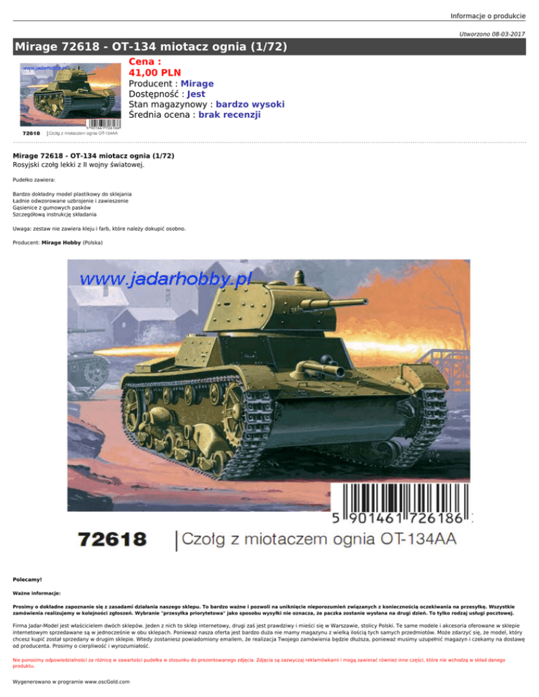 Informacje o produkcie Utworzono 08-03-2017 Mirage 72618 - OT-134 miotacz ognia (1/72) Cena : 41,00 PLN Producent : Mirage Dostępność : Jest Stan magazynowy : bardzo wysoki Średnia ocena : brak recenzji Mirage 72618 - OT-134 miotacz ognia (1/72) Rosyjski czołg lekki z II wojny światowej. Pudełko zawiera: Bardzo dokładny model plastikowy do sklejania Ładnie odwzorowane uzbrojenie i zawieszenie Gąsienice z gumowych pasków Szczegółową instrukcję składania Uwaga: zestaw nie zawiera kleju i farb, które należy dokupić osobno. Producent: Mirage Hobby (Polska) Polecamy! Ważne informacje: Prosimy o dokładne zapoznanie się z zasadami działania naszego sklepu. To bardzo ważne i pozwoli na uniknięcie nieporozumień związanych z koniecznością oczekiwania na przesyłkę. Wszystkie zamówienia realizujemy w kolejności zgłoszeń. Wybranie "przesyłka priorytetowa" jako sposobu wysyłki nie oznacza, że paczka zostanie wysłana na drugi dzień. To tylko rodzaj usługi pocztowej. Firma Jadar-Model jest właścicielem dwóch sklepów. Jeden z nich to sklep internetowy, drugi zaś jest prawdziwy i mieści się w Warszawie, stolicy Polski. Te same modele i akcesoria oferowane w sklepie internetowym sprzedawane są w jednocześnie w obu sklepach. Ponieważ nasza oferta jest bardzo duża nie mamy magazynu z wielką ilością tych samych przedmiotów. Może zdarzyć się, że model, który chcesz kupić został sprzedany w drugim sklepie. Wtedy zostaniesz powiadomiony emailem, że realizacja Twojego zamówienia będzie dłuższa, ponieważ musimy uzupełnić magazyn i czekamy na dostawę od producenta. Prosimy o cierpliwość i wyrozumiałość. Nie ponosimy odpowiedzialności za różnicę w zawartości pudełka w stosunku do prezentowanego zdjęcia. Zdjęcia są zazwyczaj reklamówkami i mogą zawierać również inne części, które nie wchodzą w skład danego produktu. Wygenerowano w programie www.oscGold.com Salon Modelarski Jadar-Model Ul. Jagiellońska 58, 03-468 Warszawa (przy Pl.Hallera) tel.(22) 403-34-30 (w sprawie zamówień prosimy dzwonić: (22) 620-05-39) sklep jest czynny w godz.: pon.-pt. 11.oo 19.oo sobota 10.oo 14.oo Mirage Hobby - Model plastikowy do sklejania i malowania - Mirage Hobby - Jadar-Model Hobby Shop
