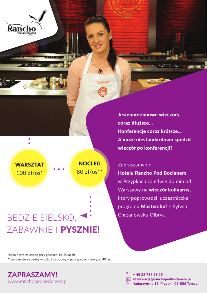 Jesienno-zimowe wieczory coraz dłuższe… Konferencje coraz krótsze… A może niestandardowo spędzić wieczór po konferencji? WARSZTAT 100 zł/os* NOCLEG 80 zł/os** Zapraszamy do Hotelu Rancho Pod Bocianem w Przypkach zaledwie 30 min od Warszawy na wieczór kulinarny, który poprowadzi uczestniczka programu Masterchef – Sylwia BĘDZIE SIELSKO, ZABAWNIE I PYSZNIE! Chrzanowska-Olbrys. *cena netto za osobę przy grupach 15-30 osób **cena netto za osobę w pok. 2 osobowym przy grupach powyżej 40 os. ZAPRASZAMY! www.ranchopodbocianem.pl + 48 22 736 99 15 [email protected] Nadarzyńska 15, Przypki, 05-555 Tarczyn