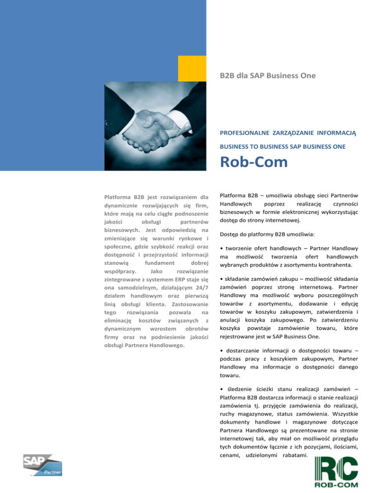 B2B dla SAP Business One PROFESJONALNE ZARZĄDZANIE INFORMACJĄ BUSINESS TO BUSINESS SAP BUSINESS ONE Rob-Com Platforma B2B jest rozwiązaniem dla dynamicznie rozwijających się firm, które mają na celu ciągłe podnoszenie jakości obsługi partnerów biznesowych. Jest odpowiedzią na zmieniające się warunki rynkowe i społeczne, gdzie szybkośd reakcji oraz dostępnośd i przejrzystośd informacji stanowią fundament dobrej współpracy. Jako rozwiązanie zintegrowane z systemem ERP staje się ona samodzielnym, działającym 24/7 działem handlowym oraz pierwszą linią obsługi klienta. Zastosowanie tego rozwiązania pozwala na eliminację kosztów związanych z dynamicznym wzrostem obrotów firmy oraz na podniesienie jakości obsługi Partnera Handlowego. Platforma B2B – umożliwia obsługę sieci Partnerów Handlowych poprzez realizację czynności biznesowych w formie elektronicznej wykorzystując dostęp do strony internetowej. Dostęp do platformy B2B umożliwia: • tworzenie ofert handlowych – Partner Handlowy ma możliwośd tworzenia ofert handlowych wybranych produktów z asortymentu kontrahenta. • składanie zamówieo zakupu – możliwośd składania zamówieo poprzez stronę internetową. Partner Handlowy ma możliwośd wyboru poszczególnych towarów z asortymentu, dodawanie i edycję towarów w koszyku zakupowym, zatwierdzenia i anulacji koszyka zakupowego. Po zatwierdzeniu koszyka powstaje zamówienie towaru, które rejestrowane jest w SAP Business One. • dostarczanie informacji o dostępności towaru – podczas pracy z koszykiem zakupowym, Partner Handlowy ma informacje o dostępności danego towaru. • śledzenie ścieżki stanu realizacji zamówieo – Platforma B2B dostarcza informacji o stanie realizacji zamówienia tj. przyjęcie zamówienia do realizacji, ruchy magazynowe, status zamówienia. Wszystkie dokumenty handlowe i magazynowe dotyczące Partnera Handlowego są prezentowane na stronie internetowej tak, aby miał on możliwośd przeglądu tych dokumentów łącznie z ich pozycjami, ilościami, cenami, udzielonymi rabatami. Okno wyboru kontrahenta: Zalogowany użytkownik to handlowiec: Tomasz. Jako handlowiec musi wybrad sobie klienta, którego obsługuje. Wyświetlana lista zawiera aktualne dane z systemu SAP. Wyszukiwanie działa po kodzie lub nazwie kontrahenta. Widok oferty z zaznaczonym stanem magazynowym towaru: Okno oferty zawiera pełną listę indeksów dostępnych w sprzedaży, pogrupowaną wg zdefiniowanych charakterystyk. Aby zawęzid listę indeksów należy kliknąd wybraną grupę, lub wpisad częśd kodu/nazwy indeksu w polu wyszukiwania. Dostępna jest również możliwośd definiowania własnej listy indeksów, jest to użyteczne w przypadku sprzedaży sezonowej, gdy często sprzedaje się te same towary. Podgląd konkretnego towaru (zdjęcie, opis, ceny, upusty, dostępnośd): Lista dokumentów: Po kliknięciu na link „Własna lista” dostępny jest widok indeksów przypisanych do zalogowanej osoby. Aby dodad indeks do oferty/koszyka należy kliknąd ikonę koszyka w wierszu indeksu. Aby usunąd indeks z listy należy kliknąd ikonę po lewej od ikony koszyka System pamięta w którym widoku była przeglądana lista indeksów w ramach jednej sesji (logowania), czyli przełączając się między poszczególnymi stronami i wracając później do oferty będzie ona w trybie w którym była ostatnio używana. Podgląd dokumentu: Koszyk wraz ze złożeniem zamówienia. Można mied utworzonych kilka koszyków i przeglądając je wybrad odpowiedni: Służy do całościowej obsługi koszyka/oferty W pozycjach dokumentu można modyfikowad ilośd przy pomocy ikon plus/minus, zmniejszenie ilości do zera powoduje usunięcie wiersza z oferty. Można również bezpośrednio usuwad pozycje koszyka przy pomocy ostatniego przycisku. W stopce wyświetlana jest aktualna wartośd koszyka oraz data jego utworzenia. Utworzenie nowego koszyka powoduje utworzenie nowego koszyka/oferty. Jeżeli w chwili tworzenia koszyka istnieje aktywny koszyk można powrócid do jego obsługi przy pomocy opcji „Zmieo koszyk”. Anulowanie koszyka powoduje nieodwracalną utratę aktualnego koszyka Złożenie zamówienia powoduje utworzenie zlecenia sprzedaży w systemie SAP Jeżeli użytkownik zalogowany jest jako handlowiec ma możliwośd modyfikacji cen, aby wejśd w okno zmiany ceny należy kliknąd strzałkę znajdującą się przed ceną. Zmiany ceny można dokonad wpisując cenę lub upust. Przy zmianie koszyka w oknie wyświetlane są otwarte oferty/koszyki. Można w ten sposób wrócid do obsługi wcześniejszego koszyka. Naciśnięcie „Wybierz” powoduje przełączenie koszyka na wybrany oraz przekierowanie do okna obsługi koszyka. Link do aktualnie obsługiwanego koszyka jest nieaktywny. Okno zatwierdzenia zamówienia: W oknie koszyka po naciśnięciu „Złóż zamówienie” pojawia się formularz z danymi potrzebnymi do zaakceptowania zamówienia w SAP’ie. Lista adresów dostawy zawiera aktualne dane z SAP, jeżeli nie ma tam pożądanego adresu dostawy należy wprowadzid go do uwag. Naciśnięcie „zatwierdź” powoduje dodanie zamówienia do SAP’a, oraz zamyka aktualny koszyk, nie ma już możliwości dokonywania poprawek. Rob-Com ul. Gajowa 21 50-517 Wrocław T: 48 71 3670052-54 F: 48 71 3670053 www.robcom.com.pl [email protected] Copyright Rob-Com. Wszelkie prawa zastrzeżone. Rob-Com jest znakiem handlowym firmy Rob-Com. SAP, SAP Business One oraz logo są znakami handlowymi SAP AG zastrzeżonymi w Niemczech i innych krajach. Dane zawarte w niniejszym dokumencie służa jedynie celom informayjnym. Informacje zawarte w opracowaniu mogą ulec zmianie bez uprzedniego zawiadomienia. Są one dostarczane pezez Rob-Com i SAP jedynie w celach informacyjnych i nie stanowią gwarancji, a Rob-Com i SAP nie ponoszą opowiedzialności za błedy lub braki w materiale. Prawnie wiążące są jedynie wyraźnie sformułowane oficjalne gwarancje za