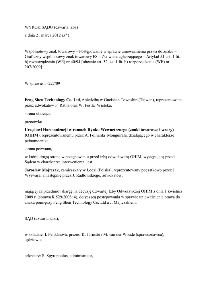 WYROK SĄDU (czwarta izba) z dnia 21 marca 2012 r.(*) Wspólnotowy znak towarowy – Postępowanie w sprawie unieważnienia prawa do znaku – Graficzny wspólnotowy znak towarowy FS – Zła wiara zgłaszającego – Artykuł 51 ust. 1 lit. b) rozporządzenia (WE) nr 40/94 [obecnie art. 52 ust. 1 lit. b) rozporządzenia (WE) nr 207/2009] W sprawie T‑227/09 Feng Shen Technology Co. Ltd, z siedzibą w Gueishan Township (Tajwan), reprezentowana przez adwokatów P. Ratha oraz W. Festla‑Wieteka, strona skarżąca, przeciwko Urzędowi Harmonizacji w ramach Rynku Wewnętrznego (znaki towarowe i wzory) (OHIM), reprezentowanemu przez A. Folliarda‑Monguirala, działającego w charakterze pełnomocnika, strona pozwana, w której drugą stroną w postępowaniu przed izbą odwoławczą OHIM, występującą przed Sądem w charakterze interwenienta, jest Jarosław Majtczak, zamieszkały w Łodzi (Polska), reprezentowany początkowo przez J. Wyrwasa, a następnie przez J. Radłowskiego, adwokatów, mającej za przedmiot skargę na decyzję Czwartej Izby Odwoławczej OHIM z dnia 1 kwietnia 2009 r. (sprawa R 529/2008‑4), dotyczącą postępowania w sprawie unieważnienia prawa do znaku pomiędzy Feng Shen Technology Co. Ltd a J. Majtczakiem, SĄD (czwarta izba), w składzie: I. Pelikánová, prezes, K. Jürimäe i M. van der Woude (sprawozdawca), sędziowie, sekretarz: S. Spyropoulos, administrator, po zapoznaniu się ze skargą złożoną w sekretariacie Sądu w dniu 10 czerwca 2009 r., po zapoznaniu się z odpowiedzią na skargę złożoną przez OHIM w sekretariacie Sądu w dniu 24 listopada 2009 r., po zapoznaniu się z odpowiedzią na skargę złożoną przez interwenienta w sekretariacie Sądu w dniu 28 listopada 2009 r., po zapoznaniu się z repliką złożoną w sekretariacie Sądu w dniu 1 kwietnia 2010 r., po zapoznaniu się z dupliką złożoną w sekretariacie Sądu w dniu 29 czerwca 2010 r., po przeprowadzeniu rozprawy w dniu 18 października 2011 r., wydaje następujący Wyrok Okoliczności powstania sporu 1 Skarżąca, Feng Shen Technology Co. Ltd, jest spółką prawa tajwańskiego, która wytwarza i dystrybuuje rozmaite artykuły, do których należą zamki błyskawiczne. Jest ona w szczególności właścicielem rozlicznych tajwańskich znaków towarowych, zarejestrowanych w szczególności dla towarów z klasy 26 Porozumienia nicejskiego dotyczącego międzynarodowej klasyfikacji towarów i usług dla celów rejestracji znaków z dnia 15 czerwca 1957 r., w zrewidowanym i zmienionym brzmieniu, odpowiadających w szczególności opisowi następującej treści: „zamki błyskawiczne”, które stanowią następujące oznaczenie graficzne: Image not found 2 W 2000 r. skarżąca nawiązała stosunki handlowe z interwenientem, J. Majtczakiem, który prowadził w Polsce działalność handlową pod nazwą handlową „P H U Berotex”. 3 W ramach wymiany wiadomości poczty elektronicznej ze skarżącą interwenient odnosił się do prezentującego zamki błyskawiczne katalogu skarżącej. Faktury wystawione przez skarżącą w ramach jej stosunków handlowych z interwenientem były opatrzone wcześniejszymi tajwańskimi znakami towarowymi, którym towarzyszył symbol ®. 4 Stosunki handlowe pomiędzy skarżącą a interwenientem ustały w styczniu 2005 r. 5 Skarżąca zwróciła się do innego dystrybutora na terytorium Polski, mianowicie do spółki Pik Foison sp. z o.o., utworzonej w 2004 r. 6 W dniu 7 czerwca 2005 r., na podstawie rozporządzenia Rady (WE) nr 40/94 z dnia 20 grudnia 1993 r. w sprawie wspólnotowego znaku towarowego (Dz.U. 1994, L 11, s. 1), ze zmianami [zastąpionego rozporządzeniem Rady (WE) nr 207/2009 z dnia 26 lutego 2009 r. w sprawie wspólnotowego znaku towarowego (Dz.U. L 78, s. 1)], interwenient zgłosił do rejestracji w Urzędzie Harmonizacji w ramach Rynku Wewnętrznego (znaki towarowe i wzory) (OHIM) wspólnotowy znak towarowy. 7 Znak towarowy, o którego rejestrację wniesiono w dniu 15 maja 2006 r. pod numerem 4431391, zgłoszony dla towarów z klasy 26 porozumienia nicejskiego, odpowiadających następującemu opisowi: „zamki błyskawiczne”, to następujące oznaczenie graficzne: Image not found 8 W dniach 29 września i 2 października 2006 r. polskie organy celne zajęły na wniosek interwenienta partię zamków błyskawicznych znajdujących się w posiadaniu spółki Pik Foison i opatrzonych wcześniejszymi tajwańskimi znakami towarowymi. 9 W dniu 17 października 2006 r., na podstawie art. 51 ust. 1 lit. b) rozporządzenia nr 40/94 [obecnie art. 52 ust. 1 lit. b) rozporządzenia nr 207/2009], skarżąca złożyła wniosek o unieważnienie prawa do znaku zarejestrowanego pod numerem 4431391 w oparciu o uzasadnienie, że dokonując zgłoszenia znaku, interwenient działał w złej wierze. Skarżąca podniosła w szczególności, że interwenient wiedział, iż skarżąca używała w Unii Europejskiej oznaczenia składającego się z wielkich liter „F” i „S” jako znaku towarowego dla zamków błyskawicznych i że zgłoszenie spornego znaku zostało dokonane w celu uniemożliwienia tego używania. 10 W dniu 24 stycznia 2008 r. Wydział Unieważnień wydał decyzję odrzucającą wniosek o unieważnienie prawa do znaku. 11 W dniu 25 marca 2008 r. skarżąca wniosła do OHIM odwołanie od decyzji Wydziału Unieważnień. 12 Decyzją z dnia 1 kwietnia 2009 r. (zwaną dalej „zaskarżoną decyzją”) Czwarta Izba Odwoławcza OHIM oddaliła odwołanie. Zauważyła ona, po pierwsze, że nie istnieje definicja legalna pojęcia złej wiary i że ogólnie rzecz biorąc, chodzi o zachowanie niezgodne z uczciwymi praktykami w handlu. 13 Następnie Izba Odwoławcza uznała, że dokonując zgłoszenia, zgłaszający może działać w złej wierze, gdy zgłasza on znak towarowy, wiedząc, ze względu na bezpośrednie stosunki, które utrzymuje z osobą trzecią, że osoba ta używa w dobrej wierze i zgodnie z prawem identycznego znaku towarowego d