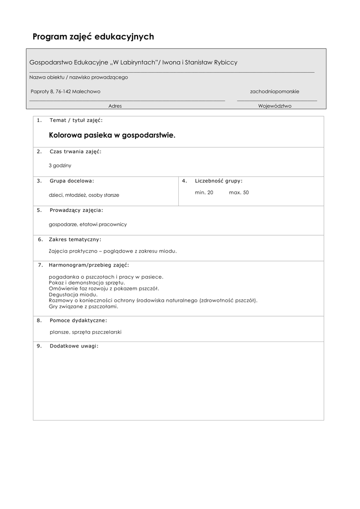Program zajęć edukacyjnych Gospodarstwo Edukacyjne „W Labiryntach”/ Iwona i Stanisław Rybiccy ______________________________________________________________________________________________________________________ Nazwa obiektu / nazwisko prowadzącego Paproty 8, 76-142 Malechowo _________________________________________________________________________________ Adres 1. zachodniopomorskie _________________________________ Województwo Temat / tytuł zajęć: Kolorowa pasieka w gospodarstwie. 2. Czas trwania zajęć: 3 godziny 3. Grupa docelowa: dzieci, młodzież, osoby starsze 5. 4. Liczebność grupy: min. 20 max. 50 Prowadzący zajęcia: gospodarze, etatowi pracownicy 6. Zakres tematyczny: Zajęcia praktyczno – poglądowe z zakresu miodu. 7. Harmonogram/przebieg zajęć: pogadanka o pszczołach i pracy w pasiece. Pokaz i demonstracja sprzętu. Omówienie faz rozwoju z pokazem pszczół. Degustacja miodu. Rozmowy o konieczności ochrony środowiska naturalnego (zdrowotność pszczół). Gry związane z pszczołami. 8. Pomoce dydaktyczne: plansze, sprzęta pszczelarski 9. Dodatkowe uwagi: