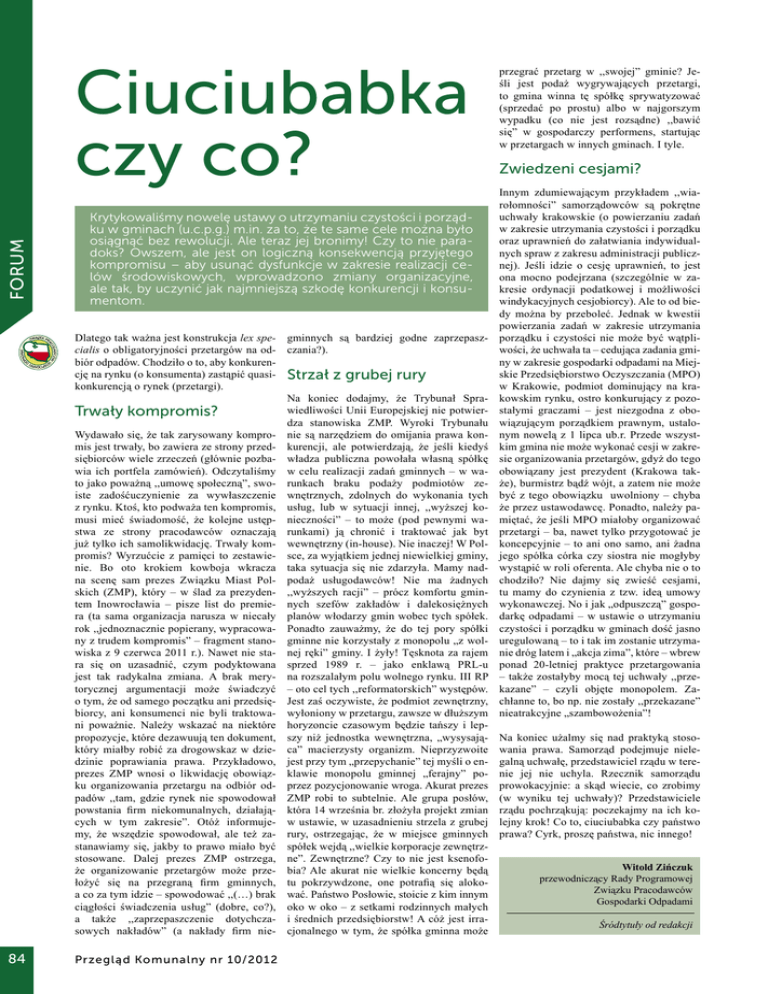 Forum Ciuciubabka czy co? Krytykowaliśmy nowelę ustawy o utrzymaniu czystości i porządku w gminach (u.c.p.g.) m.in. za to, że te same cele można było osiągnąć bez rewolucji. Ale teraz jej bronimy! Czy to nie paradoks? Owszem, ale jest on logiczną konsekwencją przyjętego kompromisu – aby usunąć dysfunkcje w zakresie realizacji celów środowiskowych, wprowadzono zmiany organizacyjne, ale tak, by uczynić jak najmniejszą szkodę konkurencji i konsumentom. Dlatego tak ważna jest konstrukcja lex spe- gminnych są bardziej godne zaprzepaszcialis o obligatoryjności przetargów na od- czania?). biór odpadów. Chodziło o to, aby konkurencję na rynku (o konsumenta) zastąpić quasi- Strzał z grubej rury konkurencją o rynek (przetargi). Na koniec dodajmy, że Trybunał Sprawiedliwości Unii Europejskiej nie potwierTrwały kompromis? dza stanowiska ZMP. Wyroki Trybunału Wydawało się, że tak zarysowany kompro- nie są narzędziem do omijania prawa konmis jest trwały, bo zawiera ze strony przed- kurencji, ale potwierdzają, że jeśli kiedyś siębiorców wiele zrzeczeń (głównie pozba- władza publiczna powołała własną spółkę wia ich portfela zamówień). Odczytaliśmy w celu realizacji zadań gminnych – w wato jako poważną ,,umowę społeczną”, swo- runkach braku podaży podmiotów zeiste zadośćuczynienie za wywłaszczenie wnętrznych, zdolnych do wykonania tych z rynku. Ktoś, kto podważa ten kompromis, usług, lub w sytuacji innej, ,,wyższej komusi mieć świadomość, że kolejne ustęp- nieczności” – to może (pod pewnymi wastwa ze strony pracodawców oznaczają runkami) ją chronić i traktować jak byt już tylko ich samolikwidację. Trwały kom- wewnętrzny (in-house). Nie inaczej! W Polpromis? Wyrzućcie z pamięci to zestawie- sce, za wyjątkiem jednej niewielkiej gminy, nie. Bo oto krokiem kowboja wkracza taka sytuacja się nie zdarzyła. Mamy nadna scenę sam prezes Związku Miast Pol- podaż usługodawców! Nie ma żadnych skich (ZMP), który – w ślad za prezyden- ,,wyższych racji” – prócz komfortu gmintem Inowrocławia – pisze list do premie- nych szefów zakładów i dalekosiężnych ra (ta sama organizacja narusza w niecały planów włodarzy gmin wobec tych spółek. rok ,,jednoznacznie popierany, wypracowa- Ponadto zauważmy, że do tej pory spółki ny z trudem kompromis” – fragment stano- gminne nie korzystały z monopolu „z wolwiska z 9 czerwca 2011 r.). Nawet nie sta- nej ręki” gminy. I żyły! Tęsknota za rajem ra się on uzasadnić, czym podyktowana sprzed 1989 r. – jako enklawą PRL-u jest tak radykalna zmiana. A brak mery- na rozszalałym polu wolnego rynku. III RP torycznej argumentacji może świadczyć – oto cel tych ,,reformatorskich” występów. o tym, że od samego początku ani przedsię- Jest zaś oczywiste, że podmiot zewnętrzny, biorcy, ani konsumenci nie byli traktowa- wyłoniony w przetargu, zawsze w dłuższym ni poważnie. Należy wskazać na niektóre horyzoncie czasowym będzie tańszy i leppropozycje, które dezawuują ten dokument, szy niż jednostka wewnętrzna, „wysysająktóry miałby robić za drogowskaz w dzie- ca” macierzysty organizm. Nieprzyzwoite dzinie poprawiania prawa. Przykładowo, jest przy tym „przepychanie” tej myśli o enprezes ZMP wnosi o likwidację obowiąz- klawie monopolu gminnej „ferajny” poku organizowania przetargu na odbiór od- przez pozycjonowanie wroga. Akurat prezes padów ,,tam, gdzie rynek nie spowodował ZMP robi to subtelnie. Ale grupa posłów, powstania firm niekomunalnych, działają- która 14 września br. złożyła projekt zmian cych w tym zakresie”. Otóż informuje- w ustawie, w uzasadnieniu strzela z grubej my, że wszędzie spowodował, ale też za- rury, ostrzegając, że w miejsce gminnych stanawiamy się, jakby to prawo miało być spółek wejdą ,,wielkie korporacje zewnętrzstosowane. Dalej prezes ZMP ostrzega, ne”. Zewnętrzne? Czy to nie jest ksenofoże organizowanie przetargów może prze- bia? Ale akurat nie wielkie koncerny będą łożyć się na przegraną firm gminnych, tu pokrzywdzone, one potrafią się alokoa co za tym idzie – spowodować ,,(…) brak wać. Państwo Posłowie, stoicie z kim innym ciągłości świadczenia usług” (dobre, co?), oko w oko – z setkami rodzinnych małych a także ,,zaprzepaszczenie dotychcza- i średnich przedsiębiorstw! A cóż jest irrasowych nakładów” (a nakłady firm nie- cjonalnego w tym, że spółka gminna może 84 Przegląd Komunalny nr 10/2012 przegrać przetarg w ,,swojej” gminie? Jeśli jest podaż wygrywających przetargi, to gmina winna tę spółkę sprywatyzować (sprzedać po prostu) albo w najgorszym wypadku (co nie jest rozsądne) ,,bawić się” w gospodarczy performens, startując w przetargach w innych gminach. I tyle. Zwiedzeni cesjami? Innym zdumiewającym przykładem ,,wiarołomności” samorządowców są pokrętne uchwały krakowskie (o powierzaniu zadań w zakresie utrzymania czystości i porządku oraz uprawnień do załatwiania indywidualnych spraw z zakresu administracji publicznej). Jeśli idzie o cesję uprawnień, to jest ona mocno podejrzana (szczególnie w zakresie ordynacji podatkowej i możliwości windykacyjnych cesjobiorcy). Ale to od biedy można by przeboleć. Jednak w kwestii powierzania zadań w zakresie utrzymania porządku i czystości nie może być wątpliwości, że uchwała ta – cedująca zadania gminy w zakresie gospodarki odpadami na Miejskie Przedsiębiorstwo Oczyszczania (MPO) w Krakowie, podmiot dominujący na krakowskim rynku, ostro konkurujący z pozostałymi graczami – jest niezgodna z obowiązującym porządkiem prawnym, ustalonym nowelą z 1 lipca ub.r. Przede wszystkim gmina nie może wykonać cesji w zakresie organizowania przetargów, gdyż do tego obowiązany jest prezydent (Krakowa także), burmistrz bądź wójt, a zatem nie może być z tego obowiązku uwolniony – chyba że przez us