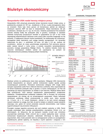 Biuletyn ekonomiczny poniedziałek, 7 listopada 2016 Fixing NBP Gospodarka USA nadal tworzy miejsca pracy Gospodarka USA utrzymuje przyzwoite tempo tworzenia nowych miejsc pracy, w październiku przybyło ich 161 tys., dodatkowo o 35 tys. w górę skorygowano dane za wrzesień. Dane były nieco gorsze od konsensusu, jednak po słabszym środowym raporcie ADP nie była to niespodzianka. Stopa bezrobocia, tak jak oczekiwano, obniżyła się o 0,1 pp. do 4,9 proc. Ostatnie posiedzenie Fed zostawiło szeroko otwartą furtkę dla podwyżek stóp w grudniu, oczekując w zasadzie zaledwie kontynuacji pozytywnych trendów w gospodarce (w tym w być może najuważniej obserwowanym obszarze rynku pracy) jako czynnika mogącego na nią pozwolić. O piątkowych danych można powiedzieć, że zrealizowały ten scenariusz, szczególnie jeżeli weźmiemy pod uwagę kwestię wynagrodzeń. Ich dynamika zaskoczyła na plus i z poziomem 2,8 proc. rdr była o 0,2 pp. wyższa niż oczekiwano. Jednak do czasu grudniowego posiedzenia Fed poznamy jeszcze jeden zestaw danych z rynku pracy, a przede wszystkim (prawdopodobnie) poznamy nowego gospodarza Białego Domu. Ta ostatnia kwestia może być znacznie istotniejszym źródłem wahań lub uspokojenia na rynkach niż makroekonomiczne podstawy bieżącej polityki monetarnej. 750 12,0 600 10,0 450 300 150 8,0 6,0 4,0 0 2,0 -150 0,0 RYNEK PRACY W USA Zmiana liczby miejsc pracy, tys. Stopa bezrobocia, %, prawa oś Źródło: Thomson Reuters DataStream 4,3133 -0,24% USD 3,8862 -0,26% CHF 3,9888 -0,45% GBP 4,8502 0,70% JPY 3,7748 -0,31% Waluty Bazowe 1,1138 EURJPY 114,85 0,43% EURGBP 0,8899 -0,13% EURCHF 1,0788 -0,27% USDJPY 103,14 0,15% Prognoza na koniec EURPLN grudnia 4,31 4,30 USDPLN 3,94 3,91 EURUSD 1,10 1,10 Rynki długu Główny Ekonomista Tomasz Kaczor +48 22 596 59 13 Analityk Piotr Dmitrowski +48 22 522 92 17 Zmiana Polska OK1018 1,82 -0,013 Polska PS0421 2,40 -0,046 Polska DS0726 3,05 -0,046 Niemcy 10L 0,14 -0,025 Francja 10L 0,46 -0,026 USA 10L 1,78 -0,032 Prognoza na koniec listopada Polska Początek nowego tygodnia ponownie stoi pod znakiem wyborów w USA. Rynki zaczęły postrzegać jako bardziej prawdopodobne zwycięstwo Clinton m.in. po informacjach, że toksyczna dla jej kampanii kwestia e-maili jest (chwilowo przynajmniej) zamknięta. Dolar umocnił się w czasie azjatyckiej sesji i wzrosły rentowności bezpiecznych aktywów. Jakkolwiek informacje te będą cennym argumentem, który może pozwolić dziś na odreagowanie rynków (w szczególności kapitałowych), jednak sądzimy, że niepokój o wynik wyborów i związana z nim Kontakt: tel. (+48 22) 52-29-211, tel. (+48 22) 52-29-211 0,29% listopada Niemcy Al. Jerozolimskie 7, 00-955 Warszawa Zmiana EURUSD Reakcja rynków na publikowane dane była spokojna. Obligacje USA nieznacznie straciły bezpośrednio po danych, jednak rentowności szybko spadły poniżej wcześniejszych poziomów. Wzrostowi rentowności obligacji USA mogły także sprzyjać wypowiedzi szefa Fed w Atlancie Dennisa Lockharta, który wypowiadał się na temat możliwości podwyżki stóp w grudniu w duchu wskazującym, że Fed nie potrzebuje już więcej argumentów, by działać w tym kierunku. Reakcja dolara także była symboliczna, choć późnym popołudniem obserwowaliśmy przejściowe osłabienie. Przedpołudniowe publikacje indeksów PMI w Europie nie przyniosły niespodzianek, nie różniąc się od wcześniejszych oszacowań. Warto natomiast odnotować publikację inflacji producenckiej w strefie euro, która wzrosła do -1,5 proc. rdr z -2,1 przed miesiącem. Jednak to nie sam wzrost zasługuje naszym zdaniem na uwagę, lecz fakt, że jest to kolejny w ostatnim czasie wskaźnik dotyczący cen, gdzie ich wzrost przerasta szacunki ekonomistów, czyli kolejny sygnał budzących się procesów inflacyjnych. Bank Gospodarstwa Krajowego Zmiana EUR USA stopa referencyjna rentowność 10Y 1,50 3,15 0,00 0,20 0,25-0,5 1,88 WIBOR % Zmiana O/N 1,65 0,02 1M 1,66 - 3M 1,72 - 6M 1,80 - Rynki kapitałowe Zmiana WIG 47610,9 -0,60% FTSE 100 6693,3 -1,43% DAX 10259,1 -0,65% DJI 17888,3 -0,24% NIKKEI 17177,2 1,61% Szanghaj 3133,3 0,26% Notowania z końca ostatniego dnia roboczego, zmiana w stosunku do poprzedniego notowania (dla stóp banków centralnych - od ostatniego posiedzenia). Źródła informacji: Bloomberg, Thomson Reuters, PAP, GUS, NBP, NYMEX, GPW 1 Biuletyn ekonomiczny poniedziałek, 7 listopada 2016 spodziewamy się (podobnie jak konsensus rynkowy) by zaczynające się jutro posiedzenie RPP wniosło coś nowego w naszą wiedzę o polityce monetarnej (nie mówiąc już o parametrach). W posiedzeniu nie weźmie udziału jeden z senackich członków Rady, który powołany zostanie prawdopodobnie dopiero na posiedzeniu 15-16 listopada. Prawdopodobnie będzie nim Rafał Sura z Katolickiego Uniwersytetu Lubelskiego Jana Pawła II w Lublinie. W tej sytuacji wydarzenia krajowe pozostaną w głębokim cieniu rozwoju sytuacji za Atlantykiem. Dzisiejsze spodziewane odreagowanie na rynkach globalnych (dzięki poprawie notowań Clinton) może sprzyjać polskiej walucie. Oczekujemy, że eurozłoty pozostanie pomiędzy 4,31-4,33 dzisiaj, a w nieco szerszym zakresie 4,30-4,34 do czasu rozstrzygnięć w USA, o ile oczywiście nie pojawią się nowe sensacyjne doniesienia na temat kandydatów. W odniesieniu do długu spodziewamy się, że dzisiaj będziemy mieli warunki do ograniczonego umocnienia, jednak w horyzoncie do wyborów oczekujemy już stabilizacji przy niewielkiej aktywności rynku. wyższa zmienność pozostaną z nami do czasu rozstrzygnięcia wyborczego. Z tego powodu zapewne w tle pozostaną dzisiejsze dane z Niemiec o zamówieniach w przemyśle, wyraźnie gorsze od oczekiwań (-0,6 proc. mdm wobec oczekiwanego 0,3 proc. mdm). Dla eurodolara zapewne oznacza to tymczasowy spadek, jednak raczej nie widzimy powrotu poniżej 1,10. Dzisiejsze dane z Europy (indeks inwestorów Sentix oraz sprzedaż detaliczna w Eurolandzie) pozostan