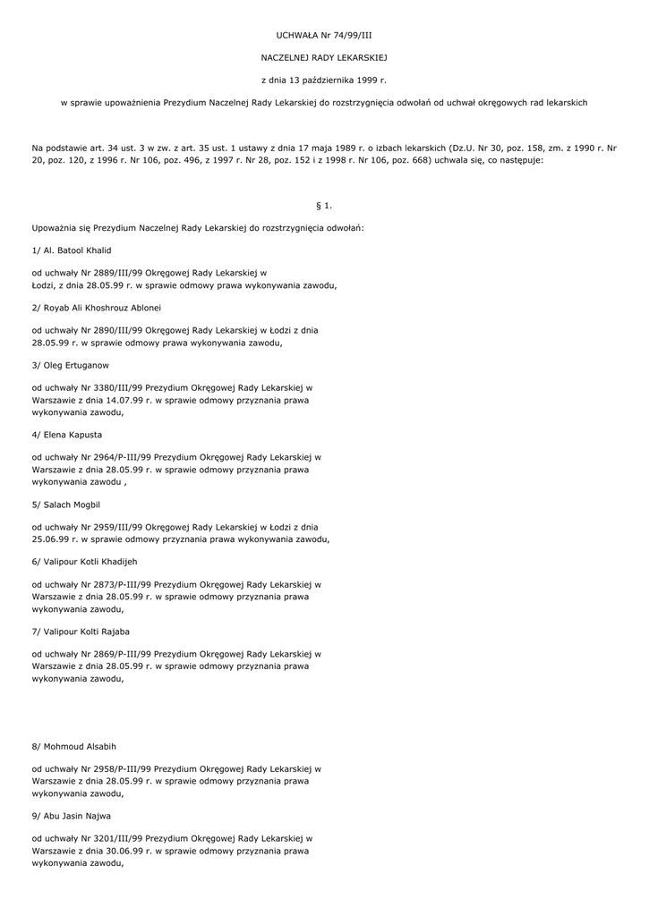 UCHWAŁA Nr 74/99/III NACZELNEJ RADY LEKARSKIEJ z dnia 13 października 1999 r. w sprawie upoważnienia Prezydium Naczelnej Rady Lekarskiej do rozstrzygnięcia odwołań od uchwał okręgowych rad lekarskich Na podstawie art. 34 ust. 3 w zw. z art. 35 ust. 1 ustawy z dnia 17 maja 1989 r. o izbach lekarskich (Dz.U. Nr 30, poz. 158, zm. z 1990 r. Nr 20, poz. 120, z 1996 r. Nr 106, poz. 496, z 1997 r. Nr 28, poz. 152 i z 1998 r. Nr 106, poz. 668) uchwala się, co następuje: § 1. Upoważnia się Prezydium Naczelnej Rady Lekarskiej do rozstrzygnięcia odwołań: 1/ Al. Batool Khalid od uchwały Nr 2889/III/99 Okręgowej Rady Lekarskiej w Łodzi, z dnia 28.05.99 r. w sprawie odmowy prawa wykonywania zawodu, 2/ Royab Ali Khoshrouz Ablonei od uchwały Nr 2890/III/99 Okręgowej Rady Lekarskiej w Łodzi z dnia 28.05.99 r. w sprawie odmowy prawa wykonywania zawodu, 3/ Oleg Ertuganow od uchwały Nr 3380/III/99 Prezydium Okręgowej Rady Lekarskiej w Warszawie z dnia 14.07.99 r. w sprawie odmowy przyznania prawa wykonywania zawodu, 4/ Elena Kapusta od uchwały Nr 2964/P-III/99 Prezydium Okręgowej Rady Lekarskiej w Warszawie z dnia 28.05.99 r. w sprawie odmowy przyznania prawa wykonywania zawodu , 5/ Salach Mogbil od uchwały Nr 2959/III/99 Okręgowej Rady Lekarskiej w Łodzi z dnia 25.06.99 r. w sprawie odmowy przyznania prawa wykonywania zawodu, 6/ Valipour Kotli Khadijeh od uchwały Nr 2873/P-III/99 Prezydium Okręgowej Rady Lekarskiej w Warszawie z dnia 28.05.99 r. w sprawie odmowy przyznania prawa wykonywania zawodu, 7/ Valipour Kolti Rajaba od uchwały Nr 2869/P-III/99 Prezydium Okręgowej Rady Lekarskiej w Warszawie z dnia 28.05.99 r. w sprawie odmowy przyznania prawa wykonywania zawodu, 8/ Mohmoud Alsabih od uchwały Nr 2958/P-III/99 Prezydium Okręgowej Rady Lekarskiej w Warszawie z dnia 28.05.99 r. w sprawie odmowy przyznania prawa wykonywania zawodu, 9/ Abu Jasin Najwa od uchwały Nr 3201/III/99 Prezydium Okręgowej Rady Lekarskiej w Warszawie z dnia 30.06.99 r. w sprawie odmowy przyznania prawa wykonywania zawodu, 10/ Soheil Jazdam od uchwały Nr 3124 Prezydium Okręgowej Rady Lekarskiej w Warszawie z dnia 16.06.99 r. w sprawie odmowy wydania zezwolenia, 11/ Aleksandra Latacz-Grzeszczak od uchwały Nr 412/J SPL/99 Okręgowej Izby Lekarskiej w Opolu z dnia 2.12.98 r. w sprawie odmowy wydania zezwolenia na wykonywanie indywidualnej specjalistycznej praktyki lekarskiej, 12/ Anna Kierzkowska-Kopydłowska od uchwały Nr 2690/III/99 Okręgowej Rady Lekarskiej w Łodzi z dnia 23.04.99 r. w sprawie odmowy wydania zezwolenia na wykonywanie indywidualnej specjalistycznej praktyki lekarskiej i wpisu do rejestru indywidualnych specjalistycznych praktyk lekarskich, 13/ Małgorzata Bernacka od uchwały Nr 2689/III/99 Okręgowej Rady Lekarskiej w Łodzi z dnia 23.04.99 r. w sprawie odmowy wydania zezwolenia na wykonywanie indywidualnej specjalistycznej praktyki lekarskiej i wpisu do rejestru indywidualnych specjalistycznych praktyk lekarskich, 14/ Mirosław Popiński od uchwały Nr 2961/III/99 Okręgowej Rady Lekarskiej w Łodzi z dnia 25.06.99 w sprawie cofnięcia zezwolenia na wykonywanie indywidualnej specjalistycznej praktyki lekarskiej i skreślenia z rejestru indywidualnych specjalistycznych praktyk lekarskich, 15/ Jadwiga Jóźwik-Misiek od uchwały Nr 2962/III/99 Okręgowej Rady Lekarskiej w Łodzi z dnia 25.06.99 r. w sprawie odmowy wydania zezwolenia na wykonywanie indywidualnej specjalistycznej praktyki lekarskiej i wpisu do rejestru indywidualnych specjalistycznych praktyk lekarskich, 16/ Piotr Knast od uchwały Nr 1956/99 Prezydium Okręgowej Rady Lekarskiej Wielkopolskiej Izby Lekarskiej z dnia 14.04.99 r. w sprawie odmowy wydania zezwolenia na wykonywanie indywidualnej specjalistycznej praktyki lekarskiej i wpisu do rejestru indywidualnych specjalistycznych praktyk lekarskich, 17/ Krzysztof Zychowicz od uchwały Nr 1957/99 Prezydium Okręgowej Rady Lekarskiej Wielkopolskiej Izby Lekarskiej 14.04.99 r. w sprawie odmowy wydania zezwolenia na wykonywanie indywidualnej specjalistycznej praktyki lekarskiej i wpisu do rejestru indywidualnych specjalistycznych praktyk lekarskich, 18/ Marek Kowalczyk od uchwały Nr 1958/99 Prezydium Okręgowej Rady Lekarskiej Wielkopolskiej Izby Lekarskiej z dnia 14.04.99 w sprawie odmowy wydania zezwolenia na wykonywanie indywidualnej specjalistycznej praktyki lekarskiej i wpisu do rejestru indywidualnych specjalistycznych praktyk lekarskich, 19/ Stanisław Strojniak od uchwały 1439/99 Prezydium Okręgowej Rady Lekarskiej Wielkopolskiej Izby Lekarskiej z dnia 12.02.99 r. w sprawie odmowy wydania zezwolenia na wykonywanie indywidualnej specjalistycznej praktyki lekarskiej i wpisu do rejestru indywidualnych specjalistycznych praktyk lekarskich, 20/ Iwona Wotyniak od uchwały Nr 499/99 Okręgowej Rady Lekarskiej Wielkopolskiej Izby Lekarskiej z 11.06.99 r. w sprawie odmowy wydania zezwolenia na wykonywanie indywidualnej specjalistycznej praktyki lekarskiej i wpisu do rejestru indywidualnych specjalistycznych praktyk lekarskich, 21/ Ryszard Nawrocki od uchwały Nr 495/99 Okręgowej Rady Lekarskiej Wielkopolskiej Izby Lekarskiej z dnia 11.06.99 r. w sprawie odmowy wydania zezwolenia na wykonywanie indywidualnej specjalistycznej praktyki lekarskiej i wpisu do rejestru indywidualnych specjalistycznych praktyk lekarskich, 22/ Aina Benjamin Adefola od uchwały Nr 2949/III/99 Okręgowej Rady Lekarskiej w Łodzi z dnia 25.06.99 r. w sprawie odmowy wpisu lekarza na listę członków i wpisu do rejestru Okręgowej Izby Lekarskiej w Łodzi w związku z przeniesieniem z Okręgowej Izby Lekarskiej w Lublinie, 23/ Paweł Frieman od uchwały Nr 2950/III/99 Okręgowej Rady Lekarskiej w Łodzi z dnia 25.06.99 r. w sprawie odmowy wpisu lekarza na listę członków i wpisu do rejestru Okręgowej Izby Lekarskiej w Łodzi w związku z przeniesieniem z Kujawsko-Pomorskiej Izby Lekarskiej w Toruniu. § 2. Uchwała wchodzi w życie z dniem podjęcia. Sekretarz Lek. Konstanty Radziwiłł