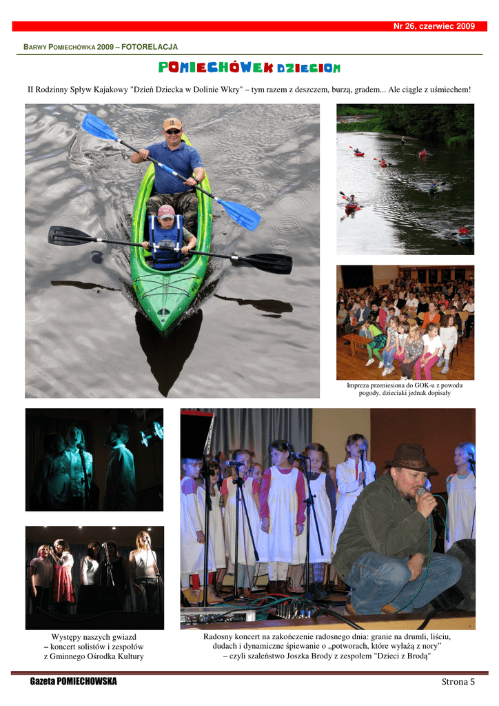 Nr 26, czerwiec 2009 BARWY POMIECHÓWKA 2009 – FOTORELACJA POMIECHÓWEK DZIECIOM II Rodzinny Spływ Kajakowy "Dzień Dziecka w Dolinie Wkry" – tym razem z deszczem, burzą, gradem... Ale ciągle z uśmiechem! Impreza przeniesiona do GOK-u z powodu pogody, dzieciaki jednak dopisały Występy naszych gwiazd – koncert solistów i zespołów z Gminnego Ośrodka Kultury Gazeta POMIECHOWSKA Radosny koncert na zakończenie radosnego dnia: granie na drumli, liściu, dudach i dynamiczne śpiewanie o „potworach, które wyłażą z nory” – czyli szaleństwo Joszka Brody z zespołem "Dzieci z Brodą" Strona 5