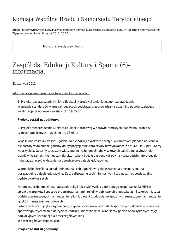 Komisja Wspólna Rządu i Samorządu Terytorialnego Źródło: http://kwrist.mswia.gov.pl/kw/kalendarium-komisji/3118,Zespol-ds-Edukacji-Kultury-i-Sportu-6-informacja.html Wygenerowano: Środa, 8 marca 2017, 15:55 Strona znajduje się w archiwum. Zespół ds. Edukacji Kultury i Sportu (6)informacja. 21 czerwca 2011 r. Informacja z posiedzenia zespołu w dniu 21 czerwca br. 1. Projekt rozporządzenia Ministra Edukacji Narodowej zmieniającego rozporządzenie w sprawie standardów wymagań będących podstawą przeprowadzania egzaminu potwierdzającego kwalifikacje zawodowe – wysłano dn. 19.05.br. Projekt został uzgodniony. 2. Projekt rozporządzenia Ministra Edukacji Narodowej w sprawie ramowych planów nauczania w szkołach publicznych – wysłano dn. 23.05.br. Wyjaśniona została kwestia: „godzin do dyspozycji dyrektora szkoły”. W ramowych planach nauczania nie zostały wymienione godziny do dyspozycji dyrektora szkoły niewynikające z art. 42 ust. 2 pkt 2 Karty Nauczyciela. Godziny te zostały włączone do liczby godzin obowiązkowych zajęć edukacyjnych dla uczniów. W ramach tych godzin dyrektor szkoły będzie dysponował pewna liczbą godzin, które będzie mógł przeznaczyć wyłącznie na obowiązkowe zajęcia edukacyjne. W projekcie określona została minimalna liczba godzin w cyklu kształcenia przeznaczona na poszczególne zajęcia edukacyjne. Za zrealizowanie tych minimalnych liczb godzin odpowiedzialny będzie dyrektor szkoły. Natomiast liczba godzin na nauczanie religii lub etyki wynika z odrębnego rozporządzenia MEN w sprawie warunków i sposobu organizowania nauki religii w publicznych przedszkolach i szkołach. Liczba godzin przeznaczonych na nauczanie religii lub etyki (podobnie jak godziny przeznaczone na: nauczanie języków mniejszości narodowych i etnicznych oraz języka regionalnego, zajęcia sportowe w oddziałach sportowych szkołach mistrzostwa sportowego, wychowania do życia w rodzinie) nie wchodzi w skład liczby godzin obowiązkowych zajęć edukacyjnych ustalonej dla poszczególnych klas w poszczególnych typach szkół. Projekt został uzgodniony. 3. Projekt rozporządzenia Ministra Edukacji Narodowej w sprawie sposobu nauczania szkolnego oraz zakresu treści dotyczących wiedzy o życiu seksualnym człowieka, o zasadach świadomego i odpowiedzialnego rodzicielstwa, o wartości rodziny, życia w fazie prenatalnej oraz metodach i środkach świadomej prokreacji zawartych w podstawie programowej kształcenia ogólnego – wysłano dn. 2.06.br. Projekt został uzgodniony. 4. Projekt rozporządzenia Ministra Sportu i Turystyki w sprawie Centralnej Ewidencji Organizatorów Turystyki i Pośredników Turystycznych – wysłano dn. 6.06.br. Projekt został uzgodniony. 5. Projekt rozporządzenia Ministra Kultury i Dziedzictwa Narodowego w sprawie organizacji oraz sposobu przeprowadzania konkursów, turniejów i olimpiad dla uczniów publicznych szkół i placówek artystycznych – wysłano dn. 23.05.br. Projekt został uzgodniony. 6. Projekt rozporządzenia Ministra Kultury i Dziedzictwa Narodowego w sprawie świadectw, dyplomów państwowych i innych druków szkolnych w publicznych szkołach i placówkach artystycznych – wysłano link 15.06.br. Projekt został uzgodniony. 7. Sprawy różne. Przedstawiciel Związku Powiatów Polskich przedstawił propozycję, by ze środków rezerwy części oświatowej subwencji ogólnej wyodrębnić fundusze z przeznaczeniem na gabinety lekarskie w szkołach. Wstecz Drukuj Generuj PDF Powiadom znajomego