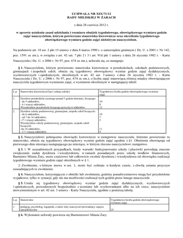 UCHWAŁA NR XIX/71/12 RADY MIEJSKIEJ W ŻARACH z dnia 28 czerwca 2012 r. w sprawie ustalenia zasad udzielania i rozmiaru obniżek tygodniowego, obowiązkowego wymiaru godzin zajęć nauczycielom, którym powierzono stanowiska kierownicze oraz określenia tygodniowego obowiązkowego wymiaru godzin zajęć niektórym nauczycielom. Na podstawie art. 18 ust. 2 pkt 15 ustawy z dnia 8 marca 1990 r. o samorządzie gminnym ( Dz. U. z 2001 r. Nr 142, poz. 1591 ze zm.), w związku z art. 42 ust. 7 pkt 2 i 3 i art. 91d pkt 1 ustawy z dnia 26 stycznia 1982 r. - Karta Nauczyciela ( Dz. U. z 2006 r. Nr 97, poz. 674 ze zm.), uchwala się, co następuje: § 1. Nauczycielom, którym powierzono stanowiska kierownicze w przedszkolach, szkołach podstawowych, gimnazjach i zespołach szkół, obniża się tygodniowy obowiązkowy wymiar godzin zajęć dydaktycznych, wychowawczych i opiekuńczych, określonych w art. 42 ust. 3 ustawy z dnia 26 stycznia 1982 r. - Karta Nauczyciela ( Dz. U. z 2006 r. Nr 97, poz. 674 ze zm.), o liczbę zajęć stanowiącą różnicę między obowiązującym nauczyciela tygodniowym wymiarem zajęć, a wymiarem określonym w następującej tabeli: L.p. Stanowiska kierowniczeTyp ( rodzaj szkoły) 1. Dyrektor przedszkola czynnego ponad 5 godzin dziennie, liczącego: - do 5 oddziałów, - 6 i więcej oddziałów, Wicedyrektor przedszkola liczącego powyżej 6 oddziałów. 2. Dyrektor szkoły podstawowej, gimnazjum, zespołu szkół liczących: - do 6 oddziałów, - od 7 do 16 oddziałów, -17 i więcej oddziałów, Wicedyrektor szkoły podstawowej, gimnazjum, zespołu szkół liczących: -do 16 oddziałów, - 17 i więcej oddziałów. Tygodniowa liczba godzin obowiązkowego wymiaru zajęć 10 8 12 10 7 3 11 9 § 2. Nauczycielowi pełniącemu obowiązki kierownicze w zastępstwie nauczyciela, któremu powierzono to stanowisko, obniża się tygodniowy obowiązkowy wymiar godzin zajęć zgodnie z §1. Obniżenie obowiązuje od pierwszego dnia miesiąca następującego po miesiącu, w którym zlecono nauczycielowi zastępstwo. § 3. 1. W uzasadnionych przypadkach, kiedy warunki funkcjonowania szkoły i placówki powodują znaczne zwiększenie zadań dyrektora i wicedyrektora, w ramach posiadanych przez szkołę środków finansowych, Burmistrz Miasta Żary, może częściowo lub całkowicie zwolnić dyrektora i wicedyrektora od obowiązku realizacji tygodniowego wymiaru godzin zajęć określonych w § 1. 2. Zwolnienie, o którym mowa w ust. 1, może być cofnięte w każdym czasie, z chwilą ustania przyczyn uzasadnijących to zwolnienie. § 4. Nauczycielom, korzystającym z obniżki lub zwolnienia, godziny ponadwymiarowe mogą być przydzielone wyjątkowo, tylko w sytuacji, gdy nie ma możliwości realizacji tych godzin przez innego nauczyciela. § 5. Ustala się tygodniowy obowiązkowy wymiar godzin zajęć dydaktycznych, wychowawczych i opiekuńczych, prowadzonych bezpośrednio z uczniami lub wychowankami albo na ich rzecz, nauczycielom niewymienionym w art. 42 ust. 3 ustawy - Karty Nauczyciela, zgodnie z poniższą tabelą: L.p. Stanowisko 1. pedagog, psycholog, logopeda, a także inny nauczyciel prowadzący zajęcia specjalistyczne § 6. Wykonanie uchwały powierza się Burmistrzowi Miasta Żary. Tygodniowa liczba godzin obowiązkowego wymiaru zajęć 25 § 7. Traci moc uchwała Nr XXIV/7/05 Rady Miejskiej w Żarach z dnia 24 lutego 2005 r. w sprawie: określenia tygodniowego wymiaru godzin zajęć pedagogów, psychologów i logopedów zatrudnionych w przedszkolach, szkołach podstawowych i gimnazjach prowadzonych przez Gminę Żary o statusie miejskim. § 8. Uchwała podlega ogłoszeniu w Dzienniku Urzędowym Województwa Lubuskiego i wchodzi w życie po upływie 14 dni od daty ogłoszenia z mocą obowiązującą od dnia 1 września 2012. Przewodniczący Rady Stanisław Krasko