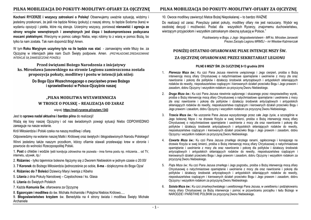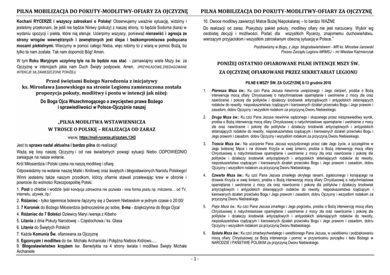 PILNA MOBILIZACJA DO POKUTY-MODLITWY-OFIARY ZA OJCZYZNĘ PILNA MOBILIZACJA DO POKUTY-MODLITWY-OFIARY ZA OJCZYZNĘ Kochani RYCERZE i wszyscy zatroskani o Polskę! Obserwujemy uważnie sytuację, widzimy i jesteśmy przekonani, że jeśli nie będzie Niniwy (pokuty) z naszej strony, to będzie Sodoma (kara) w wydaniu opozycji i piekła, które nią steruje. Ucierpimy wszyscy, ponieważ nienawiść i agresja ze strony wrogów wewnętrznych i zewnętrznych jest ślepa i bezkompromisowa podsycana mocami piekielnymi. Wierzymy w pomoc całego Nieba, więc robimy to z wiarą w pomoc Bożą, bo tylko ta nam została. Tak nam dopomóż Bóg! Amen. 10. Owoce modlitwy zawierzyć Matce Bożej Niepokalanej – to bardzo WAŻNE Do realizacji od zaraz. Powyższy pakiet pokuty, modlitwy ofiary nie jest narzucany. Wybór wg osobistej decyzji i możliwości. Podać dla wszystkich Rycerzy, znajomemu duchowieństwu, wierzącym przyjaciołom i wszystkim zatroskanym obecną sytuacją w Polsce.” Pozdrawiamy w Bogu, z Jego błogosławieństwem - MR ks. Mirosław Janowski Prezes Zarządu Legionu MRMSJ – mr Wiesław Kaźmierczak W tym Roku Maryjnym uczyńmy tyle na ile będzie nas stać - zamawiajmy wiele Mszy św. za Ojczyznę w intencjach jakie nam Duch Święty podpowie. Amen . (PRZYKŁADOWE.ZREDAGOWANE PONIŻEJ OSTATNIO OFIAROWANE PILNE INTENCJE MSZY ŚW. ZA OJCZYZNĘ OFIAROWANE PRZEZ SEKRETARIAT LEGIONU INTENCJE SĄ ZAMIESZCZONE PONIŻEJ) Przed świętami Bożego Narodzenia z inicjatywy ks. Mirosława Janowskiego na stronie Legionu zamieszczona została propozycja pokuty, modlitwy i postu w intencji jak niżej: PILNE 6 MSZY ŚW. ZA OJCZYZNĘ 8-13 grudnia 2016 1. Pierwsza Msza św.: Ku czci Pana Jezusa niewinnie uwięzionego i Jego cierpień, prośba o Bożą interwencję mocą ofiary Chrystusowej o natychmiastowe opamiętanie i uwolnienie z mocy zła oraz nawrócenie i pokorę dla polityków i działaczy środowisk antyrządowych i antypolskich skłaniających rodaków do rewolty, nieposłuszeństwa rządzącym i kierowanych działań przeciwko Bogu i Jego prawom i zasadom, dobru Ojczyzny i wszystkim rodakom za przyczyną Dworu Niebieskiego. 2. Druga Msza św.: Ku czci Pana Jezusa niewinnie sądzonego i skazanego przez niesprawiedliwy wyrok, prośba o Bożą interwencję mocą ofiary Chrystusowej o natychmiastowe opamiętanie i uwolnienie z mocy zła oraz nawrócenie i pokorę dla polityków i działaczy środowisk antyrządowych i antypolskich skłaniających rodaków do rewolty, nieposłuszeństwa rządzącym i kierowanych działań przeciwko Bogu i Jego prawom i zasadom, dobru Ojczyzny i wszystkim rodakom za przyczyną Dworu Niebieskiego. 3. Trzecia Msza św.: Na uczczenie Pana Jezusa wyszydzonego przez całe Jego życie, a szczególnie w Jego bolesnej Męce i na drzewie Krzyża w swej śmierci, prośba o Bożą interwencję mocą ofiary Chrystusowej o natychmiastowe opamiętanie i uwolnienie z mocy zła oraz nawrócenie i pokorę dla polityków i działaczy środowisk antyrządowych i antypolskich skłaniających rodaków do rewolty, nieposłuszeństwa rządzącym i kierowanych działań przeciwko Bogu i Jego prawom i zasadom, dobru Ojczyzny i wszystkim rodakom za przyczyną Dworu Niebieskiego. 4. Czwarta Msza św.: Ku czci Pana Jezusa zmarłego okrytego ranami, ogołoconego i konającego na drzewie Krzyża w swej śmierci, prośba o Bożą interwencję mocą ofiary Chrystusowej o natychmiastowe opamiętanie i uwolnienie z mocy zła oraz nawrócenie i pokorę dla polityków i działaczy środowisk antyrządowych i antypolskich skłaniających rodaków do rewolty, nieposłuszeństwa rządzącym i kierowanych działań przeciwko Bogu i Jego prawom i zasadom, dobru Ojczyzny i wszystkim rodakom za przyczyną Dworu Niebieskiego. 5. Piąta Msza św.: Ku czci Pana Jezusa zmarłego i Jego pogrzebu, prośba o Bożą interwencję mocą ofiary Chrystusowej o natychmiastowe opamiętanie i uwolnienie z mocy zła oraz nawrócenie i pokorę dla polityków i działaczy środowisk antyrządowych i antypolskich skłaniających rodaków do rewolty, nieposłuszeństwa rządzącym i kierowanych działań przeciwko Bogu i Jego prawom i zasadom, dobru Ojczyzny i wszystkim rodakom za przyczyną Dworu Niebieskiego. 6. Szósta Msza św.: Ku czci zmartwychwstałego i uwielbionego Pana Jezusa, w uwielbieniu i podziękowaniu mocą ofiary Chrystusowej za Bożą interwencje i pomoc w przywróceniu porządku i ładu Bożego w NARODZIE I PAŃSTWIE POLSKIM za przyczyną Dworu Niebieskiego. Do Boga Ojca Wszechmogącego o zwycięstwo prawa Bożego i sprawiedliwości w Polsce-Ojczyźnie naszej „PILNA MODLITWA WSTAWIENNICZA W TROSCE O POLSKĘ – REALIZACJA OD ZARAZ więcej: https://mali-rycerze.pl/czytam,1343 Jest to sprawa nadal aktualna i bardzo pilna do realizacji! Ważą się losy naszej Ojczyzny i od nas świadomych powagi sytuacji Niebo ODPOWIEDNIO zareaguje na nasze wołanie. Król Miłosierdzia i Polski czeka na naszą modlitwę i ofiarę. Odpowiedzmy na wołanie naszej Matki i Królowej oraz świętych i błogosławionych Narodu Polskiego! Winni jesteśmy także naszym przodkom, którzy ofiarnie stawali przelewając krew w obronie i powrocie do wolności Rzeczpospolitej Polski. 1. Post o chlebie i wodzie /jeśli kondycja zdrowotna nie pozwala - inna forma postu np. milczenia… od TV, internetu, używek, itp./ 2. Różaniec - tylko tajemnice bolesne /łączymy się z Dworem Niebieskim w jednym czasie o 20:00/ 3. 7 Koronek do Bożego Miłosierdzia /jednocześnie po sobie, 8-ma - dziękczynna do Boga Ojca/ 4. Różaniec do 7 Boleści Dziewicy Maryi /wersja z Kibeho 5. Litania z dnia Pokuty Narodowej – Częstochowa / ks. Glasa 6. Litania do Świętych Polskich 7. Każda Komunia Św. ofiarowana za Ojczyznę 8. Egzorcyzm i modlitwa do św. Michała Archanioła i Potężna Niebios Królowo..... 9. Błogosławieństwo krzyżem św. Benedykta na 4 strony świata i modlitwa Święty Michale Archaniele -1- PILNA MOBILIZACJA DO POKUTY-