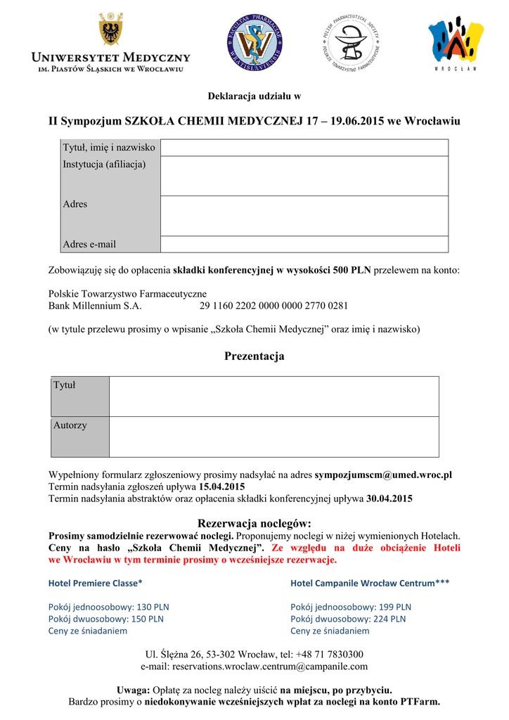 Deklaracja udziału w II Sympozjum SZKOŁA CHEMII MEDYCZNEJ 17 – 19.06.2015 we Wrocławiu Tytuł, imię i nazwisko Instytucja (afiliacja) Adres Adres e-mail Zobowiązuję się do opłacenia składki konferencyjnej w wysokości 500 PLN przelewem na konto: Polskie Towarzystwo Farmaceutyczne Bank Millennium S.A. 29 1160 2202 0000 0000 2770 0281 (w tytule przelewu prosimy o wpisanie „Szkoła Chemii Medycznej” oraz imię i nazwisko) Prezentacja Tytuł Autorzy Wypełniony formularz zgłoszeniowy prosimy nadsyłać na adres [email protected] Termin nadsyłania zgłoszeń upływa 15.04.2015 Termin nadsyłania abstraktów oraz opłacenia składki konferencyjnej upływa 30.04.2015 Rezerwacja noclegów: Prosimy samodzielnie rezerwować noclegi. Proponujemy noclegi w niżej wymienionych Hotelach. Ceny na hasło „Szkoła Chemii Medycznej”. Ze względu na duże obciążenie Hoteli we Wrocławiu w tym terminie prosimy o wcześniejsze rezerwacje. Hotel Premiere Classe* Hotel Campanile Wrocław Centrum*** Pokój jednoosobowy: 130 PLN Pokój dwuosobowy: 150 PLN Ceny ze śniadaniem Pokój jednoosobowy: 199 PLN Pokój dwuosobowy: 224 PLN Ceny ze śniadaniem Ul. Ślężna 26, 53-302 Wrocław, tel: +48 71 7830300 e-mail: [email protected] Uwaga: Opłatę za nocleg należy uiścić na miejscu, po przybyciu. Bardzo prosimy o niedokonywanie wcześniejszych wpłat za noclegi na konto PTFarm.