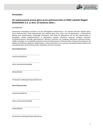 Formularz do wykonywania prawa głosu przez pełnomocnika na NWZ Lubelski Węgiel BOGDANKA S.A. w dniu 12 kwietnia 2016 r. ZASTRZEŻENIE Stosowanie niniejszego formularza nie jest obowiązkiem Akcjonariusza i nie stanowi warunku oddania głosu przez Pełnomocnika. Jeżeli dopuszczalne jest oddanie głosu przy użyciu kart do głosowania, a Pełnomocnik głosuje przy wykorzystaniu niniejszego formularza, jako karty do głosowania (co nie jest dopuszczalne w przypadku uchwał podejmowanych w głosowaniu tajnym), powinien doręczyć niniejszy formularz Przewodniczącemu Walnego Zgromadzenia. Niniejszy formularz nie zastępuje dokumentu pełnomocnictwa. Spółka zastrzega, że w przypadku posłużenia się przez Akcjonariusza i Pełnomocnika niniejszym formularzem nie będzie weryfikowana zgodność oddania głosu z treścią instrukcji w nim zawartej. Decydujące będzie oddanie lub nie oddanie głosu przez Pełnomocnika niezależnie od treści instrukcji. Dane Akcjonariusza ……………………………………………………………. Imię/nazwisko/firma ……………………………………………………………. Adres zamieszkania/siedziby ……………………………………………………………. PESEL/REGON ……………………………………………………………. Nr dowodu osobistego/innego dokumentu Dane Pełnomocnika ……………………………………………………………. Imię/nazwisko/firma ……………………………………………………………. Adres zamieszkania/siedziby ……………………………………………………………. PESEL/REGON ……………………………………………………………. Nr dowodu osobistego/innego dokumentu 1 Poniżej zamieszczone zostały projekty uchwał. Przy wybranych projektach uchwał Akcjonariusz wydaje instrukcję poprzez wstawienie „X” w odpowiednim polu. Projekty uchwał zawarte w niniejszym formularzu mogą różnić się od projektów uchwał poddanych pod głosowanie na Zwyczajnym Walnym Zgromadzeniu. W celu uniknięcia wątpliwości dotyczących sposobu głosowania Pełnomocnika wskazane jest określenie przez Akcjonariusza w uchwale „Inne” na końcu niniejszego formularza szczegółowej instrukcji dotyczącej wykonywania lub niewykonywania prawa głosu przez Pełnomocnika w powyższej sytuacji. W przypadku gdy Akcjonariusz podejmie decyzję o głosowaniu odmiennie z posiadanych akcji, proszony jest o wskazanie w odpowiedniej rubryce liczby akcji oraz odpowiednio liczby głosów, z których Pełnomocnik ma głosować „za”, „przeciw” lub ma „wstrzymać się od głosu”. W przypadku braku wskazania liczby akcji uznaje się, że Pełnomocnik upoważniony jest do głosowania we wskazany sposób z wszystkich akcji posiadanych przez Akcjonariusza, chyba że instrukcja wskazuje głosowanie odmienne z posiadanych akcji – wówczas formularz nie będzie brany pod uwagę w danym głosowaniu i uwzględniany w jego wynikach. 2 - Projekt – Uchwała Nr …. NADZWYCZAJNEGO WALNEGO ZGROMADZENIA LUBELSKIEGO WĘGLA „BOGDANKA” SPÓŁKA AKCYJNA z dnia 12.04.2016 r. w sprawie: wyboru Przewodniczącego Nadzwyczajnego Walnego Zgromadzenia §1 Działając na podstawie art. 409 § 1 Kodeksu spółek handlowych oraz § 8 Regulaminu Walnego Zgromadzenia, Nadzwyczajne Walne Zgromadzenie Lubelskiego Węgla BOGDANKA S.A. z siedzibą w Bogdance wybiera Pana/Panią ………………………………… na Przewodniczącego Walnego Zgromadzenia. §2 Uchwała wchodzi w życie z dniem podjęcia. Instrukcja Akcjonariusza dla Pełnomocnika: głos za …………………………………………(liczba akcji)* …………………………………………(liczba głosów) głos przeciw …………………………………...( liczba akcji)* …………………………………………(liczba głosów) wstrzymuję się ………………………………...( liczba akcji)* …………………………………………(liczba głosów) według uznania pełnomocnika ………………..( liczba akcji)* …………………………………………(liczba głosów) zgłaszam sprzeciw*: Treść sprzeciwu: ……………………………………………………………………………..………………………………………… * prosimy o zaznaczenie odpowiedniej rubryki: X Akcjonariusz: ……………………………………………………………………………. (podpis/y) Pełnomocnik: ……………………………………………………………………………. (podpis/y) 3 - Projekt – Uchwała Nr …. NADZWYCZAJNEGO WALNEGO ZGROMADZENIA LUBELSKIEGO WĘGLA „BOGDANKA” SPÓŁKA AKCYJNA z dnia 12.04.2016 r. w sprawie: przyjęcia porządku obrad Nadzwyczajnego Walnego Zgromadzenia §1 Nadzwyczajne Walne Zgromadzenie Lubelskiego Węgla BOGDANKA S.A. z siedzibą w Bogdance przyjmuje porządek obrad Nadzwyczajnego Walnego Zgromadzenia w następującym brzmieniu: 1) Otwarcie Walnego Zgromadzenia. 2) Wybór Przewodniczącego Walnego Zgromadzenia. 3) Stwierdzenie prawidłowości zwołania Walnego Zgromadzenia oraz jego zdolności do podejmowania uchwał. 4) Przyjęcie porządku obrad. 5) Podjęcie uchwał w sprawie zmiany Statutu. 6) Wolne wnioski. 7) Zamknięcie obrad Walnego Zgromadzenia. §2 Uchwała wchodzi w życie z dniem podjęcia. 4 Instrukcja Akcjonariusza dla Pełnomocnika: głos za …………………………………………(liczba akcji)* …………………………………………(liczba głosów) głos przeciw …………………………………...( liczba akcji)* …………………………………………(liczba głosów) wstrzymuję się ………………………………...( liczba akcji)* …………………………………………(liczba głosów) według uznania pełnomocnika ………………..( liczba akcji)* …………………………………