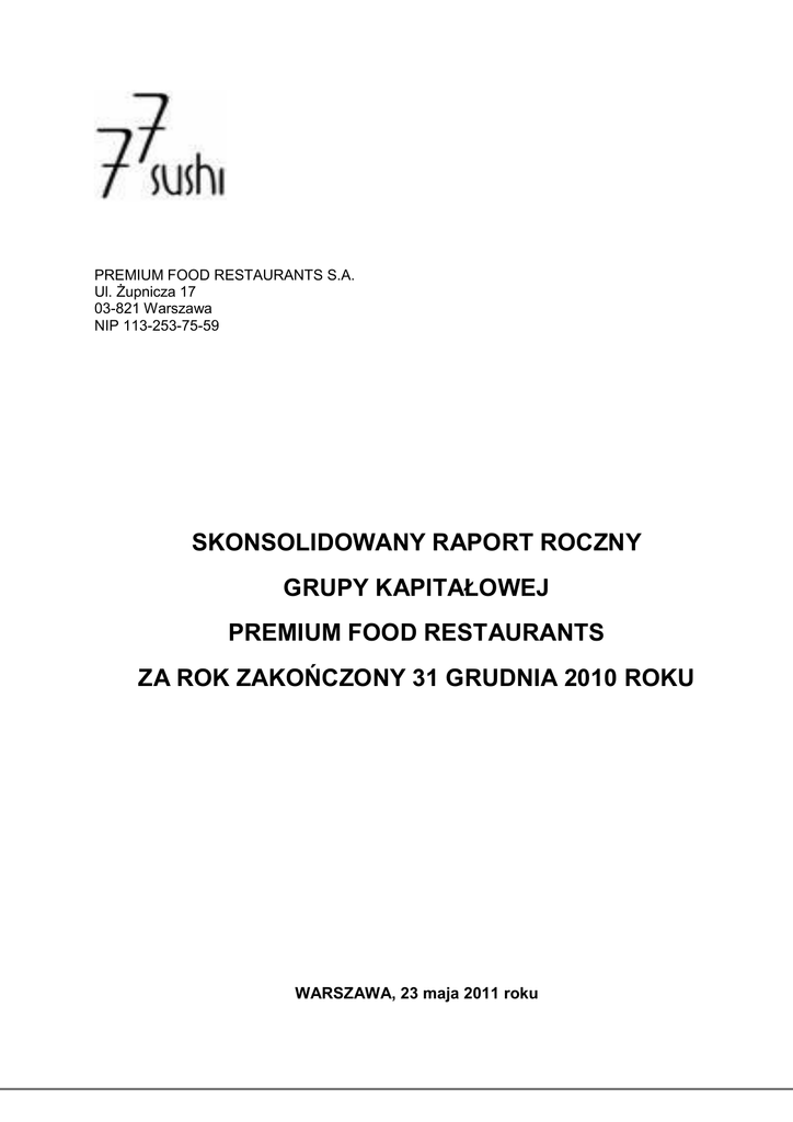 PREMIUM FOOD RESTAURANTS S.A. Ul. Żupnicza 17 03-821 Warszawa NIP 113-253-75-59 SKONSOLIDOWANY RAPORT ROCZNY GRUPY KAPITAŁOWEJ PREMIUM FOOD RESTAURANTS ZA ROK ZAKOŃCZONY 31 GRUDNIA 2010 ROKU WARSZAWA, 23 maja 2011 roku 1 SKONSOLIDOWANY RAPORT ROCZNY GRUPY KAPITAŁOWEJ PREMIUM FOOD RESTAURANTS za rok zakończony 31 grudnia 2010 roku SPIS TREŚCI A. LIST ZARZĄDU EMITENTA DO AKCJONARIUSZY .............................................................................. 3 B. WYBRANE DANE FINANSOWE............................................................................................................. 5 C. SKONSOLIDOWANE SPRAWOZDANIE FINANSOWE ......................................................................... 6 I. WPROWADZENIE DO SKONSOLIDOWANEGO SPRAWOZDANIA FINANSOWEGO................. 6 II. SKONSOLIDOWANY BILANS ....................................................................................................... 17 III. SKONSOLIDOWANY RACHUNEK ZYSKÓW I STRAT (wariant porównawczy) .......................... 19 IV. ZESTAWIENIE ZMIAN W SKONSOLIDOWANYM KAPITALE WŁASNYM .................................. 21 V. SKONSOLIDOWANE SPRAWOZDANIE Z PRZEPŁYWU ŚRODKÓW PIENIĘŻNYCH .............. 22 VI. DODATKOWE INFORMACJER I OBJAŚNIENIA. ......................................................................... 23 D. SPRAWOZDANIE ZARZĄDU EMITENTA Z DZIAŁALNOŚCI GRUPY ZA ROK 2010 ........................ 35 E. OŚWIADCZENIA ZARZĄDU EMITENTA.............................................................................................. 48 2 SKONSOLIDOWANY RAPORT ROCZNY GRUPY KAPITAŁOWEJ PREMIUM FOOD RESTAURANTS za rok zakończony 31 grudnia 2010 roku A. LIST ZARZĄDU EMITENTA DO AKCJONARIUSZY I) LIST ZARZĄDU DO AKCJONARIUSZY Szanowni Państwo! Przekazujemy Państwu raport roczny Grupy Kapitałowej Premium Food Restaurants za rok 2010. Rok 2010 był wyjątkowym wyzwaniem dla Grupy, biorąc pod uwagę dający się odczuć globalny kryzys ekonomiczny, a także oddziaływanie nowo otwartych konkurencyjnych restauracji sushi. Dodatkowym czynnikiem który miał wpływ na wynik finansowy była długa zima. Zgodnie z przewidywaniami firm eksperckich konsumenci ograniczyli wydatki na gastronomię, czego efektem było zmniejszenie przychodów z poszczególnych lokali w stosunku do roku poprzedniego. Biorąc pod uwagę powyższe Zarząd Jednostki Dominującej koncentrował się na działaniach pozwalających na zwiększanie przychodów, a także poprawę rentowności spółek Grupy. Zarząd renegocjował umowy z dostawcami produktów i usług, przeprowadził optymalizację kosztów zatrudnienia oraz kosztów zakupu surowców. Ponadto, chcąc umocnić pozycję swojej marki i dotrzeć do nowych klientów spółki Grupy poniosła duże koszty związane z reklamą i promocją. Dzięki podjętym działaniom rok 2010 okazał się lepszy niż rok 2009 pod względem wyników finansowych. Na koniec 2010 roku zanotowano stratę netto w wysokości 385 895,70 zł. Wśród dominujących czynników mających wpływ na wynik finansowy był znaczący spadek przychodów ze sprzedaży oraz koszty utrzymania trzech nowych lokali. Dodatkowym jednorazowym zdarzeniem mającym wpływ na wynik okresu sprawozdawczego był przegrany spór sądowy, którego koszt wyniósł 79 000 zł. Pomimo powyższych negatywnych czynników Grupie udało się znacznie poprawić rentowność stosunku do roku poprzedniego. Sprzedaż netto utrzymała się na podobnym poziomie. Realizowana przez Zarząd Emitenta strategia zakłada dalszy rozwój sieci poprzez otwieranie nowych restauracji w atrakcyjnych lokalizacjach, przy jednoczesnej poprawie rentowności działających już punktów. W chwili oddawania niniejszego raportu w Państwa ręce znamy już wyniki I kwartału 2011 roku. Zysk netto na poziomie 302 757 zł. potwierdza, iż obrana przez Zarząd strategia, przynosi spodziewane efekty. Biorąc powyższe pod uwagę ufamy, iż wybrany przez Zarząd kierunek działań będzie gwarantem wzrostu przychodów, uzyskania pozytywnego wyniku w 3 SKONSOLIDOWANY RAPORT ROCZNY GRUPY KAPITAŁOWEJ PREMIUM FOOD RESTAURANTS za rok zakończony 31 grudnia 2010 roku 2011 roku, a przede wszystkim umacniania pozycji spółek Grupy Kapitałowej Premium Food Restaurants. Korzystając z okazji chcemy podziękować Pracownikom za zaangażowanie, członkom Rady Nadzorczej Emitenta za wsparcie, Partnerom Biznesowym za współpracę, a Akcjonariuszom za okazane zaufanie. Mamy nadzieję, że raport ten będzie dla Państwa wyczerpującym źródłem informacji o działalności Grupy Kapitałowej w 2010 roku. Z poważaniem, Warszawa, 23 maja 2011 r. ZARZĄD SPÓŁKI: ________________________ Aleksandra Gawrylak Członek Zarządu ________________________ Artur Winiarski Członek Zarządu 4 SKONSOLIDOWANY RAPORT ROCZNY GRUPY KAPITAŁOWEJ PREMIUM FOOD RESTAURANTS za rok zakończony 31 grudnia 2010 roku B. WYBRANE DANE FINANSOWE Dane bilansowe przeliczono według średniego kursu ogłoszonego przez Prezesa NBP na dzień sporządzenia sprawozdania finansowego, który na dzień bilansowy wynosił: na dzień 31/12/2009- 4,1082 zł/ EUR, na dzień 31/12/2010- 3,9603 zł/ EUR. Dane rachunku zysków i strat oraz rachunku przepływów pieniężnych przeliczono na EURO według kursu ustalonego jako średnia arytmetyczna średnich kursów ogłaszanych przez Prezesa NBP na ostatni dzień każdego miesiąca roku: za rok 2009- 4,3406 zł/ EUR, za rok 2010- 4,4004 zł/ EUR. GRUPA PFR 2010 2009 PLN Przychody netto ze sprzedaży produktów towarów i materiałów 2010 2009 EUR 11 554 587,13 11 969 089,58 2 885 502,79 2 757 447,05 Wynik na sprzedaży -131 909,25 -372 122,04 -32 941,42 -85 729,73 Zysk /strata netto -385 895,70 -670 979,84 -96 368,92 -154 580,80 55 993,40 491 690,46 13 983,11 113 275,98 -5 540,93 -656 328,97 -1 383,72 -151 205,52 -158 594,66 58 271,46 -39 605,51 13 424,62 -108 142,19 -106 367,05 -27 006,12 -24 504,91 Aktywa krótkoterminowe 872 285,34 1 097 258,56 22