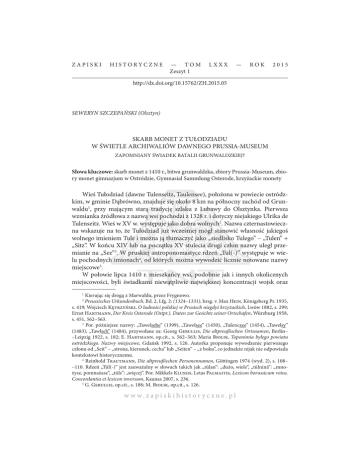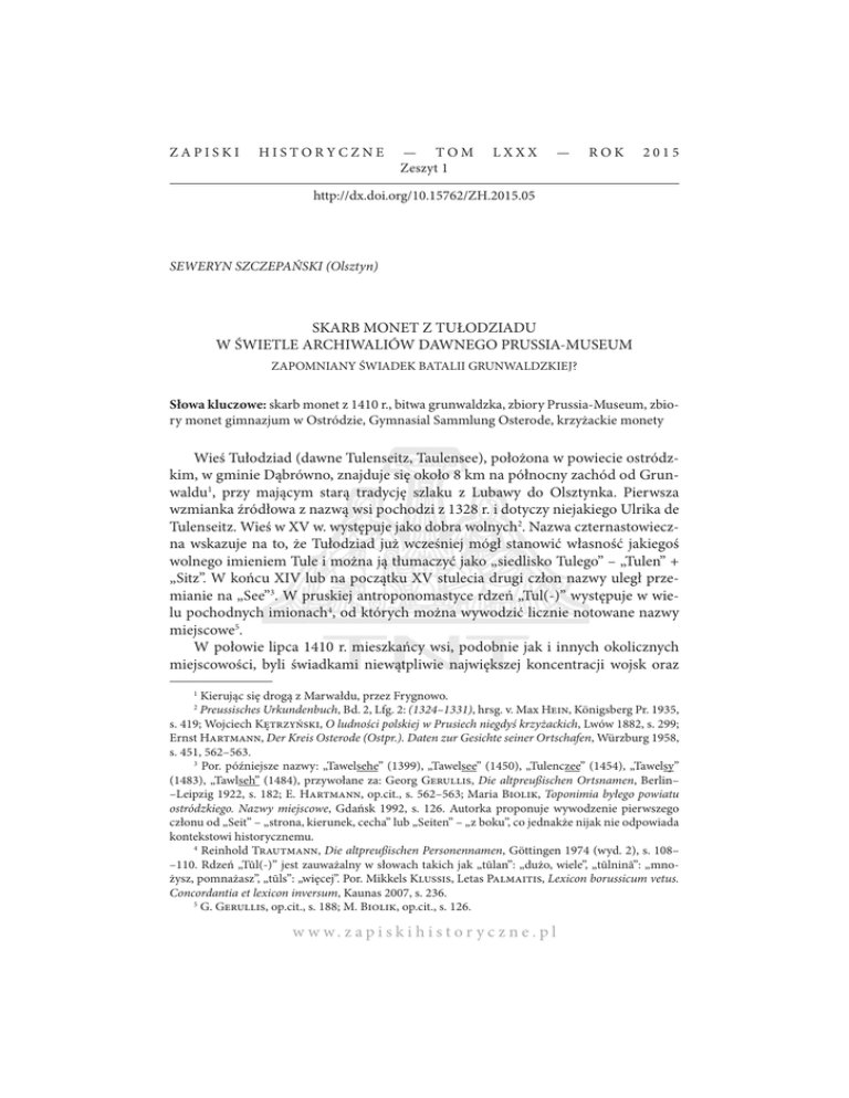 ZAPISKI HISTORYCZNE — TOM Zeszyt 1 LXXX — ROK 2015 http://dx.doi.org/10.15762/ZH.2015.05 SEWERYN SZCZEPAŃSKI (Olsztyn) SKARB MONET Z TUŁODZIADU W ŚWIETLE ARCHIWALIÓW DAWNEGO PRUSSIA-MUSEUM ZAPOMNIANY ŚWIADEK BATALII GRUNWALDZKIEJ? Słowa kluczowe: skarb monet z 1410 r., bitwa grunwaldzka, zbiory Prussia-Museum, zbiory monet gimnazjum w Ostródzie, Gymnasial Sammlung Osterode, krzyżackie monety Wieś Tułodziad (dawne Tulenseitz, Taulensee), położona w powiecie ostródzkim, w gminie Dąbrówno, znajduje się około 8 km na północny zachód od Grunwaldu1, przy mającym starą tradycję szlaku z Lubawy do Olsztynka. Pierwsza wzmianka źródłowa z nazwą wsi pochodzi z 1328 r. i dotyczy niejakiego Ulrika de Tulenseitz. Wieś w XV w. występuje jako dobra wolnych2. Nazwa czternastowieczna wskazuje na to, że Tułodziad już wcześniej mógł stanowić własność jakiegoś wolnego imieniem Tule i można ją tłumaczyć jako „siedlisko Tulego” – „Tulen” + „Sitz”. W końcu XIV lub na początku XV stulecia drugi człon nazwy uległ przemianie na „See”3. W pruskiej antroponomastyce rdzeń „Tul(-)” występuje w wielu pochodnych imionach4, od których można wywodzić licznie notowane nazwy miejscowe5. W połowie lipca 1410 r. mieszkańcy wsi, podobnie jak i innych okolicznych miejscowości, byli świadkami niewątpliwie największej koncentracji wojsk oraz Kierując się drogą z Marwałdu, przez Frygnowo. Preussisches Urkundenbuch, Bd. 2, Lfg. 2: (1324–1331), hrsg. v. Max Hein, Königsberg Pr. 1935, s. 419; Wojciech Ktrzyski, O ludności polskiej w Prusiech niegdyś krzyżackich, Lwów 1882, s. 299; Ernst Hartmann, Der Kreis Osterode (Ostpr.). Daten zur Gesichte seiner Ortschafen, Würzburg 1958, s. 451, 562–563. 3 Por. późniejsze nazwy: „Tawelsehe” (1399), „Tawelsee” (1450), „Tulenczee” (1454), „Tawelsy” (1483), „Tawlseh” (1484), przywołane za: Georg Gerullis, Die altpreußischen Ortsnamen, Berlin– –Leipzig 1922, s. 182; E. Hartmann, op.cit., s. 562–563; Maria Biolik, Toponimia byłego powiatu ostródzkiego. Nazwy miejscowe, Gdańsk 1992, s. 126. Autorka proponuje wywodzenie pierwszego członu od „Seit” – „strona, kierunek, cecha” lub „Seiten” – „z boku”, co jednakże nijak nie odpowiada kontekstowi historycznemu. 4 Reinhold Trautmann, Die altpreußischen Personennamen, Göttingen 1974 (wyd. 2), s. 108– –110. Rdzeń „Tūl(-)” jest zauważalny w słowach takich jak „tūlan”: „dużo, wiele”, „tūlninā”: „mnożysz, pomnażasz”, „tūls”: „więcej”. Por. Mikkels Klussis, Letas Palmaitis, Lexicon borussicum vetus. Concordantia et lexicon inversum, Kaunas 2007, s. 236. 5 G. Gerullis, op.cit., s. 188; M. Biolik, op.cit., s. 126. 1 2 w w w. z a p i s k i h i s t o r y c z n e . p l 86 Seweryn Szczepański [86] największej bitwy, którą mogło zapamiętać żyjące w owym czasie pokolenie. To najpewniej przez Tułodziad bezpośrednio przed batalią grunwaldzką maszerowały wojska pod przywództwem wielkiego mistrza Ulricha von Jungingena6. Po bitwie dotarły tu z pewnością także zagony polsko-litewskie. Zagrożenie, jakie niosła za sobą obecność wrogich sobie armii na danym obszarze, często stawiało zamieszkującą go ludność przed koniecznością ucieczki oraz deponowania w sekretnych miejscach majątku ruchomego. Jednym z najbardziej wyraźnych śladów tego typu działań są skarby monet, w tym odkryty we wsi Tułodziad latem 1930 r. skarb monet krzyżackich, którego czas depozycji można wiązać właśnie z połową lipca 1410 r. Skarb monet z Tułodziadu jak dotychczas nie doczekał się szerszego opracowania, stąd też wiedza o nim jest prawie żadna. Powodem „zapomnienia” jest niewątpliwie fakt jego zaginięcia w końcowym etapie drugiej wojny światowej. Informacje o nim, oprócz krótkich wzmianek w prasie lokalnej i królewieckiej, również nie pojawiały się w znanych mi periodykach naukowych czy też powiatowych kalendarzach ostródzkich, gdzie często zamieszczano wiadomości o odkryciach, a nawet starano się w miarę dokładnie opracowywać pozyskane zabytki. Szczęśliwie wśród archiwaliów stanowiących pozostałość po Prussia-Museum w Królewcu zachowały się zarówno raporty z odkrycia skarbu, artykuły z prasy, dotycząca go skrupulatna korespondencja, jak i opis monet oraz szereg informacji dotyczących późniejszych starań podejmowanych w celu pozyskania dalszych jego części. Niestety nie zachowały się fotografie ani szkice monet. Obecnie cała dokumentacja znajduje się w archiwum Staatliche Museen zu Berlin – Preuβischer Kulturbesitz. Museum für Vor- und Frühgeschichte7. Pierwsze informacje na temat odkrycia monet krzyżackich we wsi Tułodziad ukazały się we wtorkowych wydaniach poczytnych królewieckich dzienników: „Königsberger Allgemeine Zeitung” (nr 301 z 1 VII 1930 r.) oraz „Königsberger Hartungsche Zeitung” (nr 302 z 1 VII 1930 r.). Niewątpliwie o tym fakcie musiała także pisać lokalna „Osteroder Zeitung”. Według informacji podanych przez obie królewieckie gazety odkrywcą monet był sołtys wsi August Symkowitz, który natrafił na nie podczas wydobywania torfu8. Na głębokości około 1 m miało się znajdować 30 srebrnych monet z okresu rządów wielkiego mistrza Winricha von Kniprodego. Krótka notatka informuje jednak, że owe monety staSzlak marszruty wojsk zakonnych oraz ich sprzymierzeńców mógł prowadzić w nocy lub nad ranem 15 VII 1410 r. spod Lubawy w kierunku Stębarka przez Złotowo, Napromek, Marwałd, Budzikowo, Frygnowo. Por. Krzysztof Kwiatkowski, Wyprawa letnia 1410 roku, [in:] Sławomir Jówiak, Krzysztof Kwiatkowski, Adam Szweda, Sobiesław Szybkowski, Wojna Polski i Litwy z zakonem krzyżackim w latach 1409–1411, Malbork 2010, s. 380–382. 7 Staatliche Museen zu Berlin – Preuβischer Kulturbesitz. Museum für Vor- und Frühgeschichte, Archiv der vor- und früh