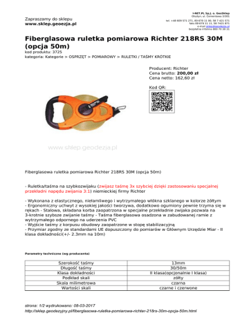 I-NET.PL Sp.J. o. GeoSklep Olsztyn, ul. Cementowa 3/301 Zapraszamy do sklepu www.sklep.geoezja.pl tel. +48 609 571 271, 89 670 11 00, 58 7 421 571 faks 89 670 11 11, 58 7421 871 e-mail [email protected] bezpłatna infolinia 800 70 30 31 Fiberglasowa ruletka pomiarowa Richter 218RS 30M (opcja 50m) kod produktu: 3725 kategoria: Kategorie > OSPRZĘT > POMIAROWY > RULETKI / TAŚMY KRÓTKIE Producent: Richter Cena brutto: 200,00 zł Cena netto: 162,60 zł Kod QR: Fiberglasowa ruletka pomiarowa Richter 218RS 30M (opcja 50m) - Ruletka/taśma na szybkozwijaku (zwijasz taśmę 3x szybciej dzięki zastosowaniu specjalnej przekładni napędu zwijania 3:1) niemieckiej firmy Richter - Wykonana z elastycznego, niełamliwego i wytrzymałego włókna szklanego w kolorze żółtym - Ergonomiczny uchwyt z wysokiej jakości tworzywa, dodatkowo ogumiony pewnie trzyma się w rękach - Stalowa, składana korba zaopatrzona w specjalne przekładnie zwijaka pozwala na 3-krotnie szybsze zwijanie taśmy - Taśma fiberglasowa osadzona w zabudowanej ramie z wytrzymałego odpornego na uderzenia PVC - Wyjście taśmy z korpusu obudowy zaopatrzone w stopę stabilizacyjną - Przymiar zgodny ze standardami UE dopuszczony do pomiarów w Głównym Urzędzie Miar - II klasa dokładności(+/- 2.3mm na 10m) Parametry techniczne (wg producenta) Szerokość taśmy Długość taśmy Klasa dokładności Podkład skali Skala milimetrowa Wartości skali 13mm 30/50m II klasa(opcjonalnie I klasa) zółty czarna czarne i czerwone strona: 1/2 wydrukowano: 08-03-2017 http://sklep.geodezyjny.pl/fiberglasowa-ruletka-pomiarowa-richter-218rs-30m-opcja-50m.html Typ A Skala podziałki "0" zaczyna się 10cm od końcówki okucia uchwytu, bez skalowania strona: 2/2 wydrukowano: 08-03-2017 http://sklep.geodezyjny.pl/fiberglasowa-ruletka-pomiarowa-richter-218rs-30m-opcja-50m.html