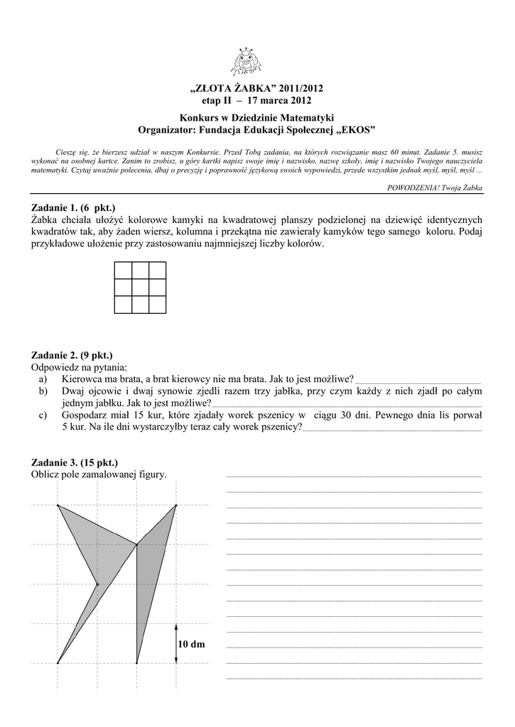 „ZŁOTA ŻABKA” 2011/2012 etap II – 17 marca 2012 Konkurs w Dziedzinie Matematyki Organizator: Fundacja Edukacji Społecznej „EKOS” Cieszę się, że bierzesz udział w naszym Konkursie. Przed Tobą zadania, na których rozwiązanie masz 60 minut. Zadanie 5. musisz wykonać na osobnej kartce. Zanim to zrobisz, u góry kartki napisz swoje imię i nazwisko, nazwę szkoły, imię i nazwisko Twojego nauczyciela matematyki. Czytaj uważnie polecenia, dbaj o precyzję i poprawność językową swoich wypowiedzi, przede wszystkim jednak myśl, myśl, myśl ... POWODZENIA! Twoja Żabka Zadanie 1. (6 pkt.) Żabka chciała ułożyć kolorowe kamyki na kwadratowej planszy podzielonej na dziewięć identycznych kwadratów tak, aby żaden wiersz, kolumna i przekątna nie zawierały kamyków tego samego koloru. Podaj przykładowe ułożenie przy zastosowaniu najmniejszej liczby kolorów. Zadanie 2. (9 pkt.) Odpowiedz na pytania: a) Kierowca ma brata, a brat kierowcy nie ma brata. Jak to jest możliwe? b) Dwaj ojcowie i dwaj synowie zjedli razem trzy jabłka, przy czym każdy z nich zjadł po całym jednym jabłku. Jak to jest możliwe? c) Gospodarz miał 15 kur, które zjadały worek pszenicy w ciągu 30 dni. Pewnego dnia lis porwał 5 kur. Na ile dni wystarczyłby teraz cały worek pszenicy? Zadanie 3. (15 pkt.) Oblicz pole zamalowanej figury. 10 dm Zadanie 4. (12 pkt.) Ile ścian, krawędzi i wierzchołków ma bryła, która powstała z sześcianu po obcięciu jej ośmiu narożników do połowy długości krawędzi? Zadanie 5. (18 pkt.) Oblicz, jaką część liczby a stanowi liczba b, jeżeli: 1 0 ,375 :2 2 3 3 a 2 i b = 0,1 0,12 0,13 0,2 0,32 0,43 : 2 25 . 3 4 1 20 1 10 ,1 505 3 Zadanie 6. (10 pkt.) Silnią (oznaczenie: n!) nazywamy iloczyn wszystkich liczb naturalnych dodatnich nie większych niż n, a pierwsznią (oznaczenie: n#) iloczyn kolejnych liczb pierwszych nieprzekraczających n. Oblicz iloraz liczb 8# i 7!. Zadanie 7. (8 pkt.) Znajdź najmniejszą liczbę naturalną złożoną, która przy dzieleniu jej przez każdą z liczb: 4, 5, 6 i 9 daje resztę 3. Zadanie 8. (10 pkt.) Poniżej znajduje się siatka sześcianu. Jakie liczby dwucyfrowe można ułożyć z cyfr leżących na przeciwległych ścianach sześcianu? Wymień je wszystkie. 8 1 7 0 2 3 Zadanie 9. (12 pkt.) 1 tej ilości. Wówczas okazało się, że w 5 sklepie pozostało o 48 kg jabłek więcej niż sprzedano. Ile kilogramów tych owoców dostarczono do sklepu? Do sklepu dostarczono pewną ilość jabłek i tego samego dnia sprzedano