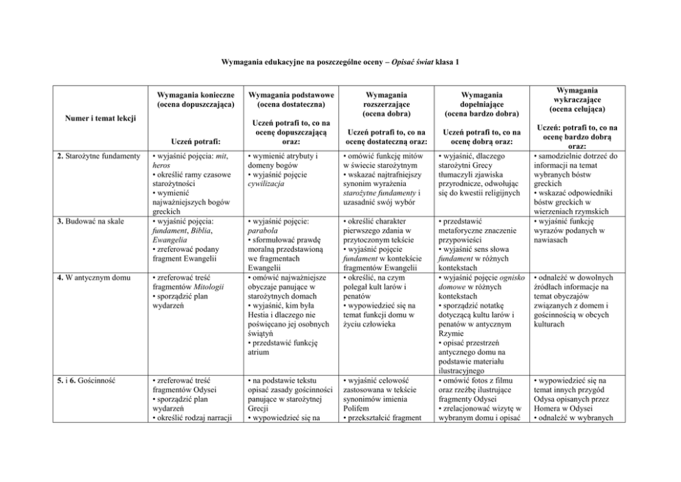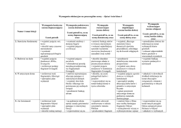 Wymagania edukacyjne na poszczególne oceny – Opisać świat klasa 1 Wymagania konieczne (ocena dopuszczająca) Wymagania podstawowe (ocena dostateczna) Uczeń potrafi: Uczeń potrafi to, co na ocenę dopuszczającą oraz: Numer i temat lekcji 2. Starożytne fundamenty 3. Budować na skale • wyjaśnić pojęcia: mit, heros • określić ramy czasowe starożytności • wymienić najważniejszych bogów greckich • wyjaśnić pojęcia: fundament, Biblia, Ewangelia • zreferować podany fragment Ewangelii 4. W antycznym domu • zreferować treść fragmentów Mitologii • sporządzić plan wydarzeń 5. i 6. Gościnność • zreferować treść fragmentów Odysei • sporządzić plan wydarzeń • określić rodzaj narracji Wymagania rozszerzające (ocena dobra) Wymagania dopełniające (ocena bardzo dobra) Uczeń potrafi to, co na ocenę dostateczną oraz: Uczeń potrafi to, co na ocenę dobrą oraz: • wymienić atrybuty i domeny bogów • wyjaśnić pojęcie cywilizacja • omówić funkcję mitów w świecie starożytnym • wskazać najtrafniejszy synonim wyrażenia starożytne fundamenty i uzasadnić swój wybór • wyjaśnić, dlaczego starożytni Grecy tłumaczyli zjawiska przyrodnicze, odwołując się do kwestii religijnych • wyjaśnić pojęcie: parabola • sformułować prawdę moralną przedstawioną we fragmentach Ewangelii • omówić najważniejsze obyczaje panujące w starożytnych domach • wyjaśnić, kim była Hestia i dlaczego nie poświęcano jej osobnych świątyń • przedstawić funkcję atrium • określić charakter pierwszego zdania w przytoczonym tekście • wyjaśnić pojęcie fundament w kontekście fragmentów Ewangelii • określić, na czym polegał kult larów i penatów • wypowiedzieć się na temat funkcji domu w życiu człowieka • na podstawie tekstu opisać zasady gościnności panujące w starożytnej Grecji • wypowiedzieć się na • wyjaśnić celowość zastosowana w tekście synonimów imienia Polifem • przekształcić fragment • przedstawić metaforyczne znaczenie przypowieści • wyjaśnić sens słowa fundament w różnych kontekstach • wyjaśnić pojęcie ognisko domowe w różnych kontekstach • sporządzić notatkę dotyczącą kultu larów i penatów w antycznym Rzymie • opisać przestrzeń antycznego domu na podstawie materiału ilustracyjnego • omówić fotos z filmu oraz rzeźbę ilustrujące fragmenty Odysei • zrelacjonować wizytę w wybranym domu i opisać Wymagania wykraczające (ocena celująca) Uczeń: potrafi to, co na ocenę bardzo dobrą oraz: • samodzielnie dotrzeć do informacji na temat wybranych bóstw greckich • wskazać odpowiedniki bóstw greckich w wierzeniach rzymskich • wyjaśnić funkcję wyrazów podanych w nawiasach • odnaleźć w dowolnych źródłach informacje na temat obyczajów związanych z domem i gościnnością w obcych kulturach • wypowiedzieć się na temat innych przygód Odysa opisanych przez Homera w Odysei • odnaleźć w wybranych • wskazać narratora • odnaleźć przysłowia dotyczące gościnności temat bohaterów przedstawionych we fragmentach eposu Homera • wyjaśnić, na czym polegał podstęp Odysa • wskazać cytat potwierdzający, że Odyseusz to najprzebieglejszy król grecki • scharakteryzować patronkę świątyni 7. Partenon – perła starożytnej architektury • wskazać na ilustracji: tympanon, fryz • zreferować najważniejsze informacje na temat Partenonu • wskazać patronkę świątyni 8. Sporządzamy notatkę • wymienić etapy tworzenia notatki 9. Dom dzieciństwa • zreferować treść wiersza • określić rodzaj liryki • stworzyć notatkę na dowolny temat według wskazówek zamieszczonych w podręczniku • określić kim jest osoba mówiąca w wierszu i do kogo się zwraca • wyjaśnić, który okres z życia człowieka przedstawia podmiot mówiący 10. Nastolatek i jego dom • zreferować przeczytany fragment • wypowiedzieć się na temat bohatera – tekstu na język współczesny • zreferować mit o wojnie trojańskiej • przytoczyć przysłowia dotyczące gościnności obowiązujące w nim zasady gościnności źródłach informacje o zasadach gościnności obowiązujące w innych kulturach dawniej i współcześnie • stworzyć mapę podróży Odysa • porównać motyw oślepienia Polifema przez Odysa w tekście literackim i rzeźbie • odnaleźć w dowolnych źródłach informacje na temat wybranych budowli starożytnych • zaprezentować na forum klasy wybraną budowlę starożytną (grecką lub rzymską) • posługiwać się terminologią w omawianiu kompozycji budowli • wyjaśnić, na czym polega harmonia na przykładzie Partenonu • sporządzić mapę myśli zawierającą najważniejsze informacje na temat Partenonu • stosować skróty przydatne do tworzenia notatki • wymienić figury geometryczne widoczne w konstrukcji budynku i wyjaśnić ich funkcję w kompozycji • przekształcić tekst ciągły w notatkę • zredagować notatkę z przeczytanej ostatnio lektury • wypowiedzieć się na temat postrzegania domu przez osobę mówiącą w wierszu • wskazać, czym jest szczęście dla podmiotu mówiącego • odnaleźć w wierszu fragmenty oddziałujące na zmysły • omówić problemy nastolatków • zinterpretować tytuł wiersza • opisać zmysłowy odbiór swojego domu • wyjaśnić znaczenie słowa kredens na podstawie dostępnych źródeł i określa, jak się zmienił sens wyrazu od czasów Tuwima • wyjaśnić, na czym polega komizm tekstu • opisać tydzień ze swojego życia formie • określić rodzaj narracji • wskazać narratora podejmowanych przez niego działań oraz ich efektów • wymienić cechy dziennika na podstawie fragmentu książki 11. Dom wiecznego wędrowca • wymienić cechy reportażu • przedstawić tematykę fragmentów reportażu Ryszarda Kapuścińskiego 12. Gdy trzeba wyruszyć w drogę • zrelacjonować treść fragmentu 
